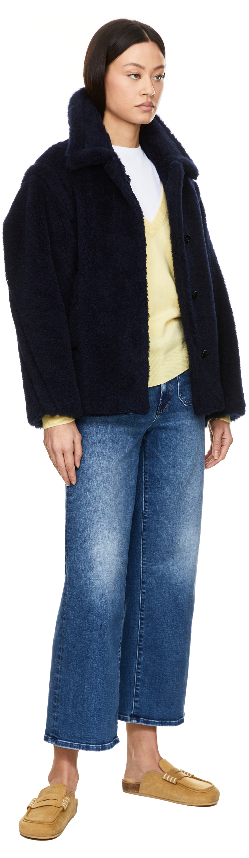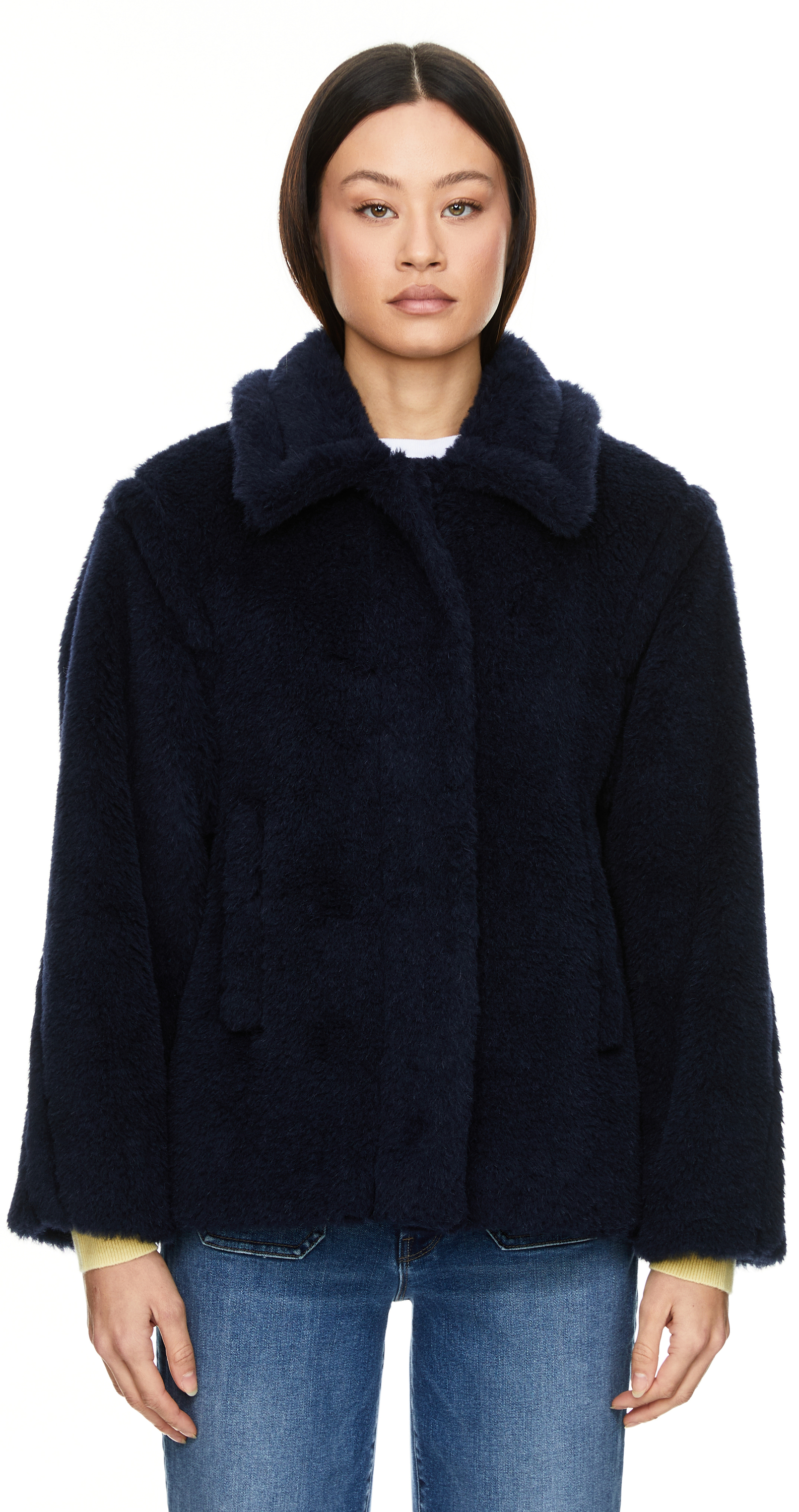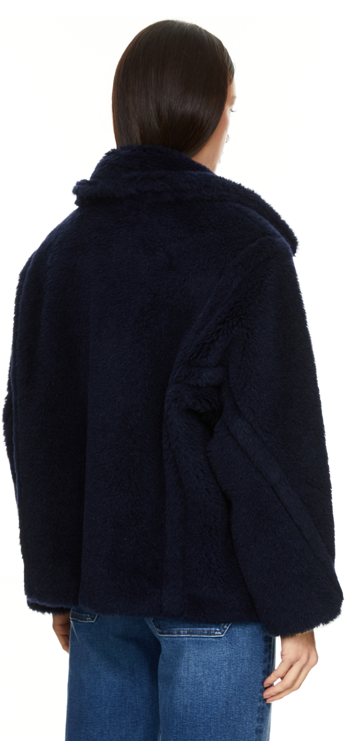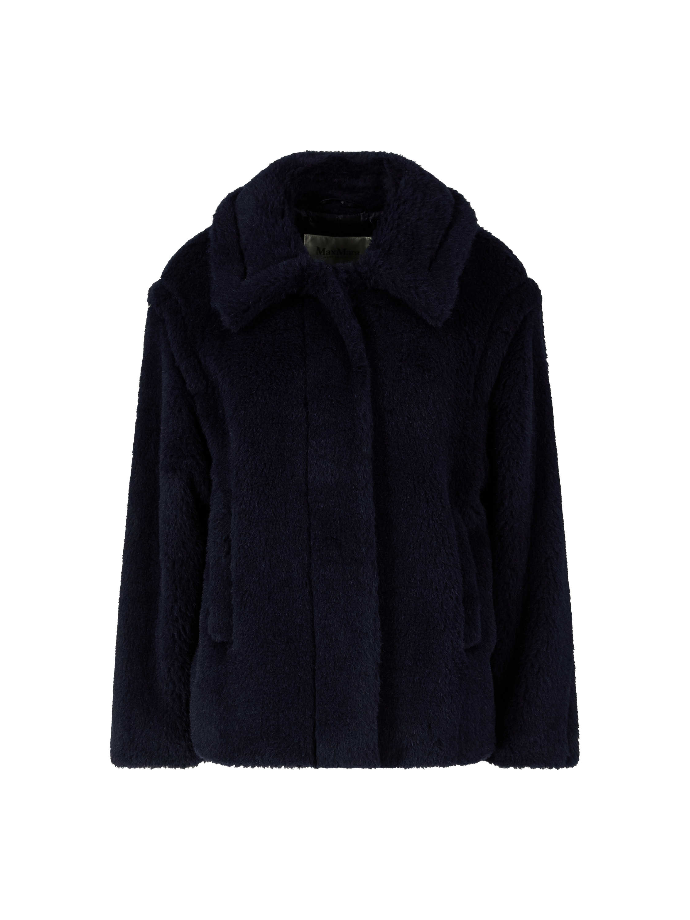 The 'Fuggito' jacket in navy blue by Max Mara is made from a high-quality blend of alpaca wool, virgin wool and silk. The boxy fit, the full-length concealed button placket and the two side slit pockets characterise this style.