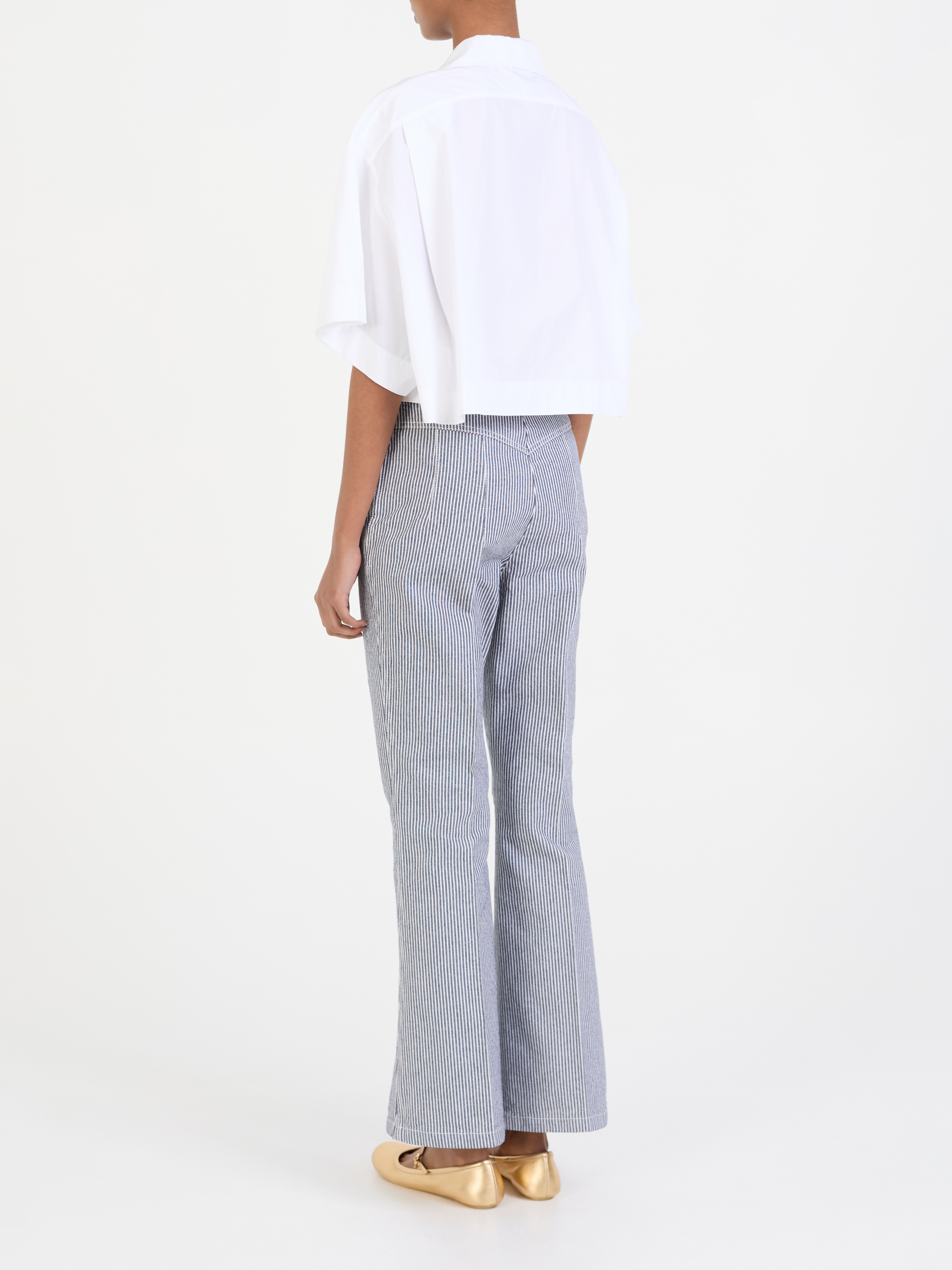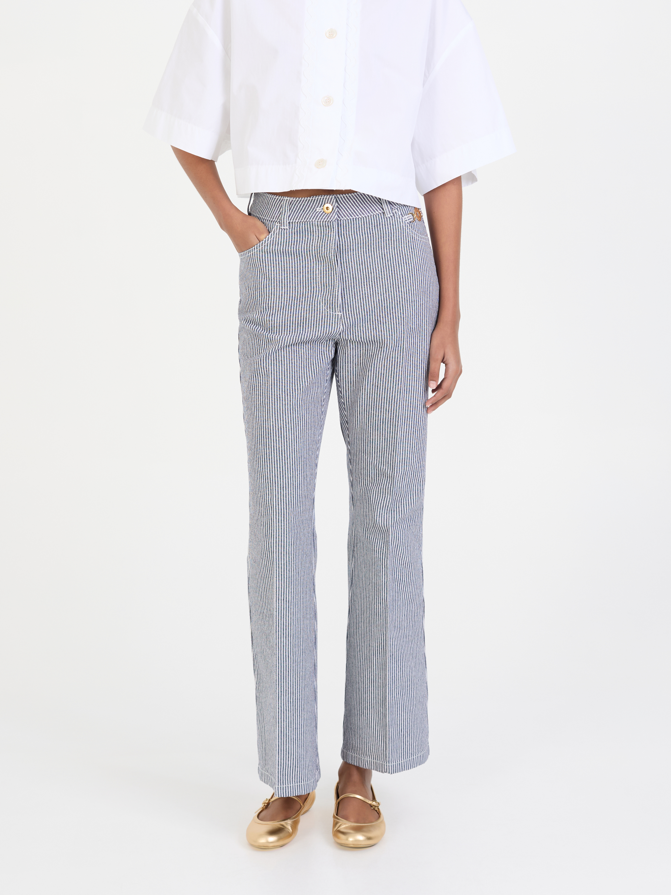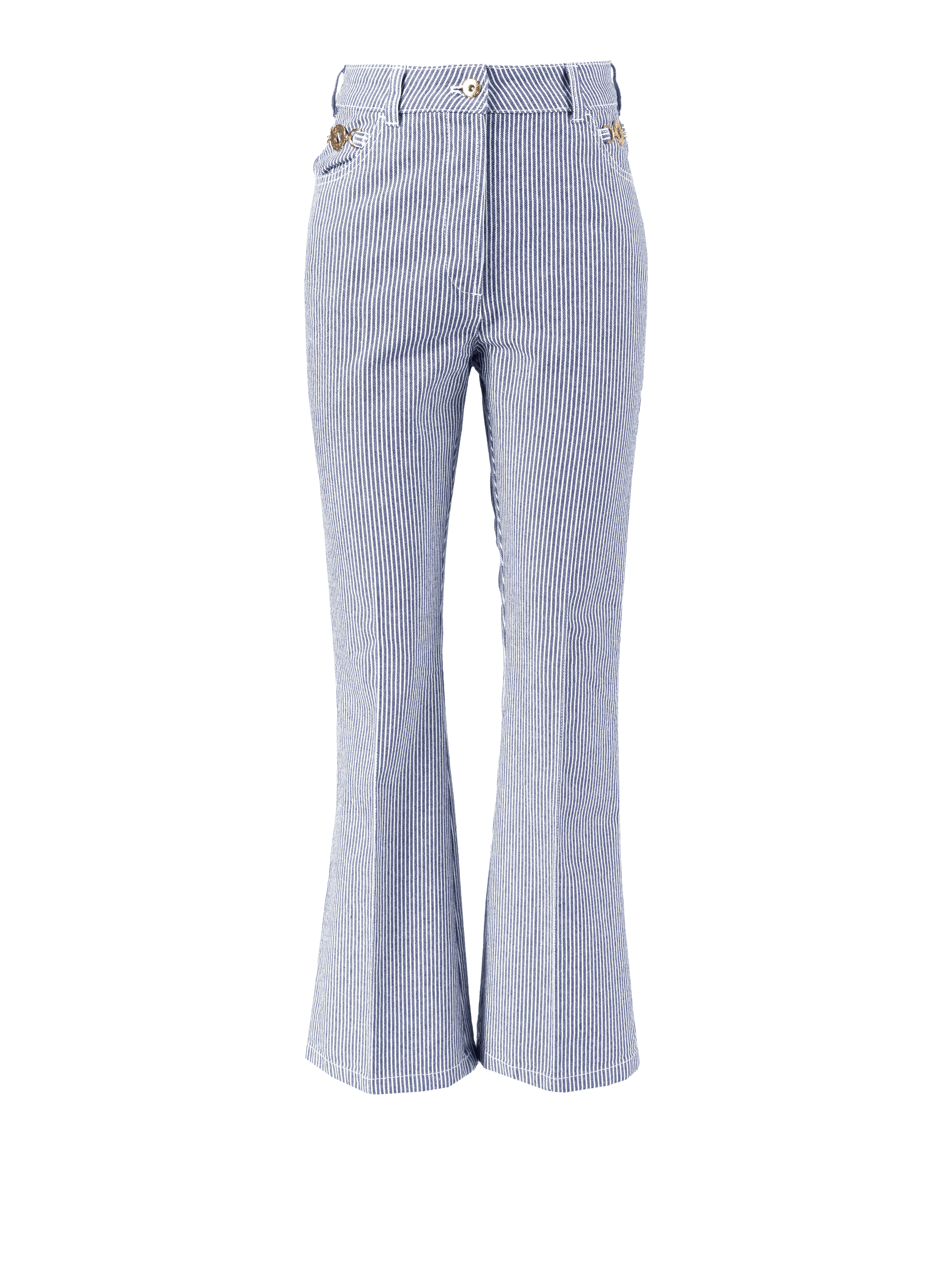 These flared-leg jeans in navy blue by PATOU are made of high-quality cotton and stand out with their striped look. The mid-rise waistband, logo ornaments and flared leg characterise the design.