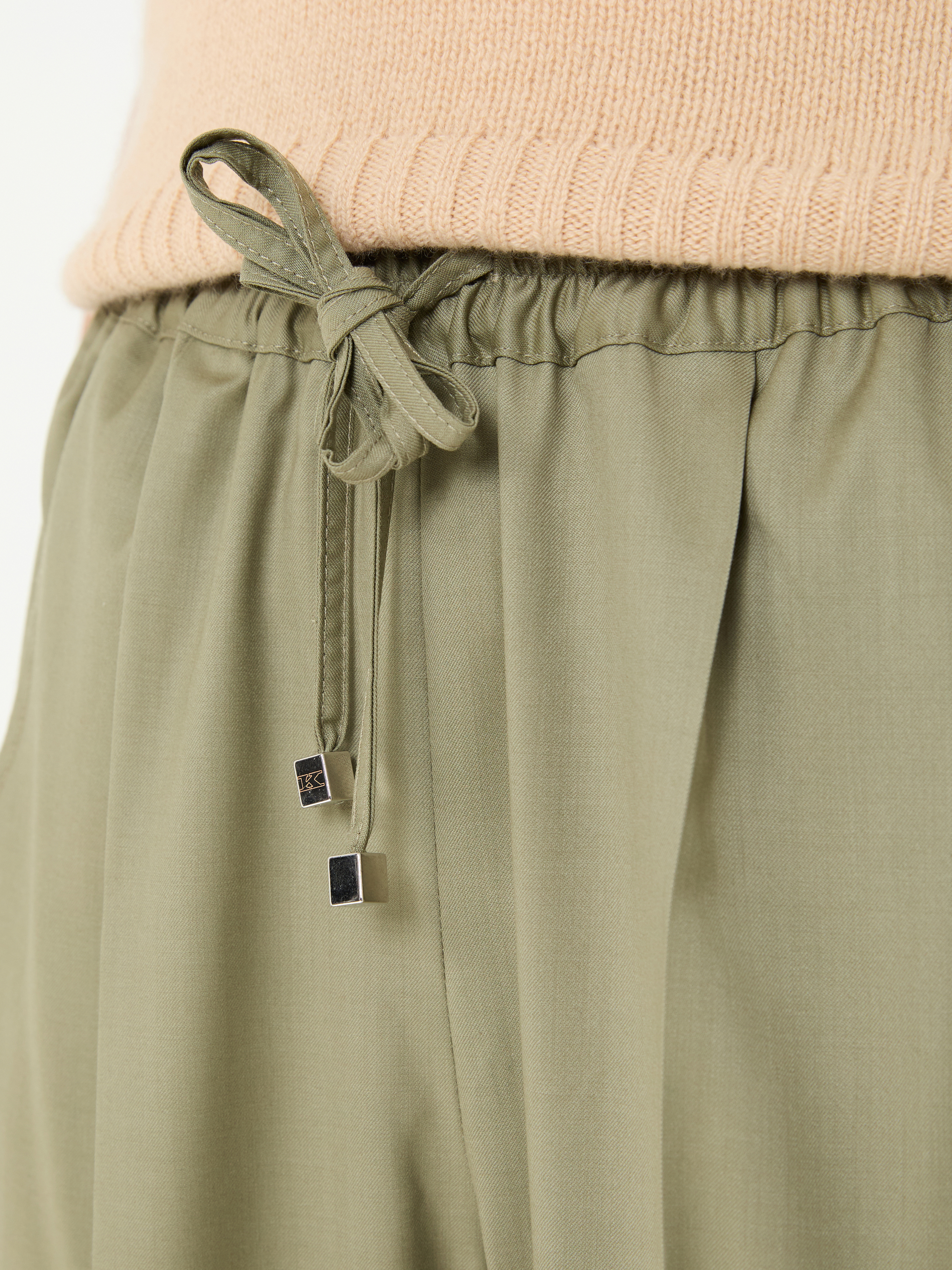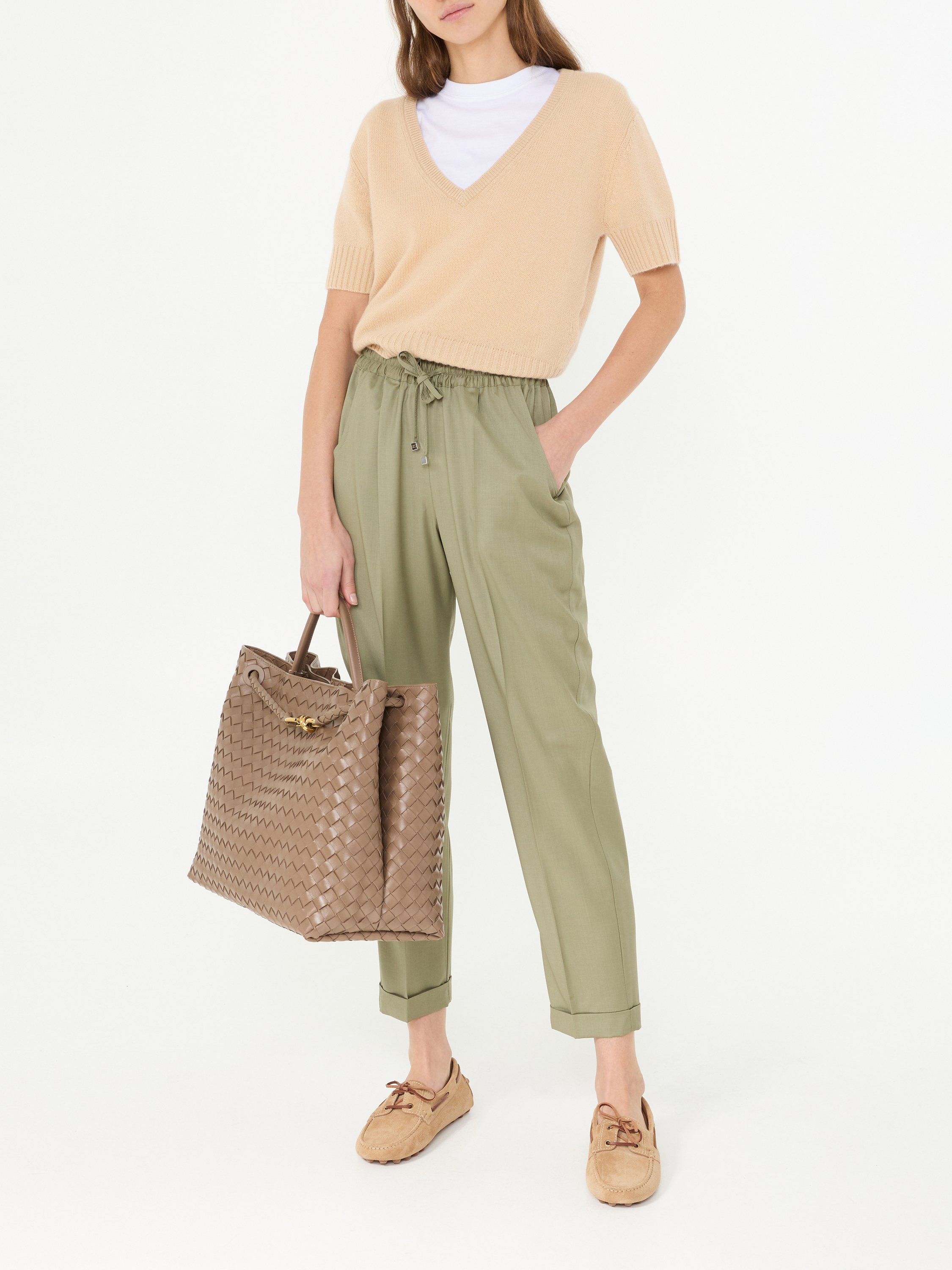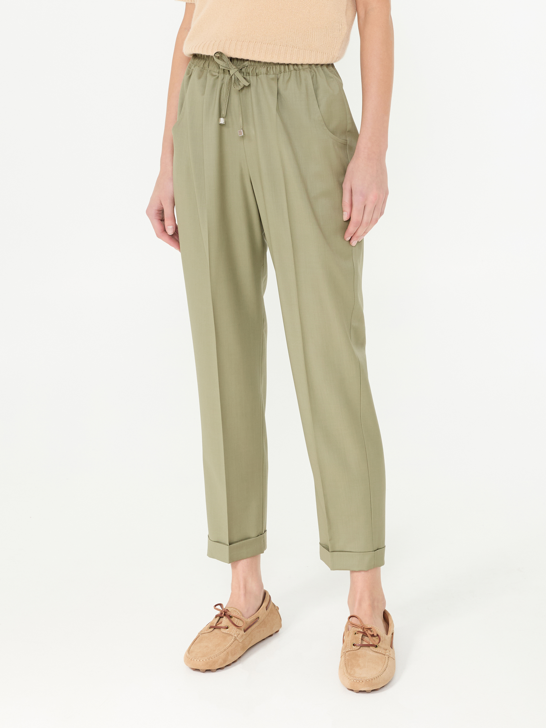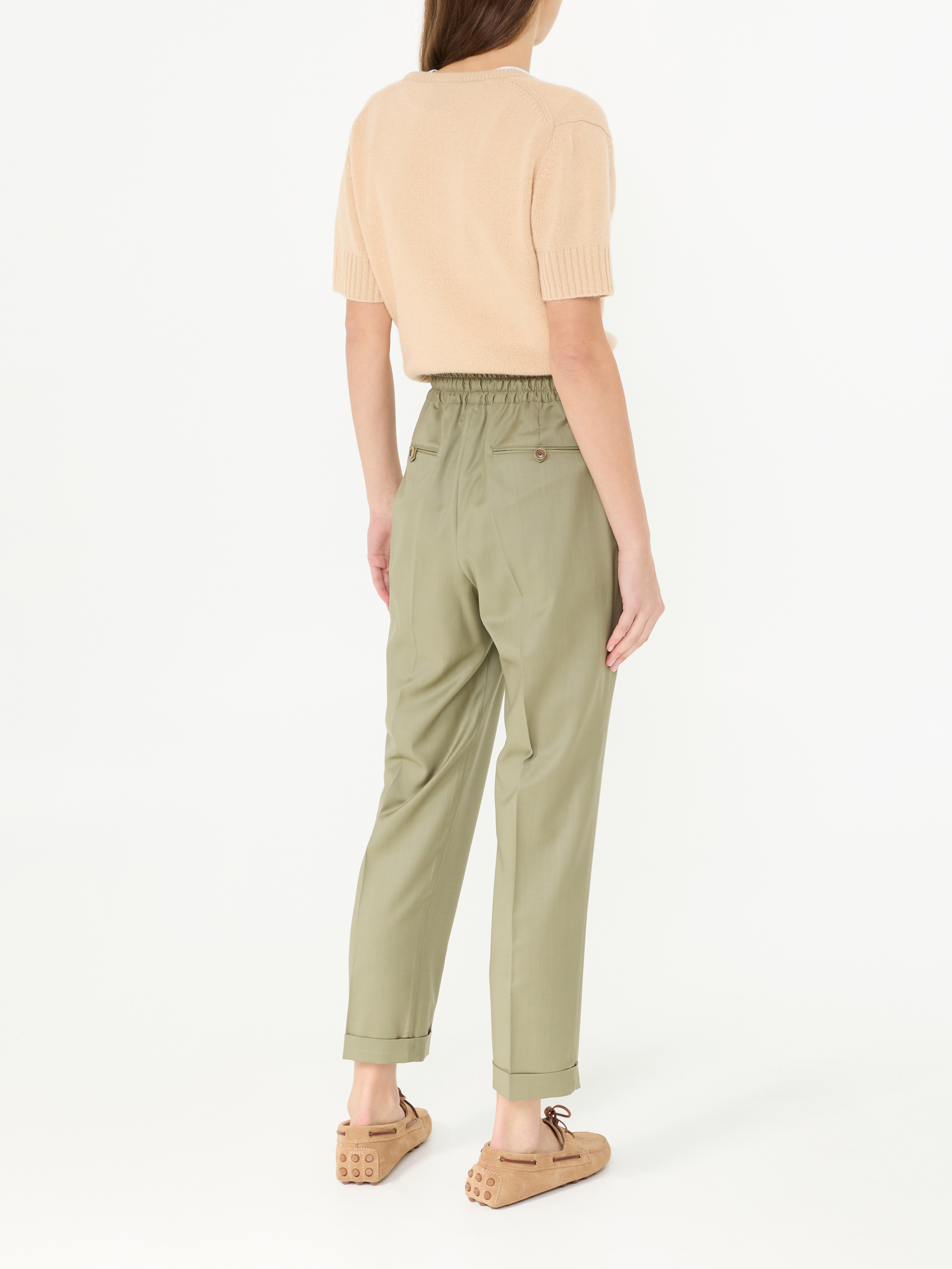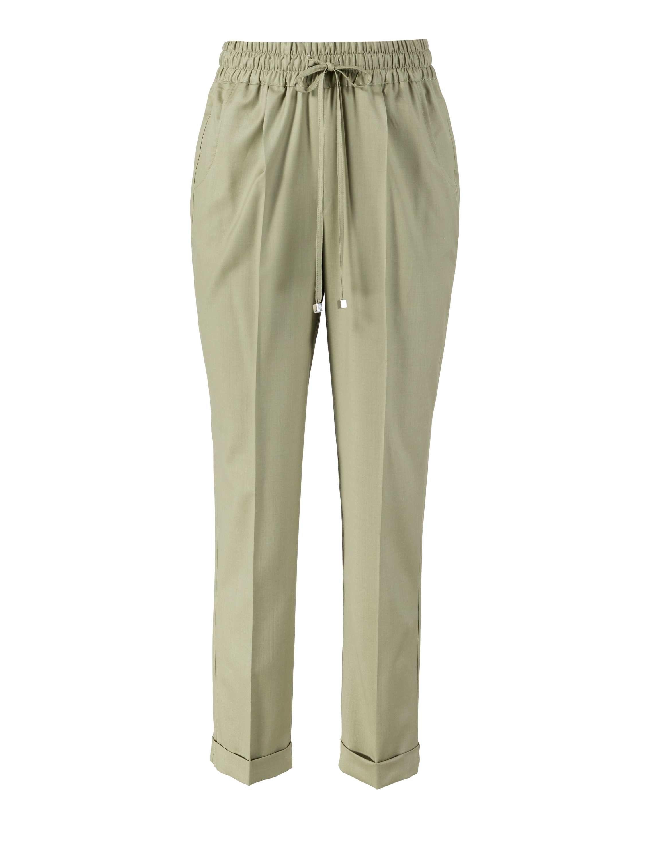 These green trousers from Kiton are made from a wool blend and boast a classic design. The creases and casual waistband with a drawstring ensure that the high-quality fabric drapes elegantly. The side slit pockets and back welt pockets with button fastening round off the design in style.