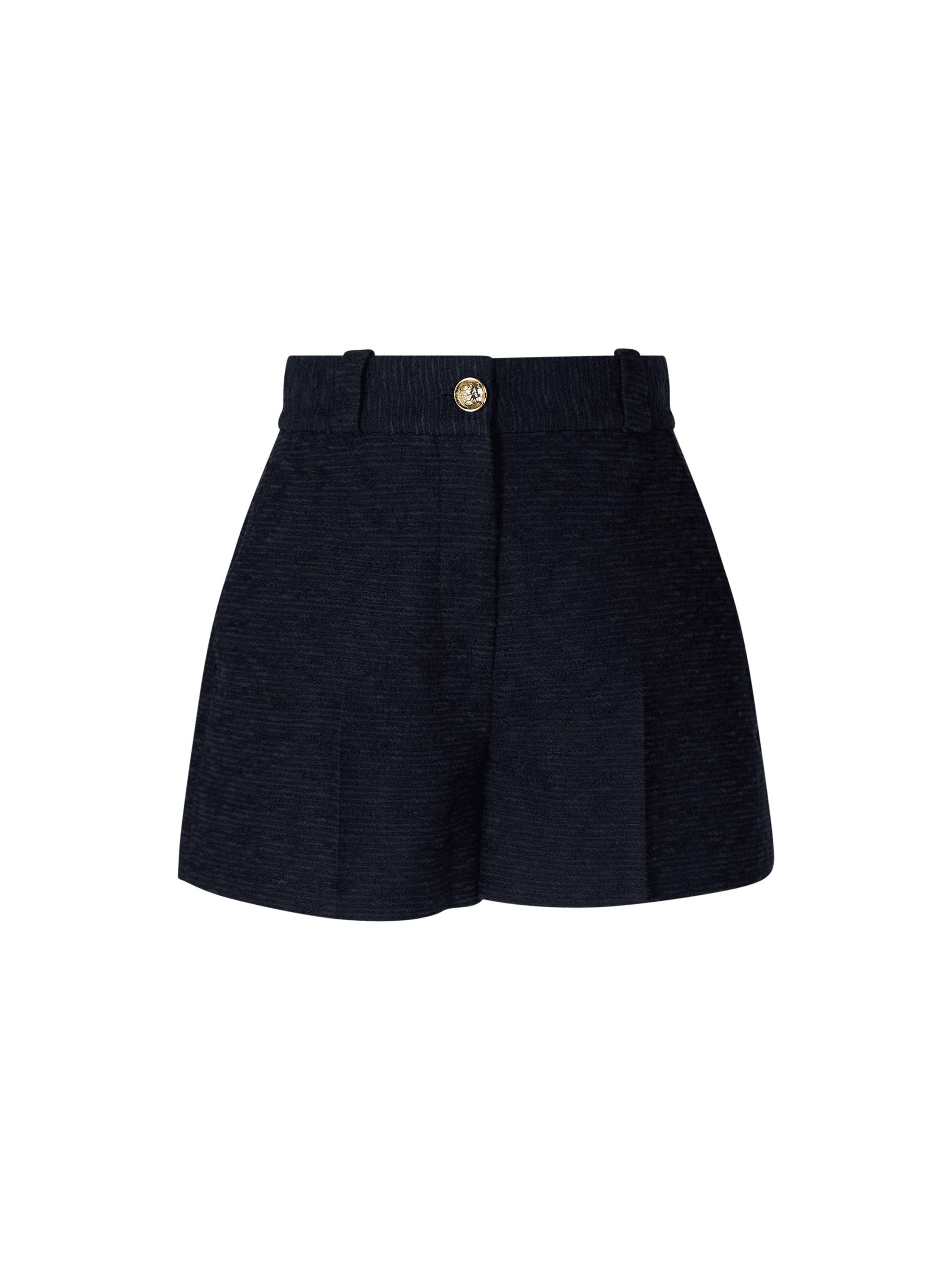 The 'Esense Teke' shorts in navy blue by Blazé Milano are made from a cotton blend and stand out with their textured tweed fabric. A striking gold-coloured button with fine brand details emphasises the elegance of the design. The high rise gives the model feminine lines and rounds it off harmoniously.