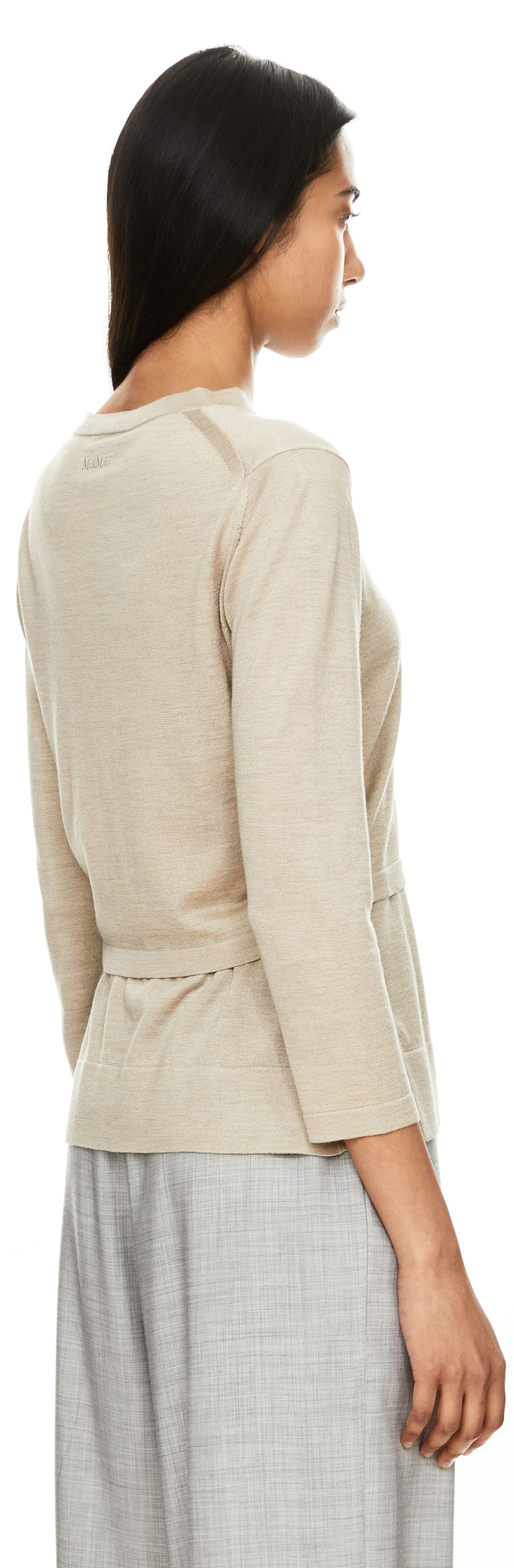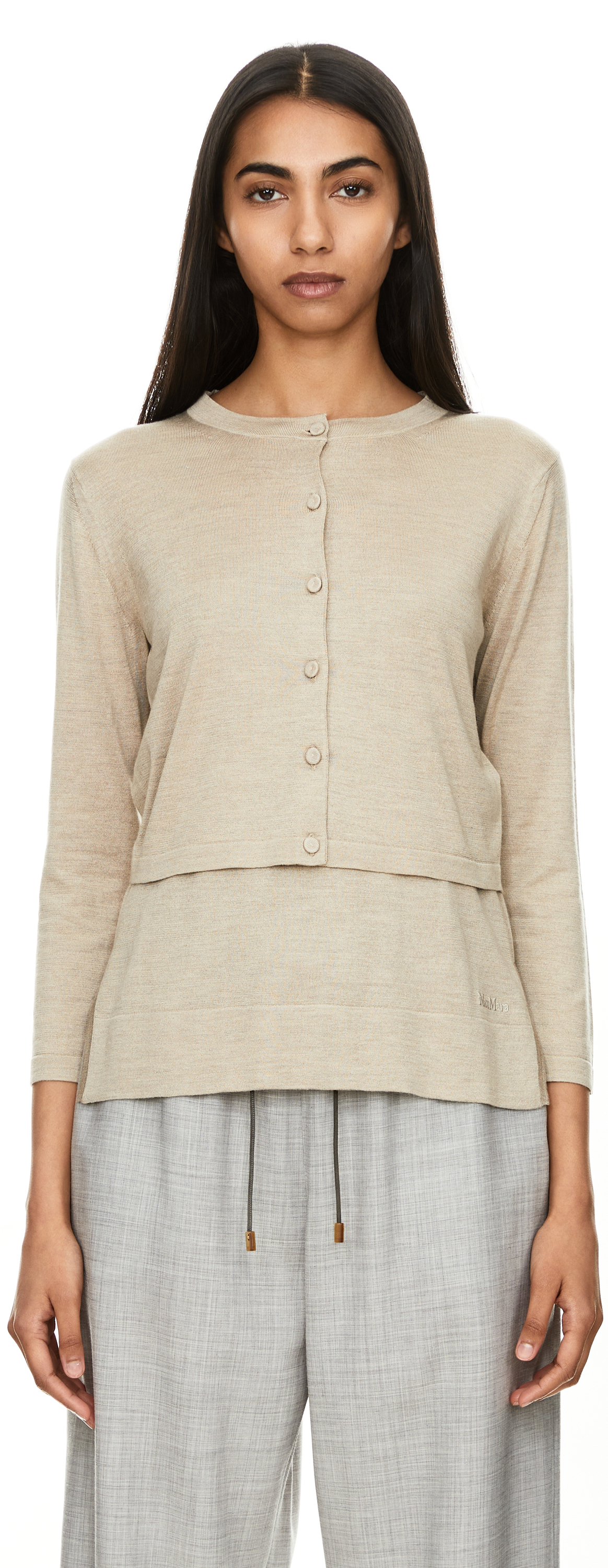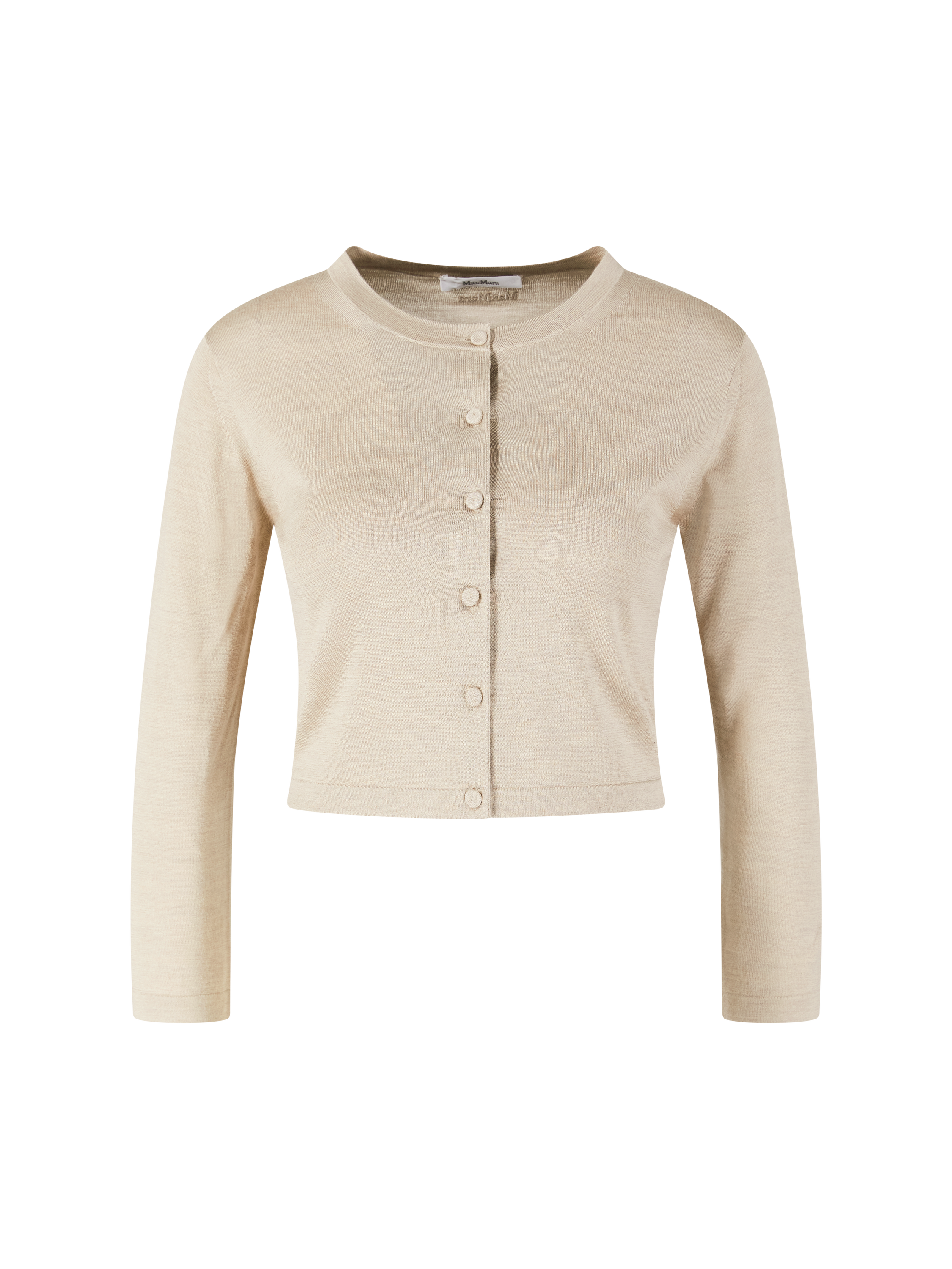 The 'Brobcio' cardigan in beige by Max Mara is made from a high-quality silk-cashmere blend and impresses with its cropped fit. The fabric-covered button placket and 3/4-length sleeves give this piece an elegant lightness. A tonal logo embroidery on the back neckline adds subtle accents and characterises this elegant style.