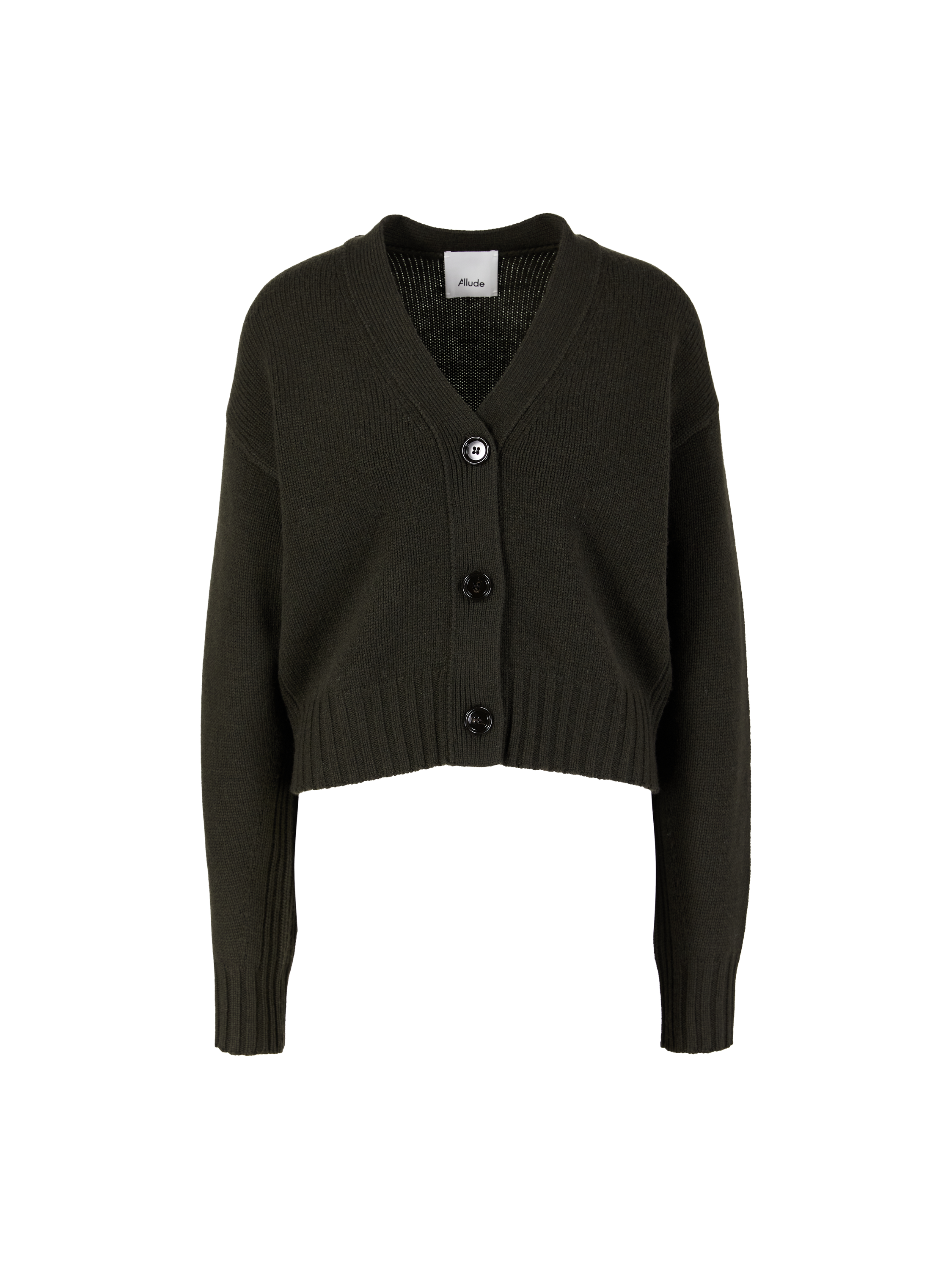 This dark green cardigan from Allude is made from a high-quality wool-cashmere blend and features a wide silhouette. The V-neckline, ribbed knit and dropped shoulders characterise this design.