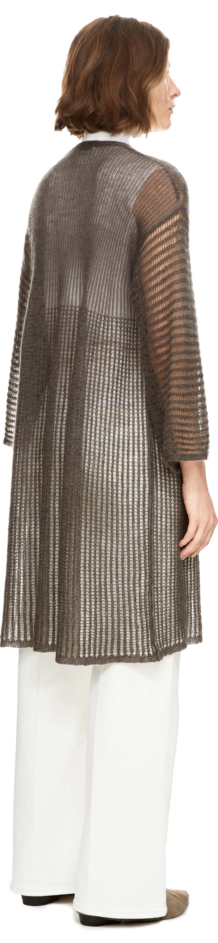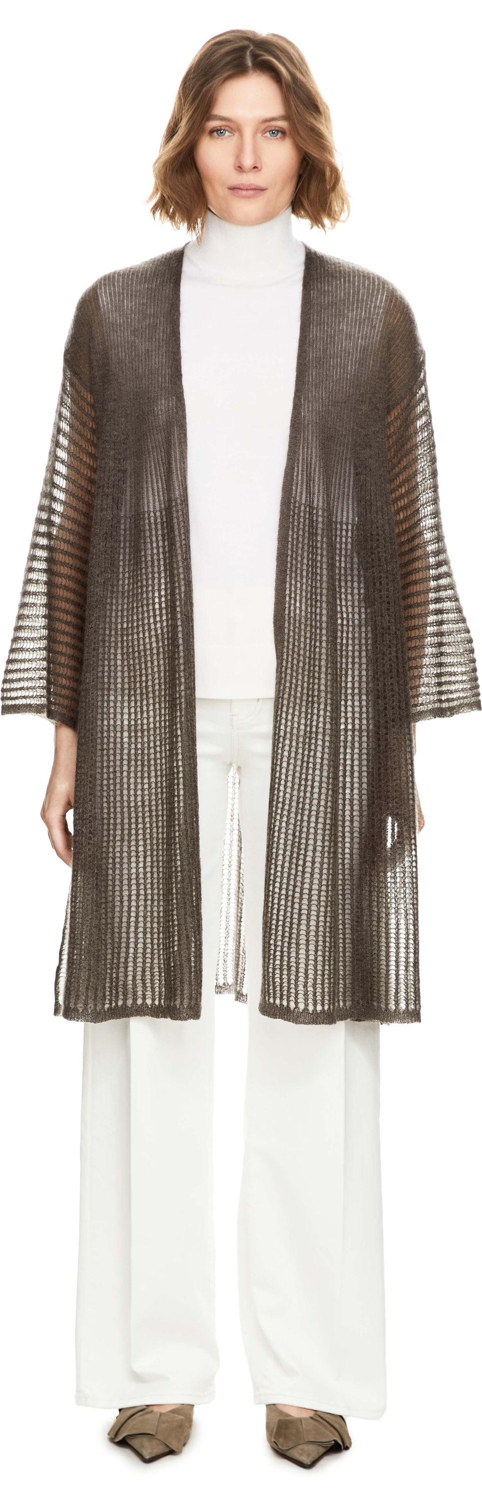 The 'Marakesch' cardigan in dark taupe by Iris von Arnim is made from a high-quality mohair blend and stands out with its long silhouette. The perforated structure, 3/4-length sleeves, open front and dropped shoulders characterise this piece.