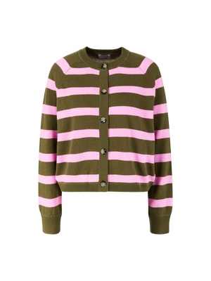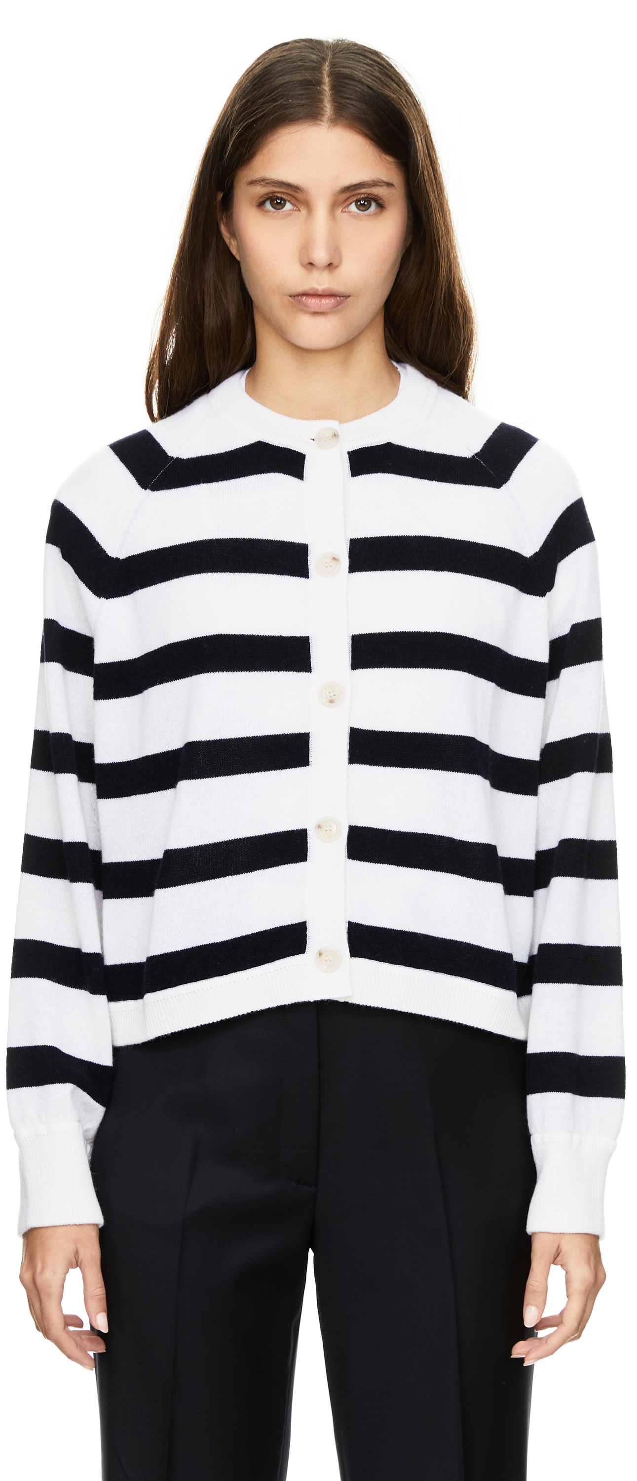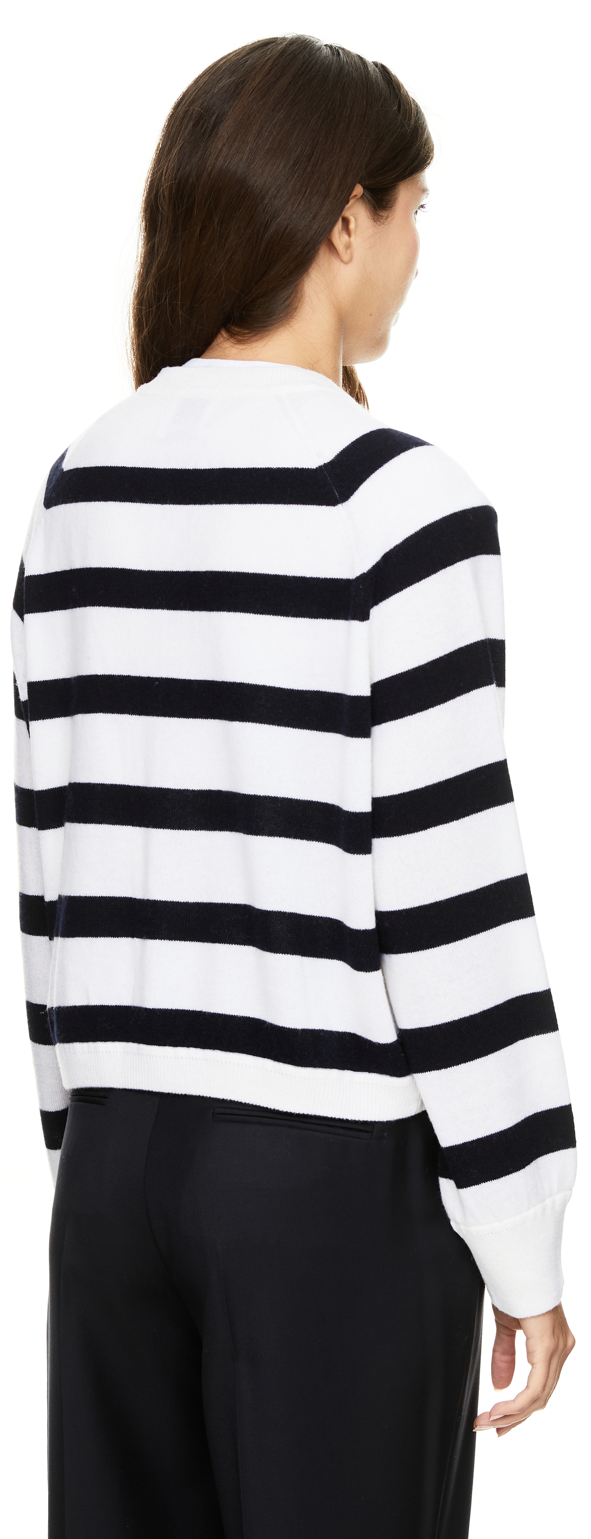This white/navy blue cardigan from Allude is made from a high-quality virgin wool and cashmere blend and features a striking striped pattern. The straight silhouette, raglan sleeves and classic button placket give this piece a modern yet timeless look. The ribbed knit cuffs and round neckline round off the design harmoniously.