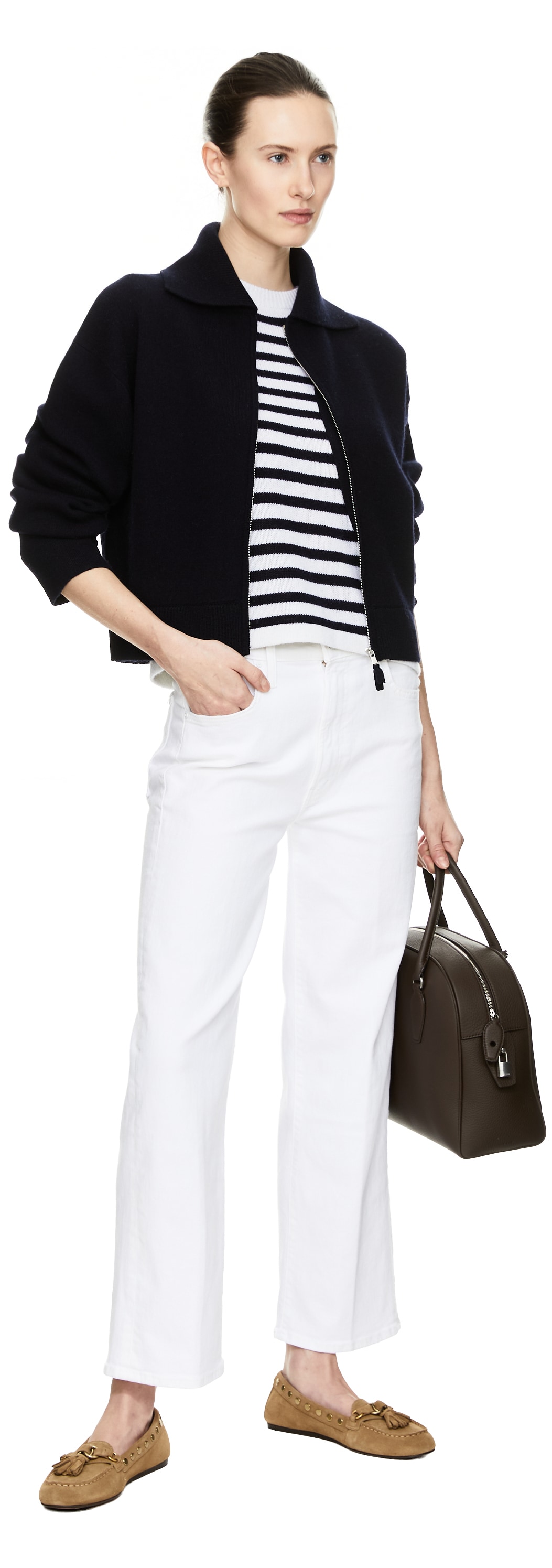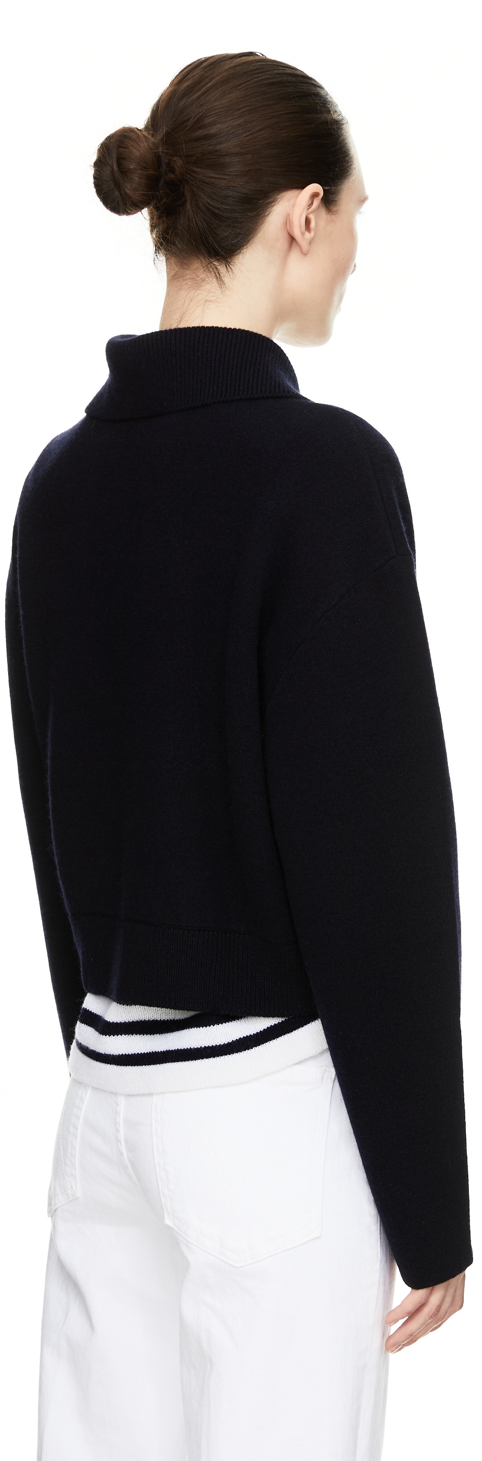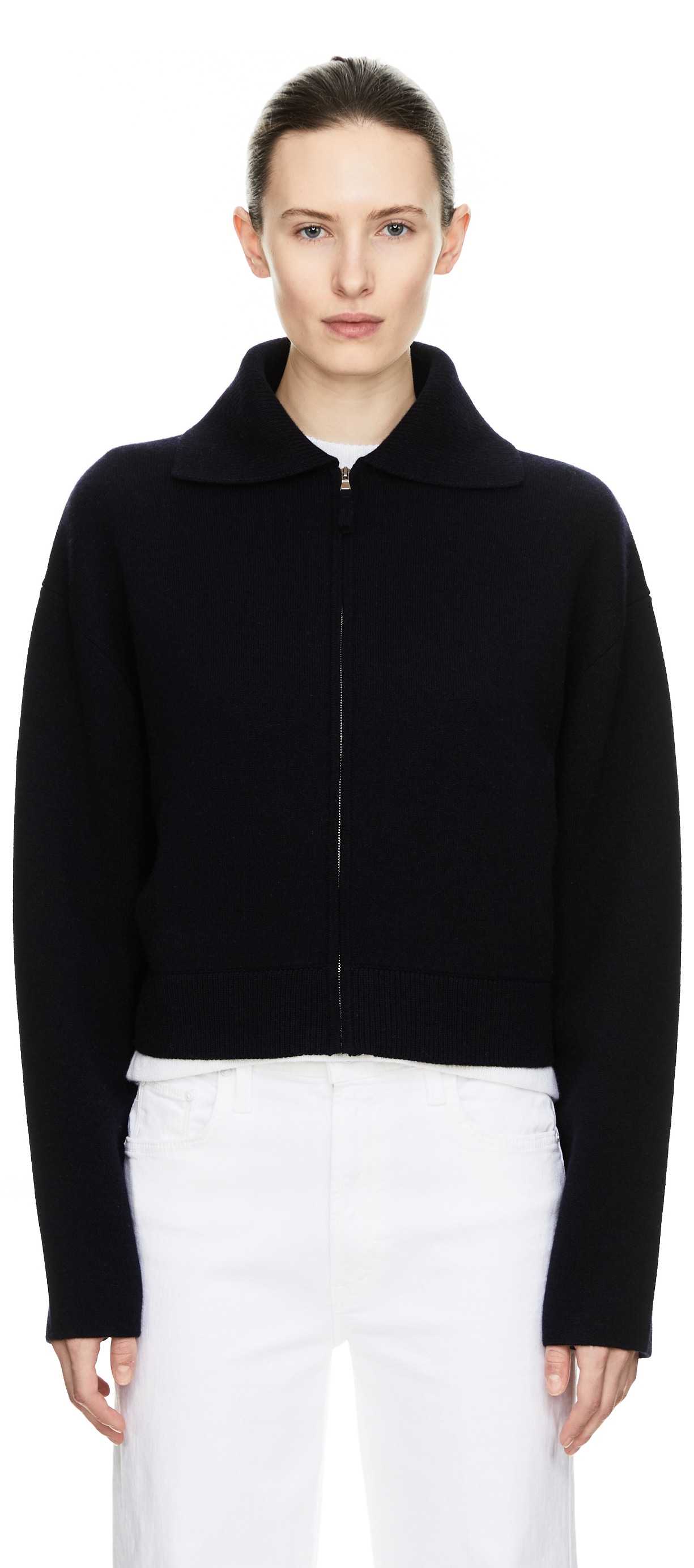 This navy blue cardigan from Allude is made from a high-quality wool-cashmere blend and boasts a boxy silhouette. The ribbed knit, high collar with zip and soft feel complete this stylish piece.