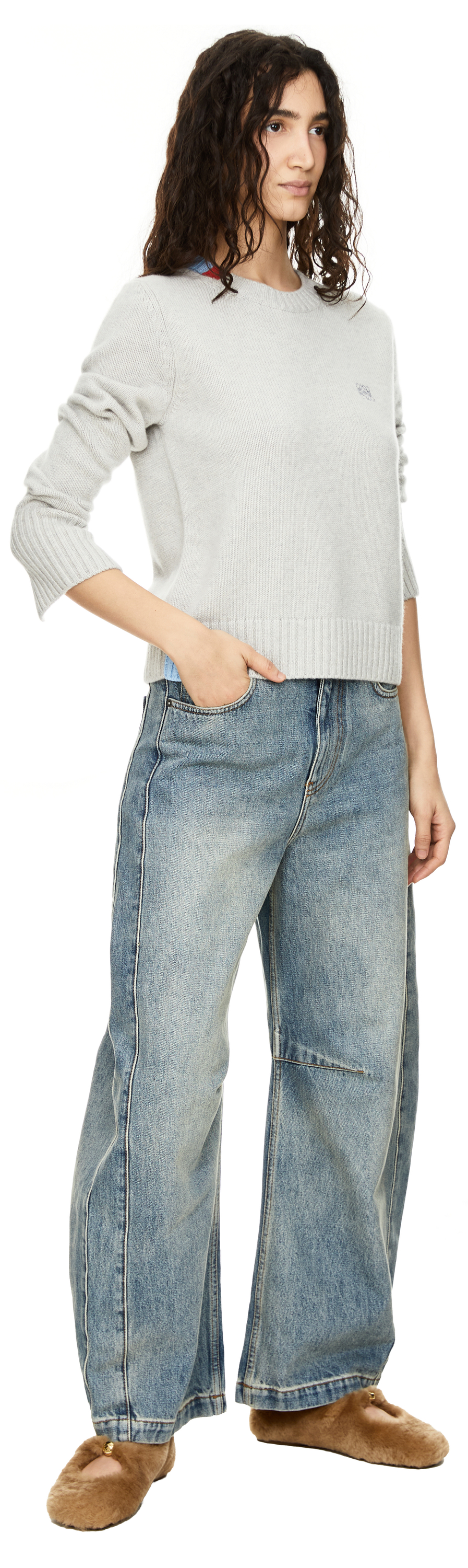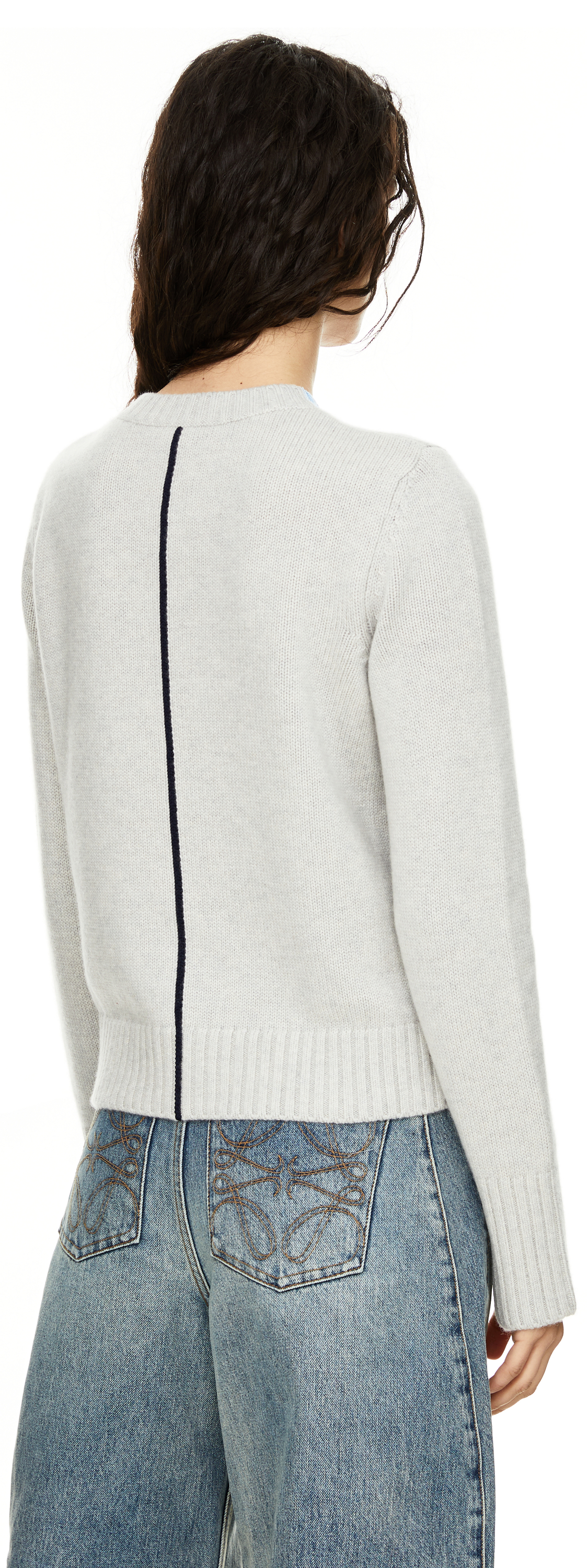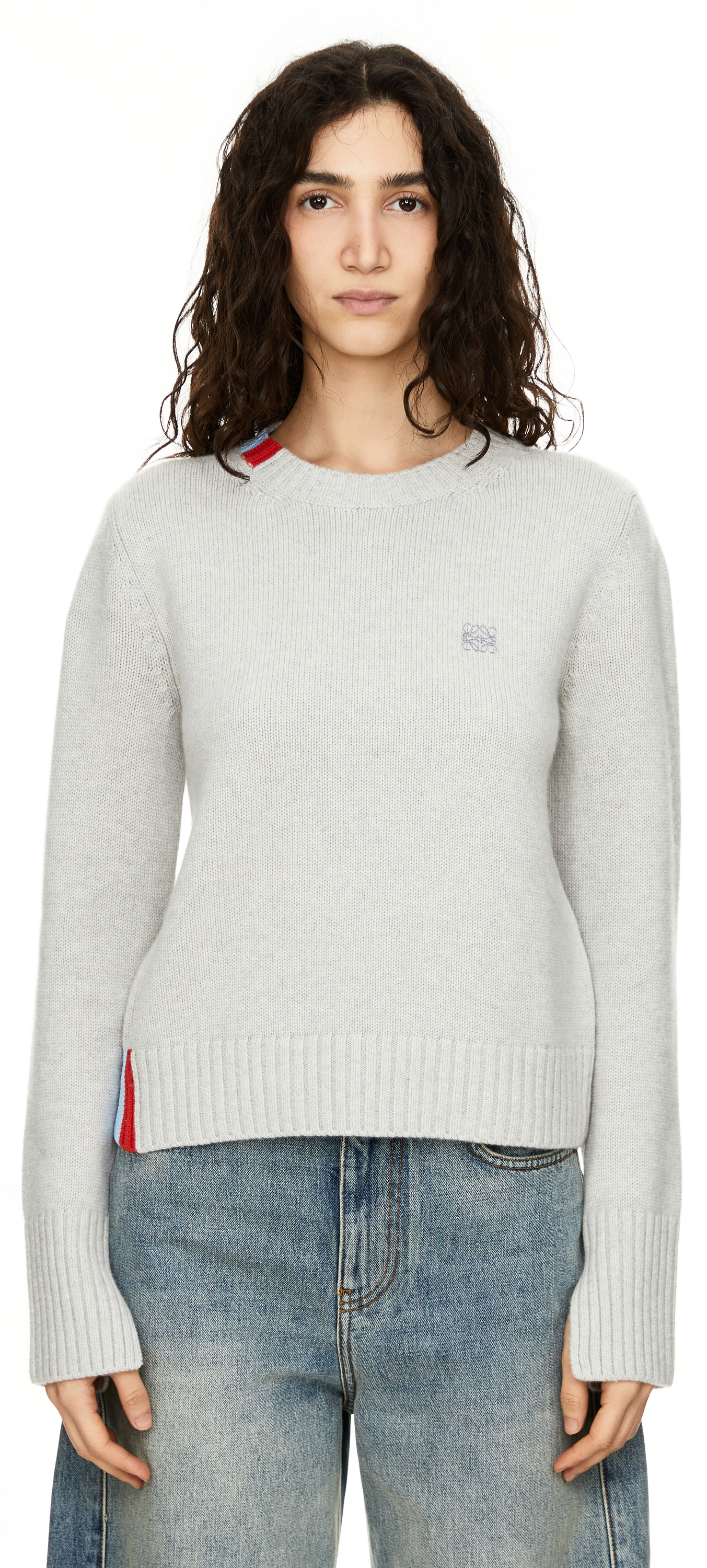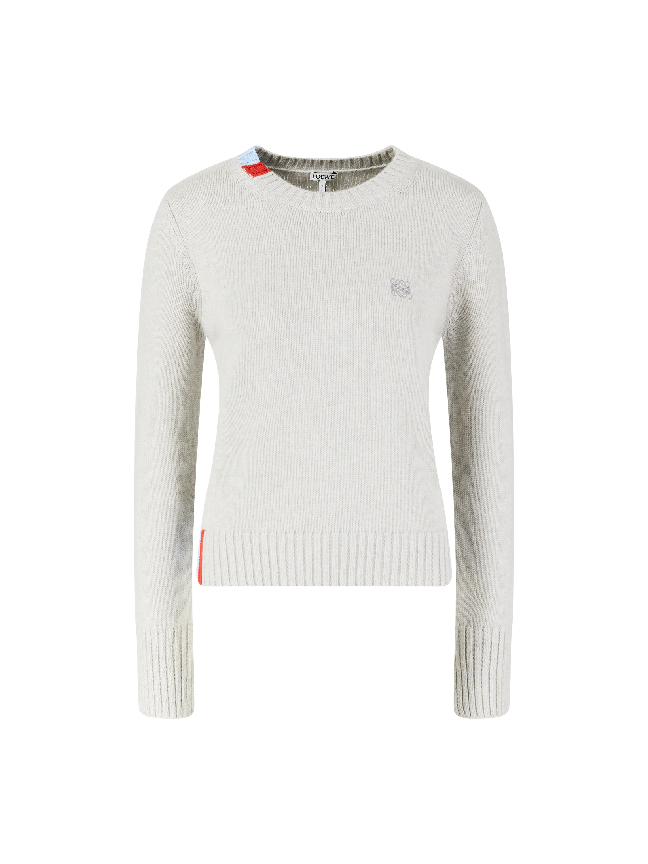 This light blue jumper from LOEWE is made from high-quality cashmere and features contrasting intarsia details on the collar, hem and back. The regular fit, round neckline and Anagram embroidery on the chest make this piece a real eye-catcher.