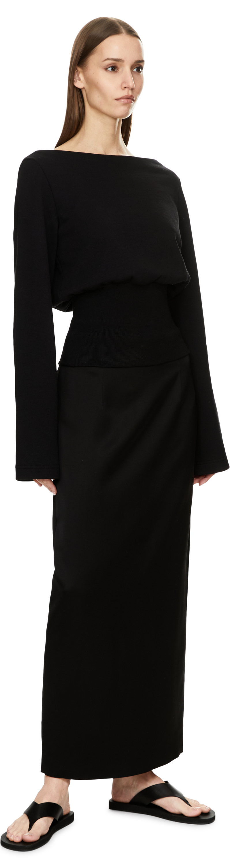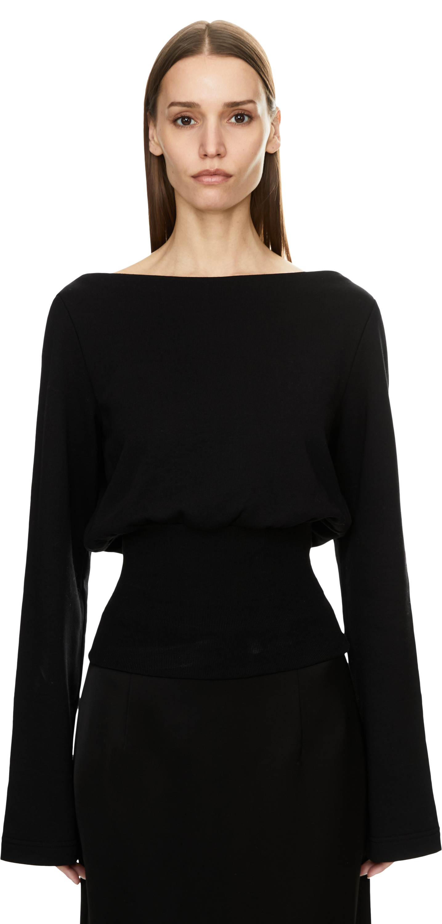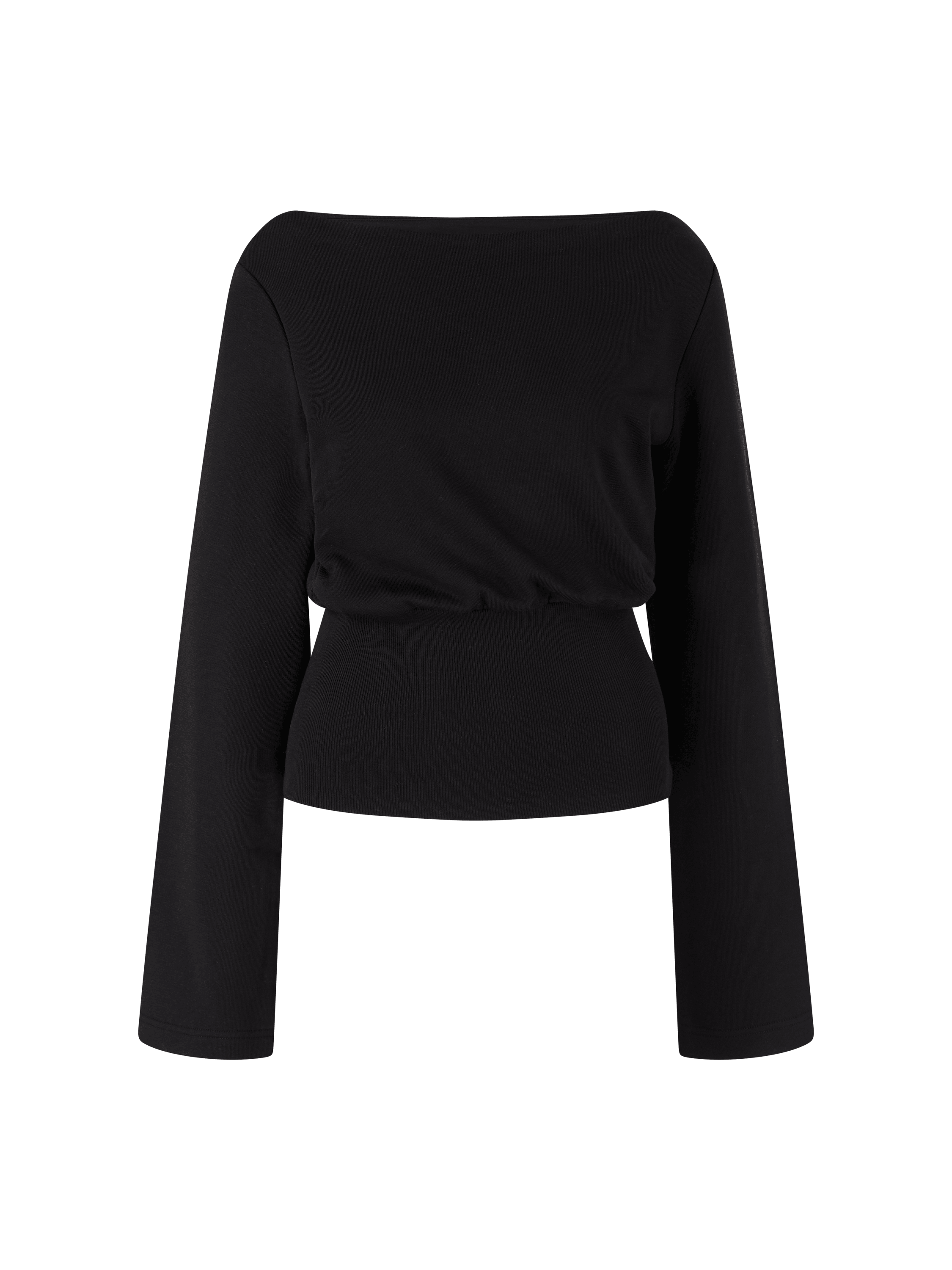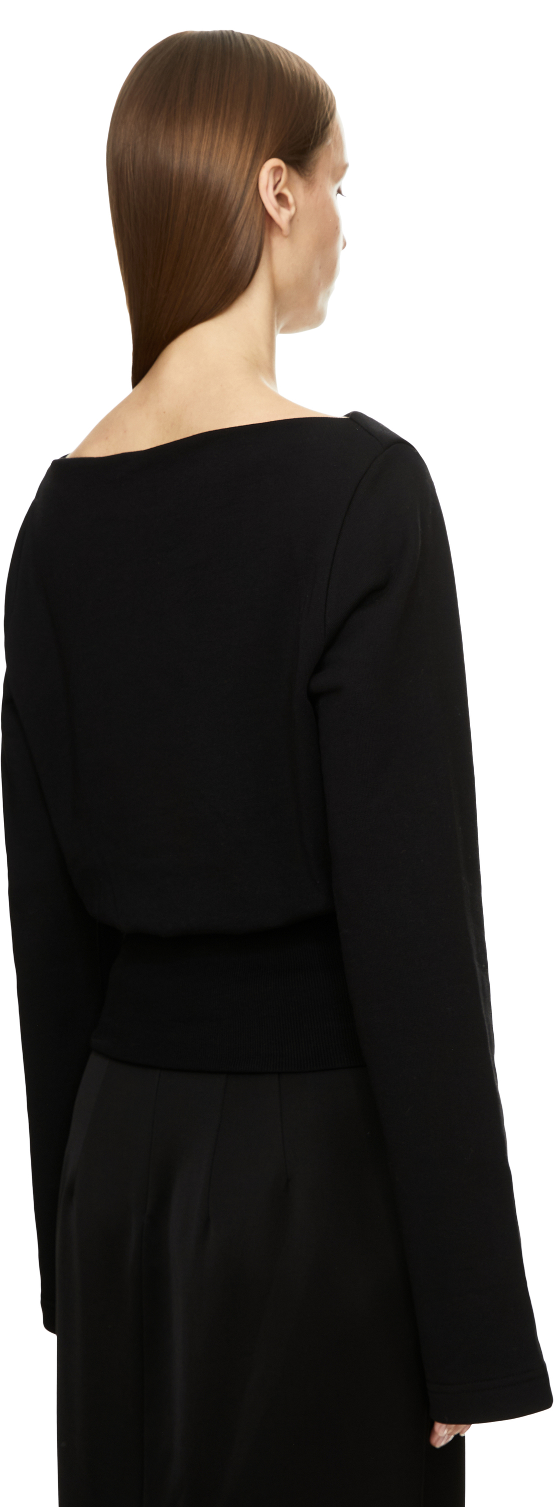 The 'Hancy' jumper in black by Dries van Noten is made from high-quality cotton and stands out thanks to the ribbed waistband, which emphasises the feminine silhouette. The boat neckline and long sleeves give the style a sophisticated touch and harmoniously round off the design.