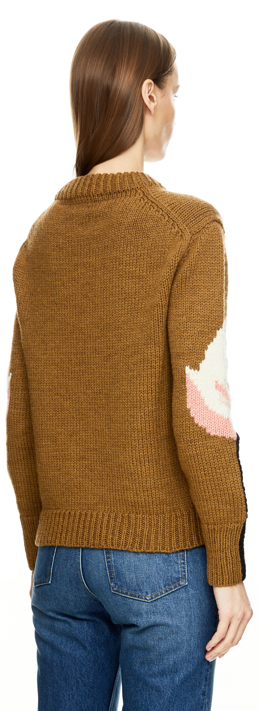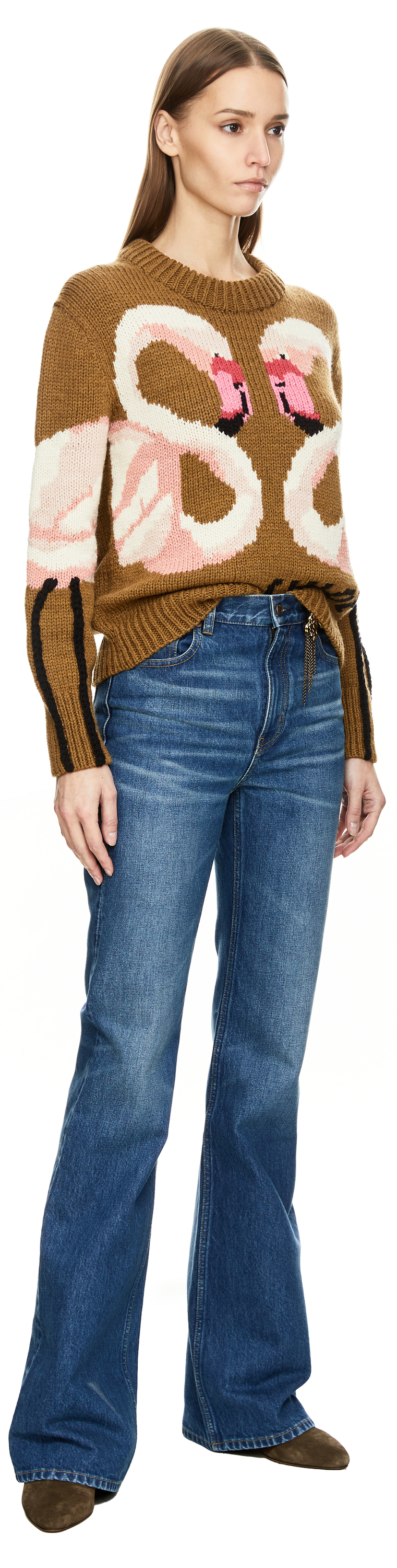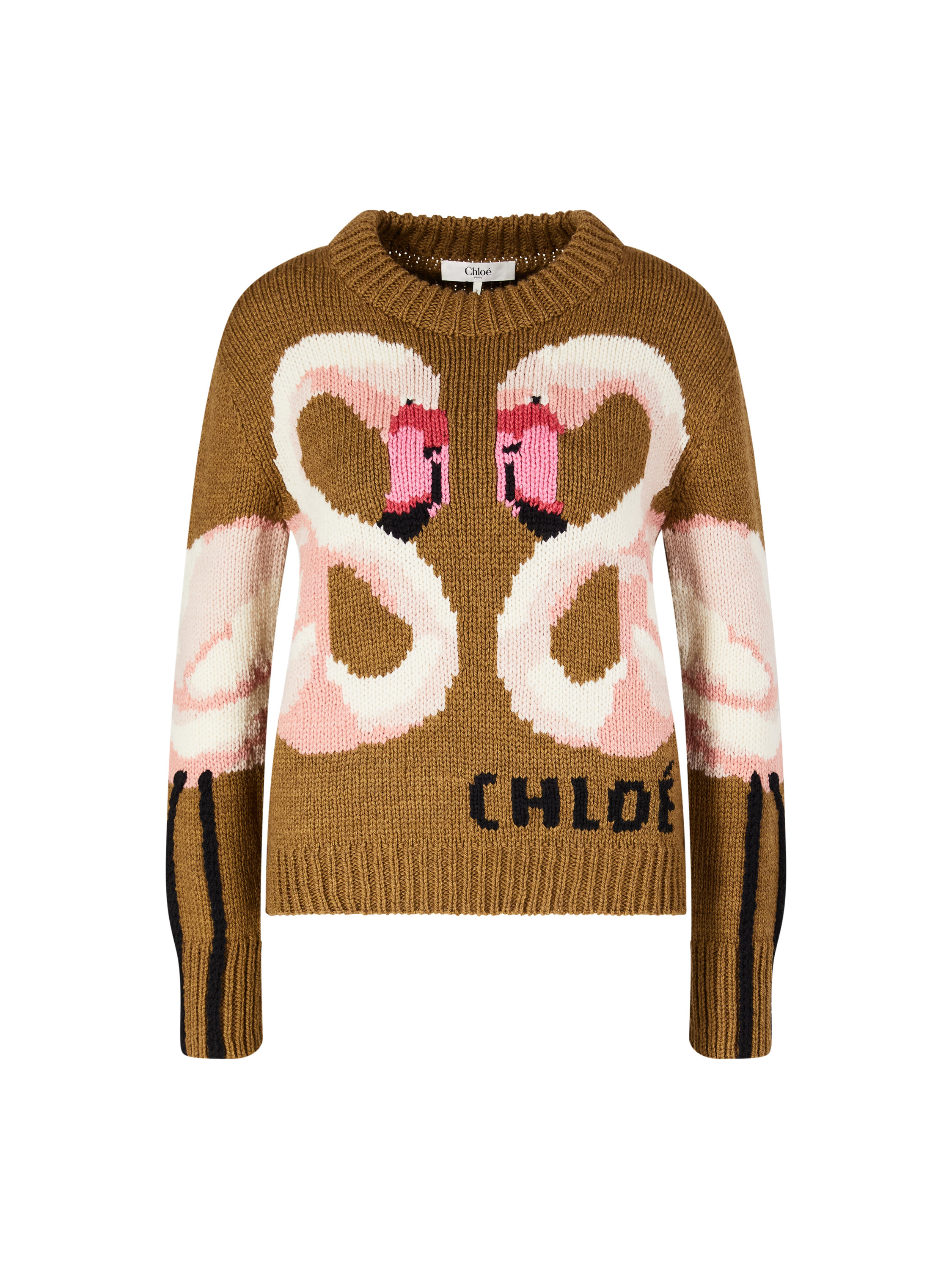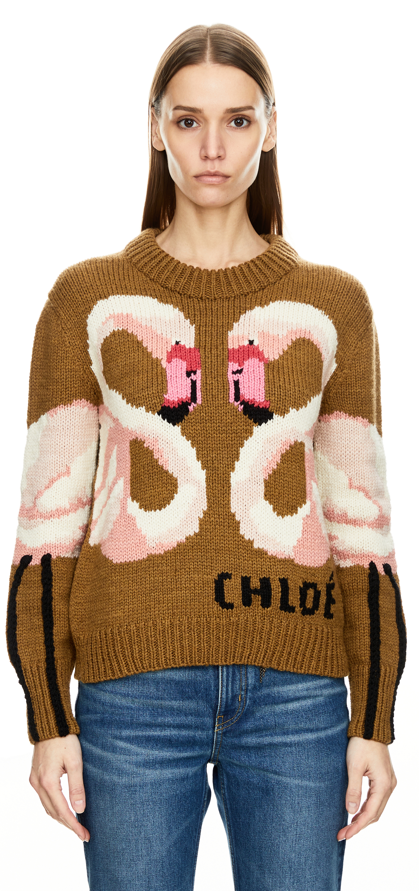 This brown jumper by Chloé is made from an intarsia wool knit and boasts a straight fit. The round neckline, the two flamingos and the large Chloé logo embroidery at the hem and ribbed trims complete this fashionable piece.