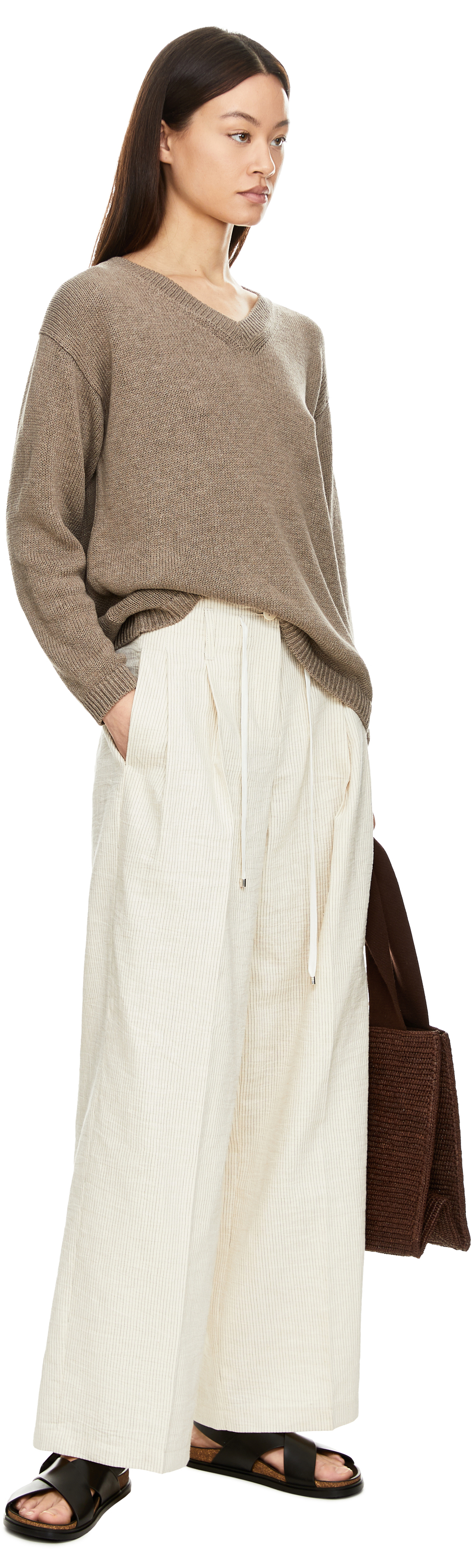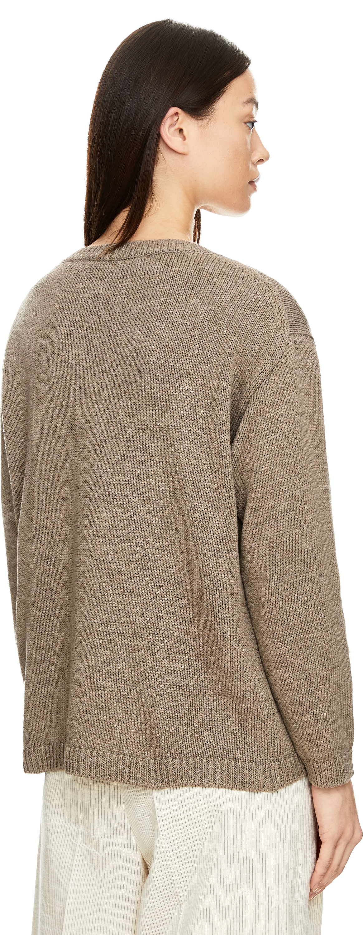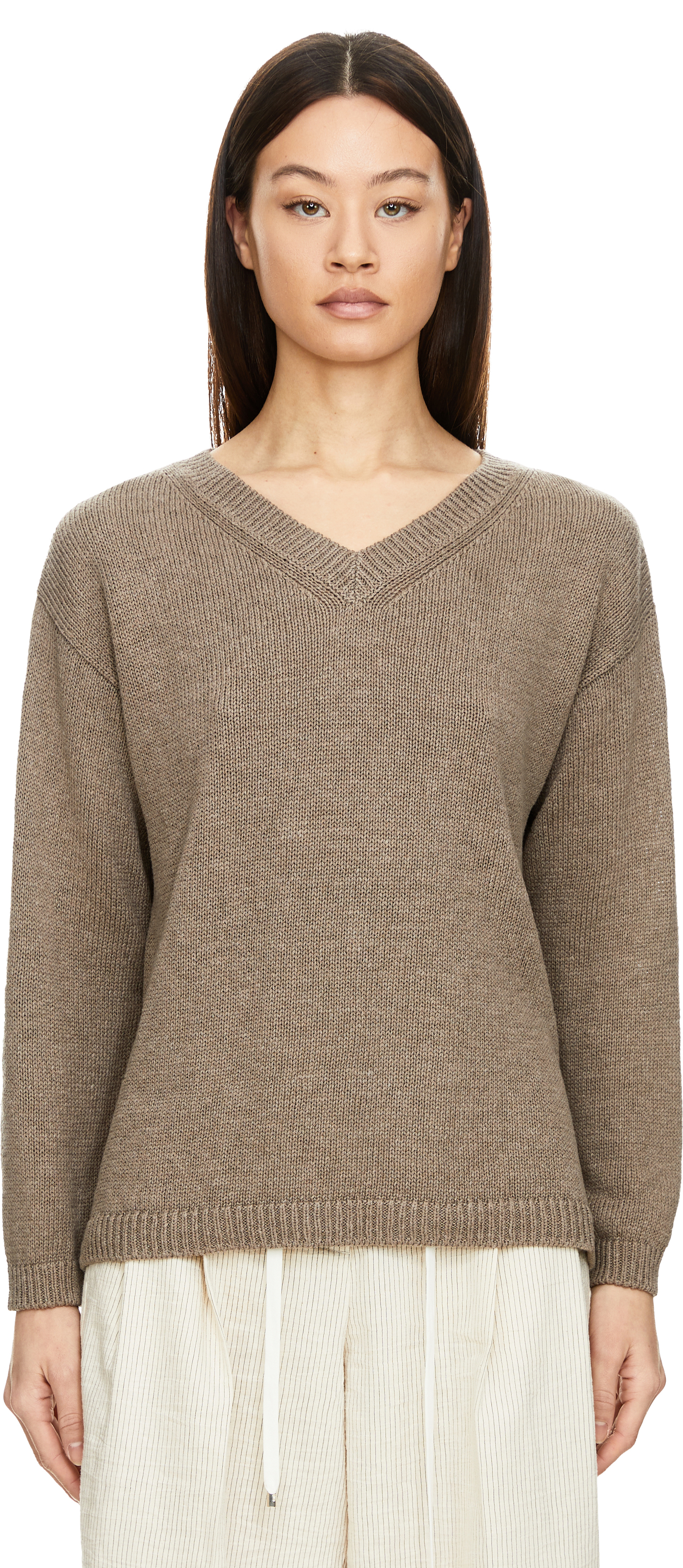 The 'Diona' jumper in taupe by Iris von Arnim is made from a high-quality silk and linen blend and impresses with its casual fit. The V-neckline, long sleeves and dropped shoulders give the design a timeless touch.