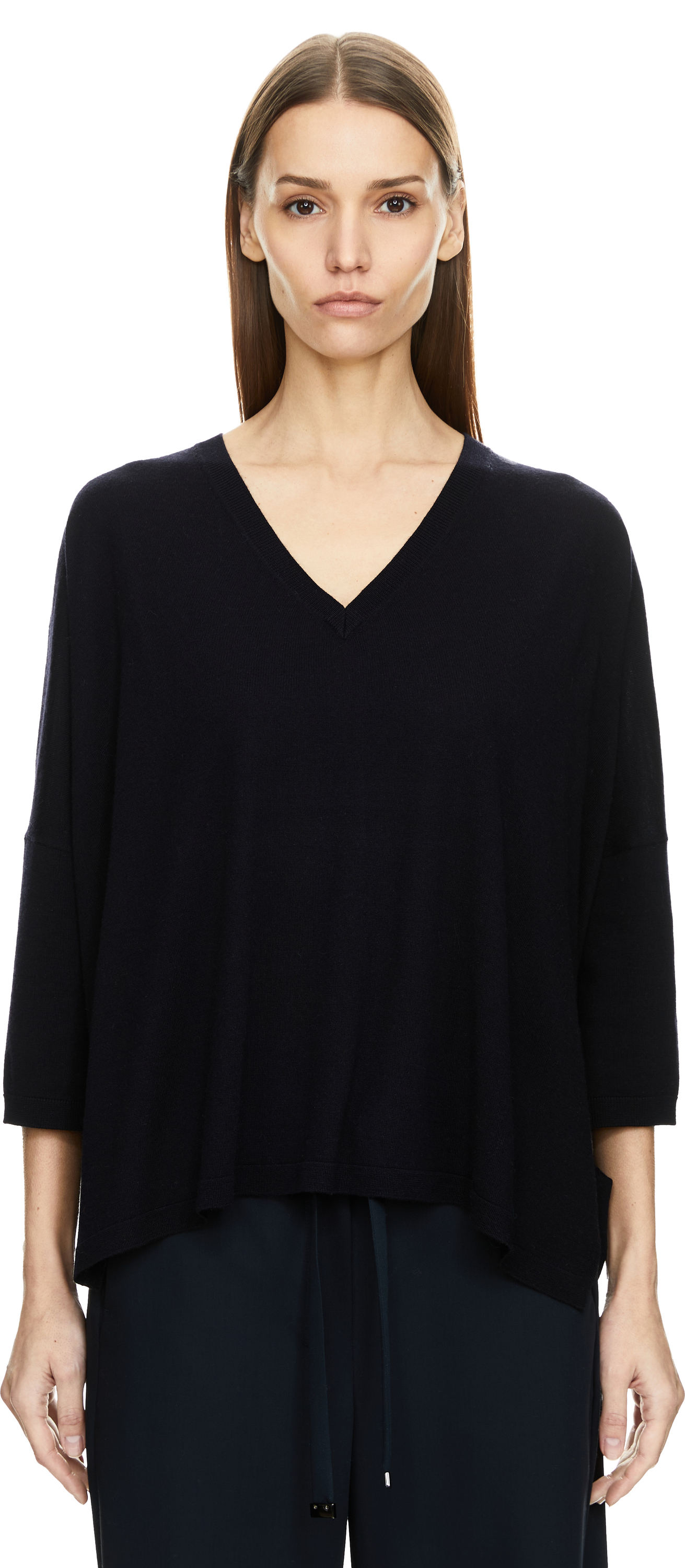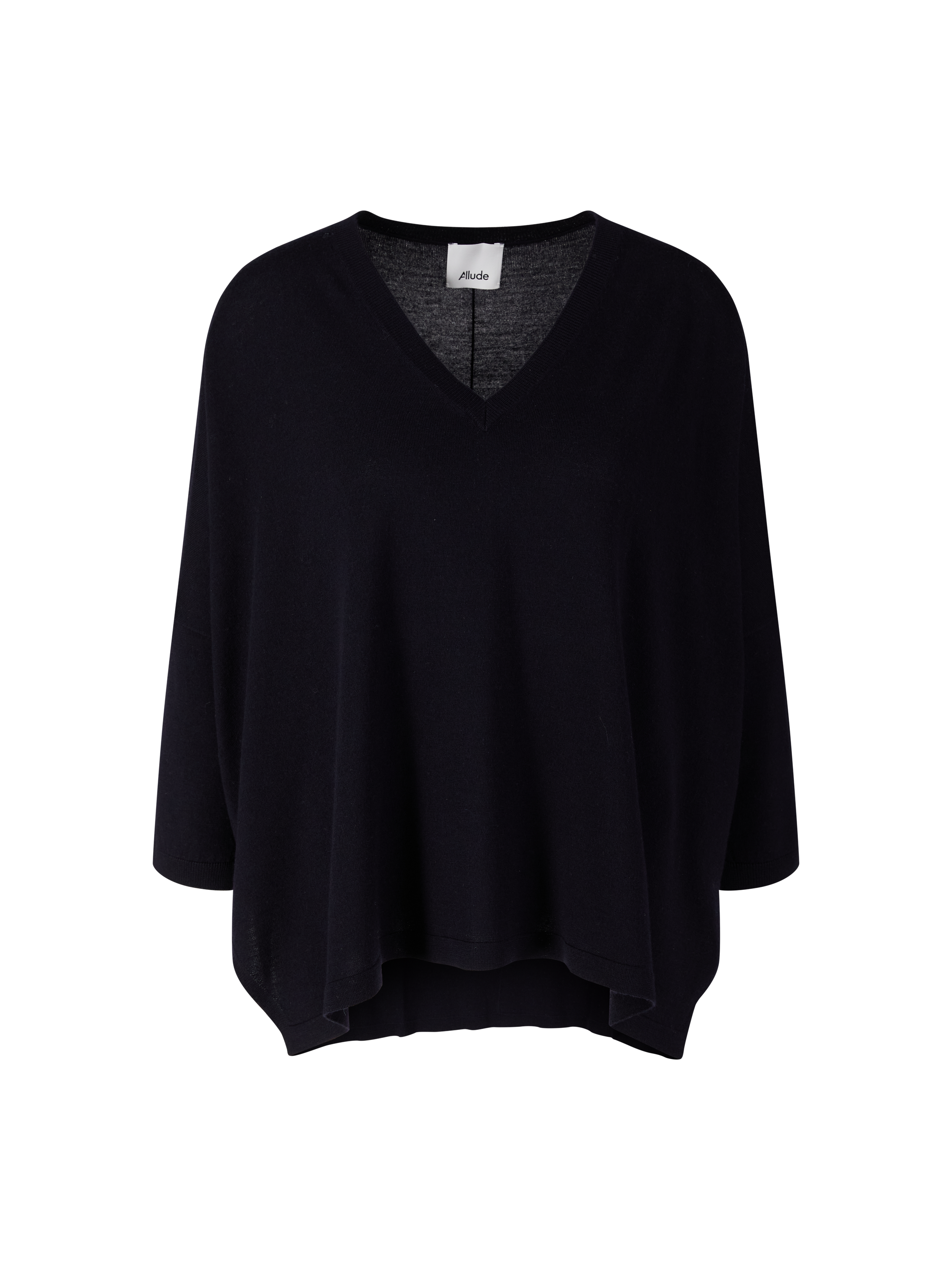 Dieser Pullover in Marineblau von Allude wurde aus feiner Schurwolle gefertigt und besticht durch die lockere Passform. Der V-Ausschnitt, die 3/4-Ärmel sowie die Seitenschlitze runden das Modell stilvoll ab.