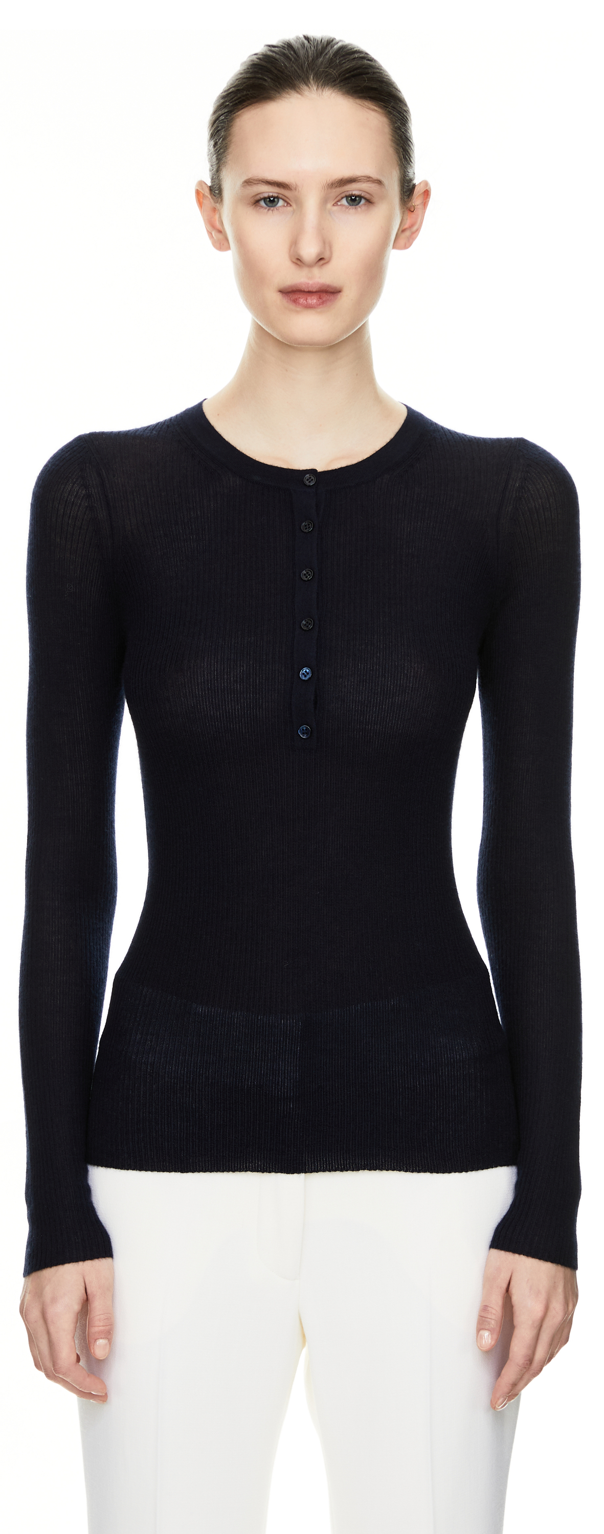 The 'Julian' top in navy blue by Gabriela Hearst is made from a high-quality cashmere-silk blend and impresses with its soft feel. The straight fit, round neckline and short button placket with embossed logos on the buttons characterise this timeless piece. The narrow long sleeves stylishly round off the design.