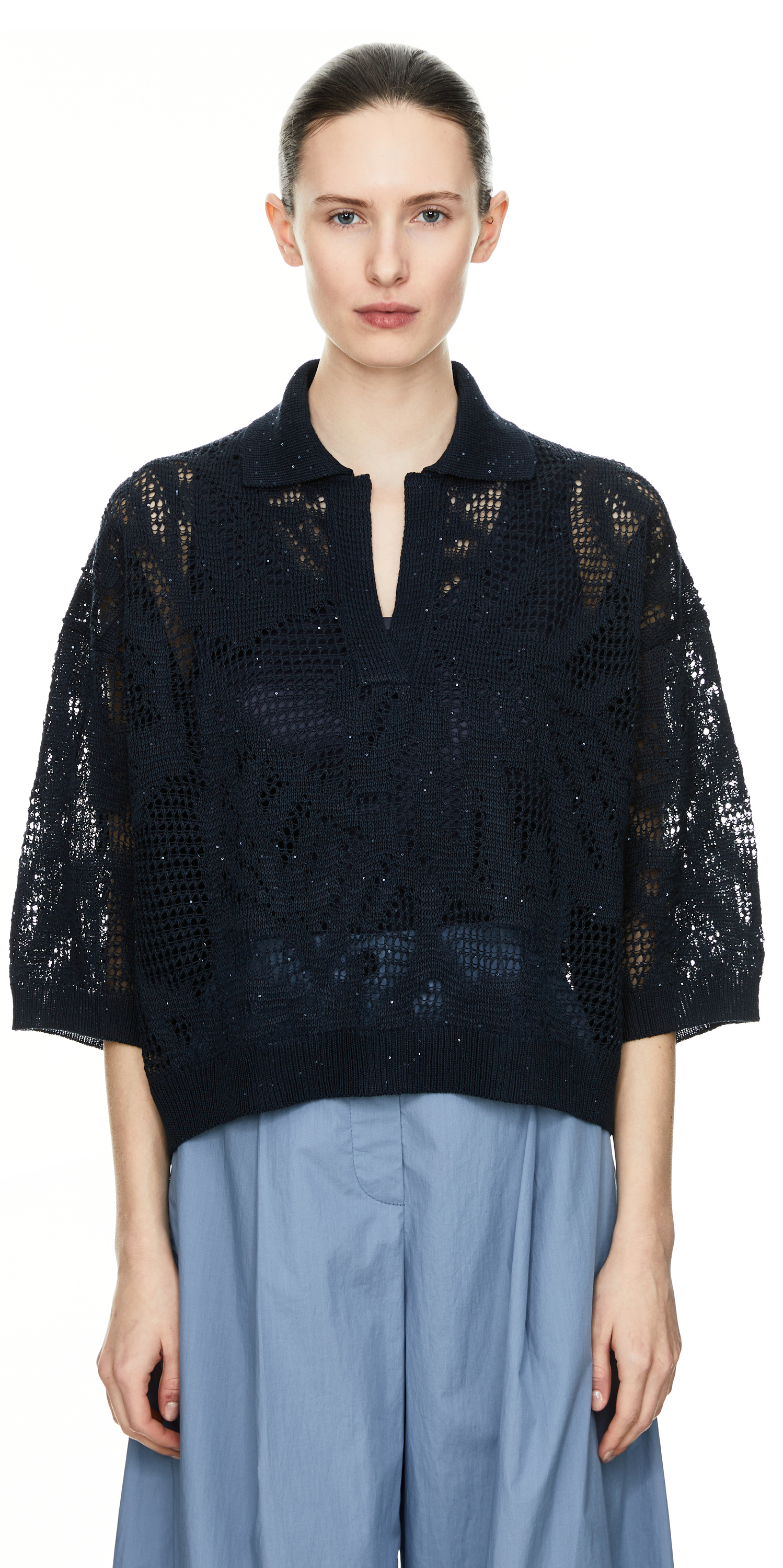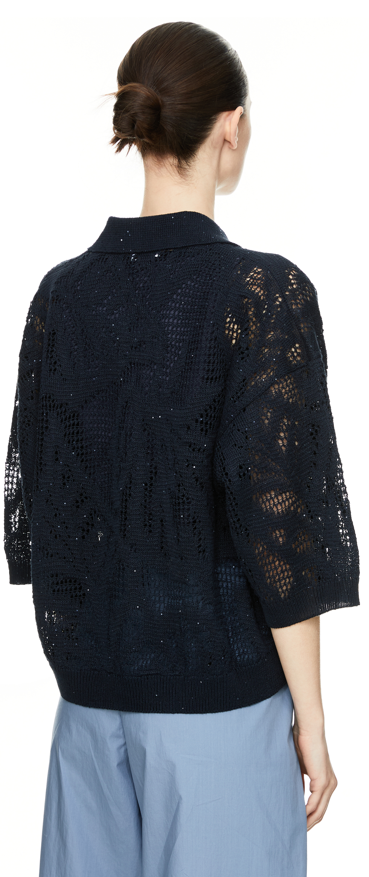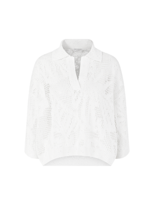 This polo shirt in navy blue by Brunello Cucinelli is made from a high-quality linen blend and features an elegant ajour hole pattern. The loose fit, classic polo collar and discreet use of sequins emphasise the exclusive character of this high-quality piece.