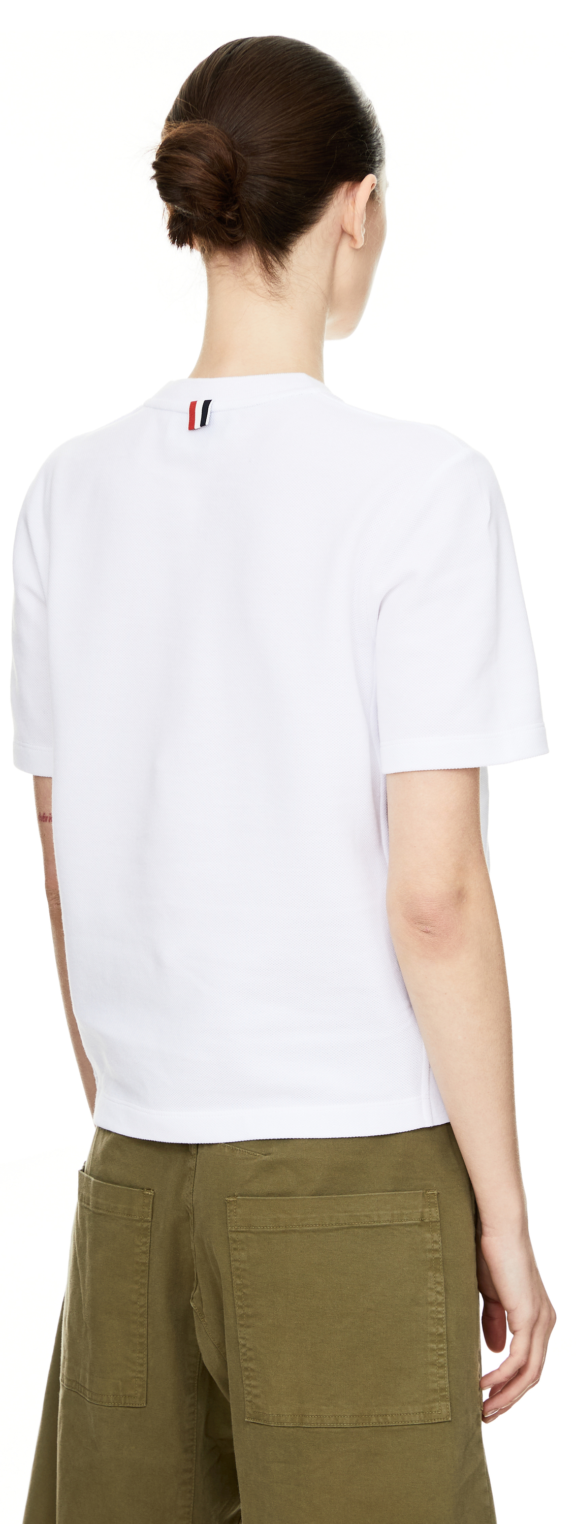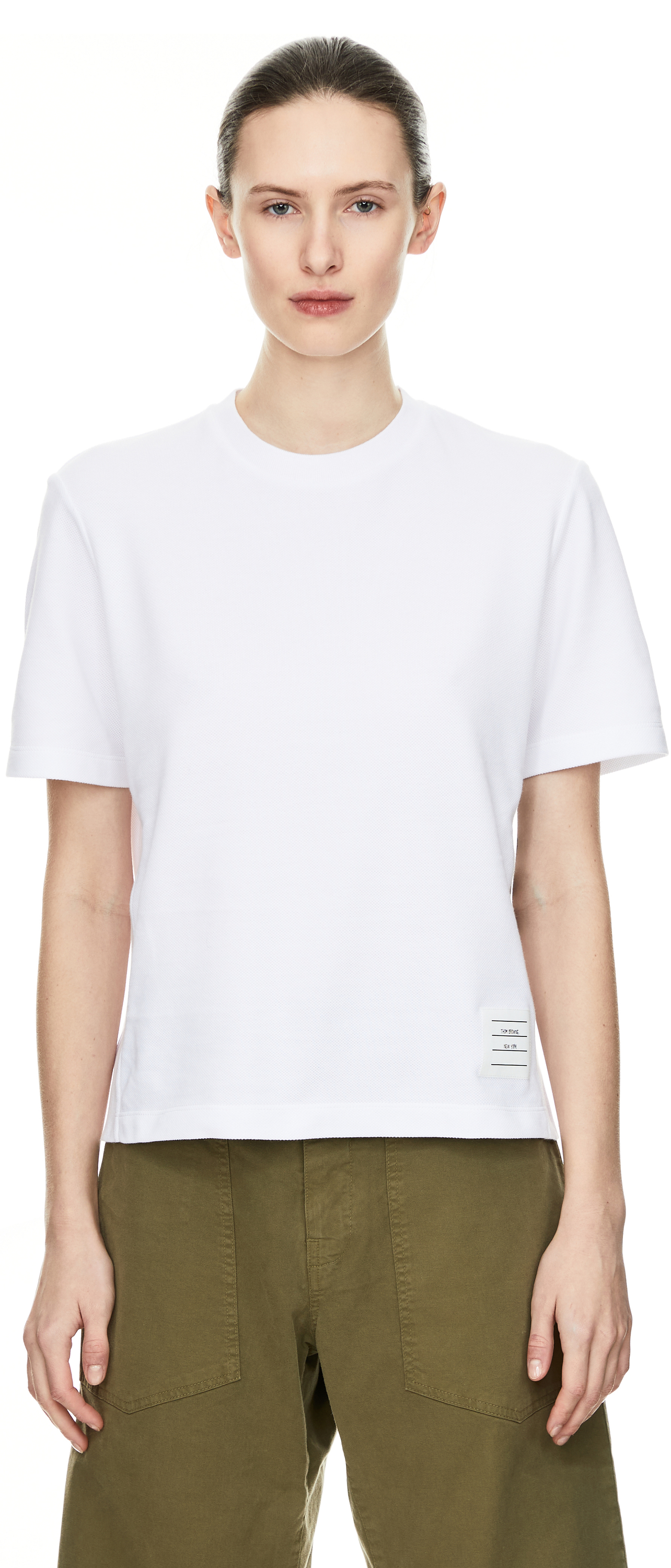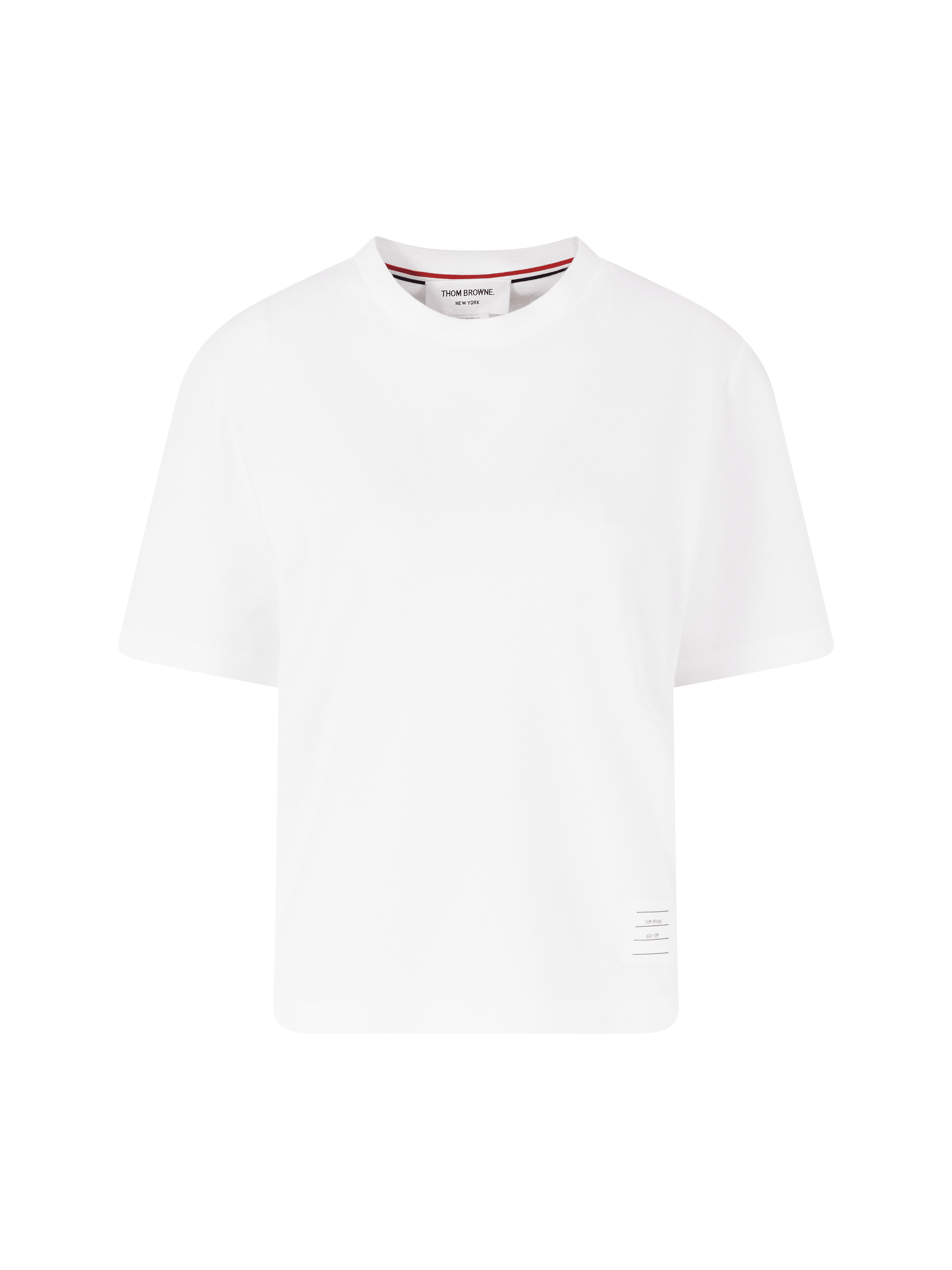 This white shirt by Thom Browne is made from pure cotton and features the iconic four stripes. The round neckline and the characteristic loop made of striped grosgrain ribbon complete the model.