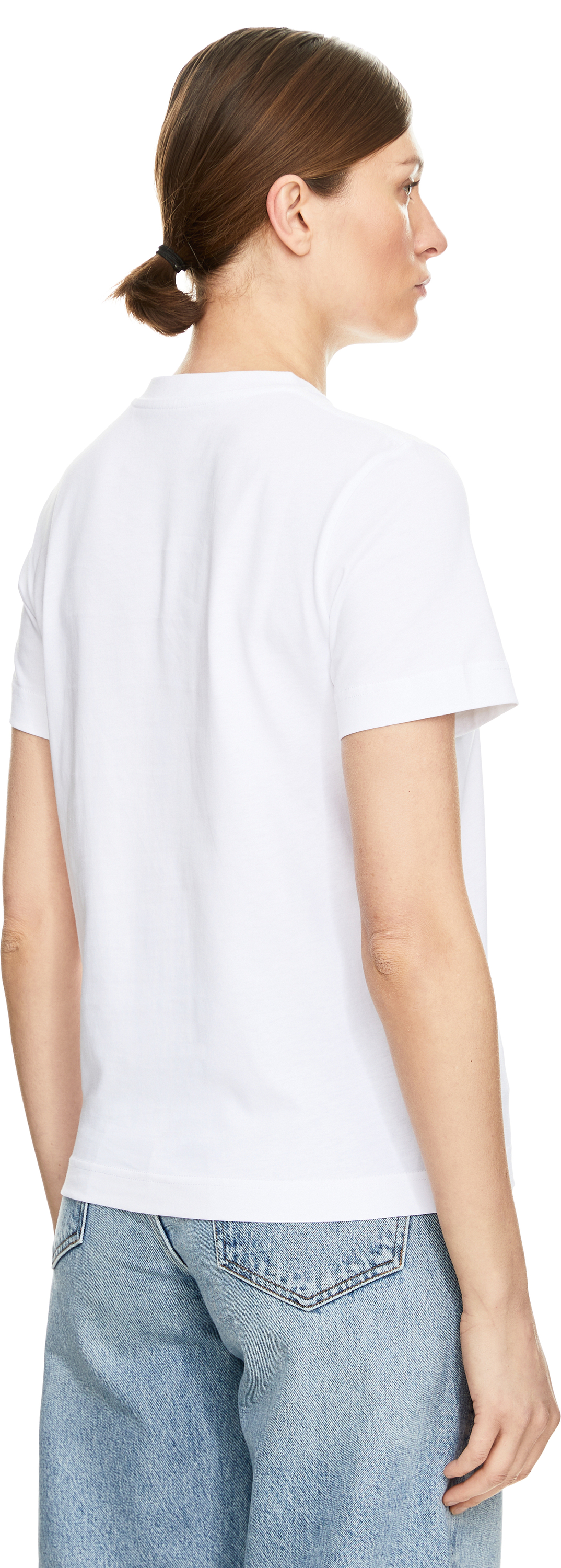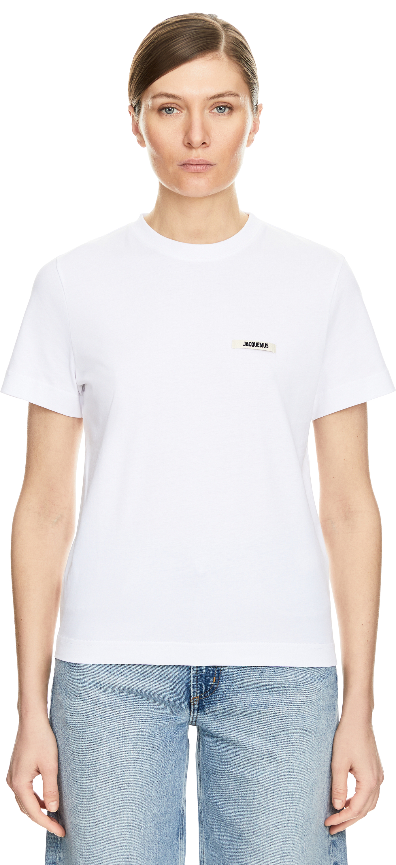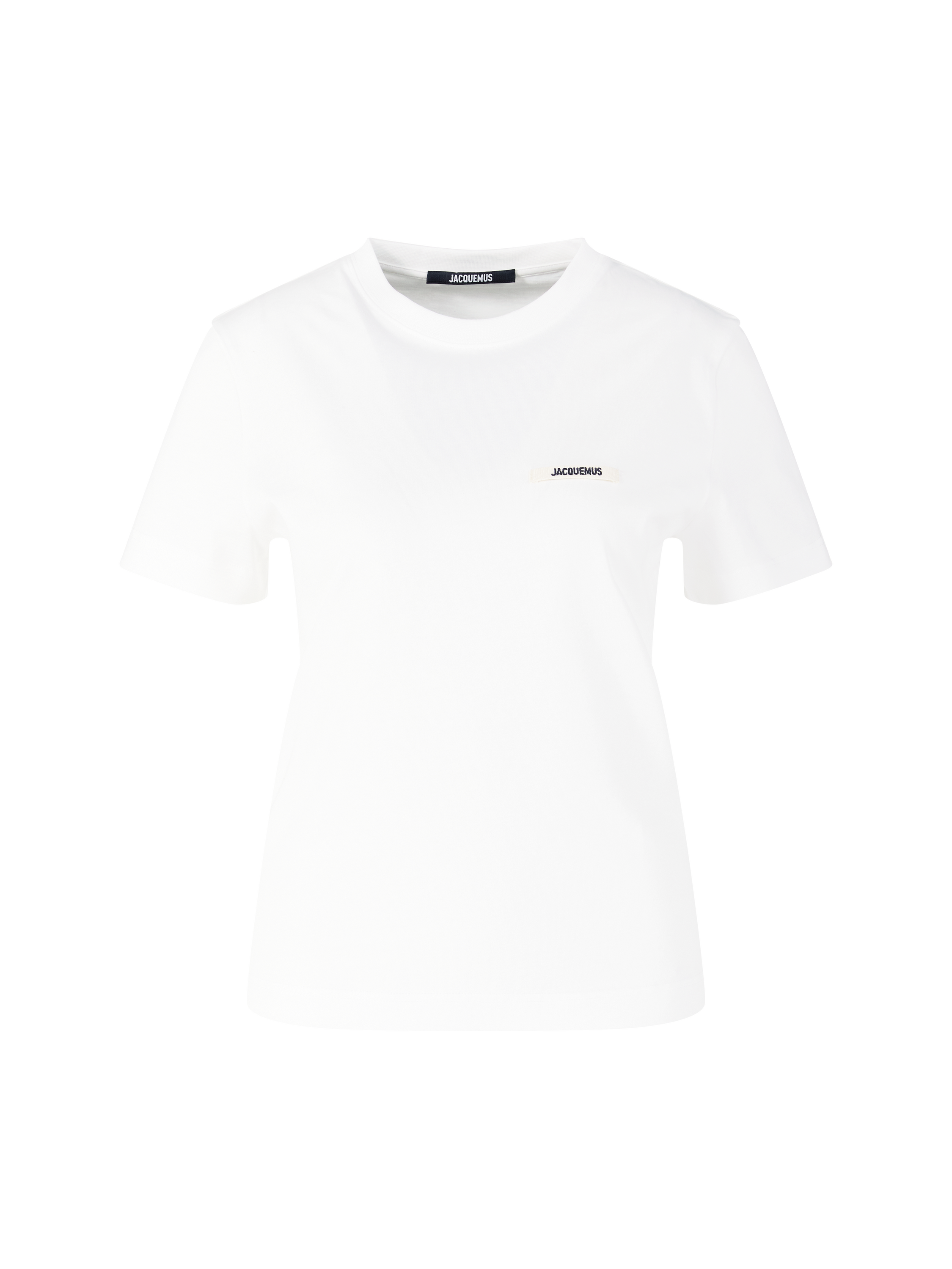 The 'Le Gros Grain Mc' T-shirt in white by JACQUEMUS is made from pure cotton and features a label badge on the front. The short sleeves and round neckline combined with the pleasant feel give this piece a real touch of style.
