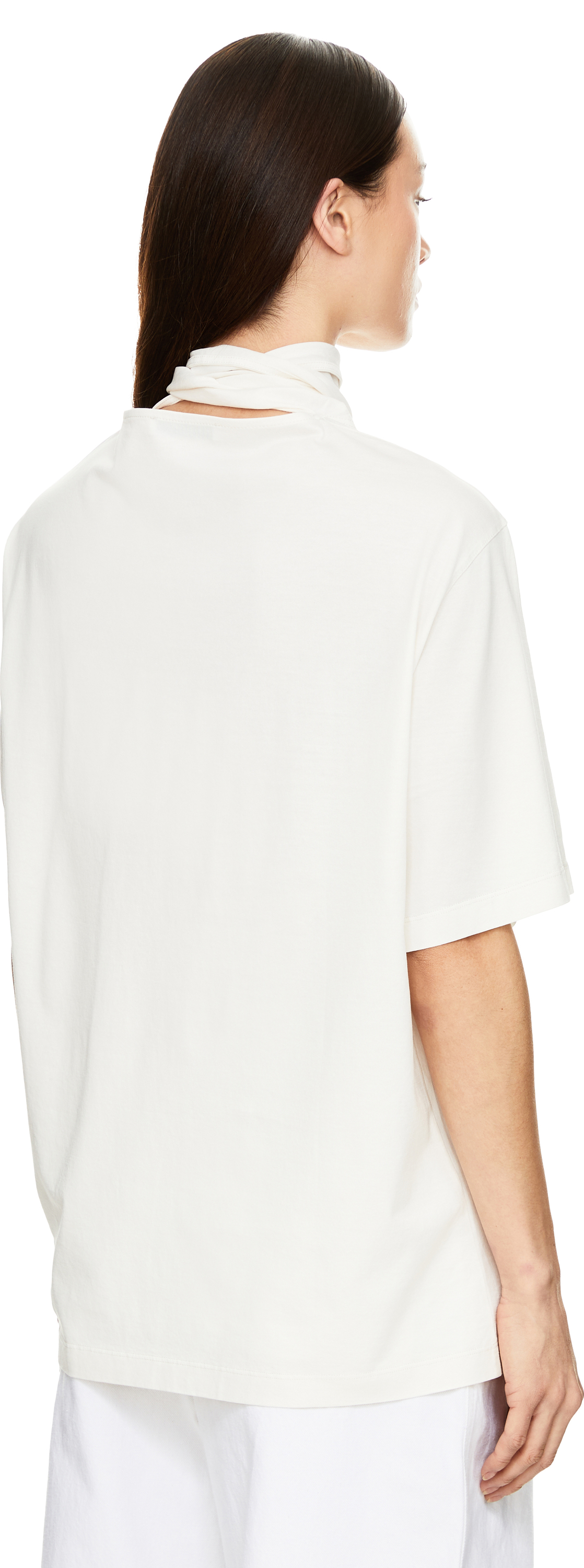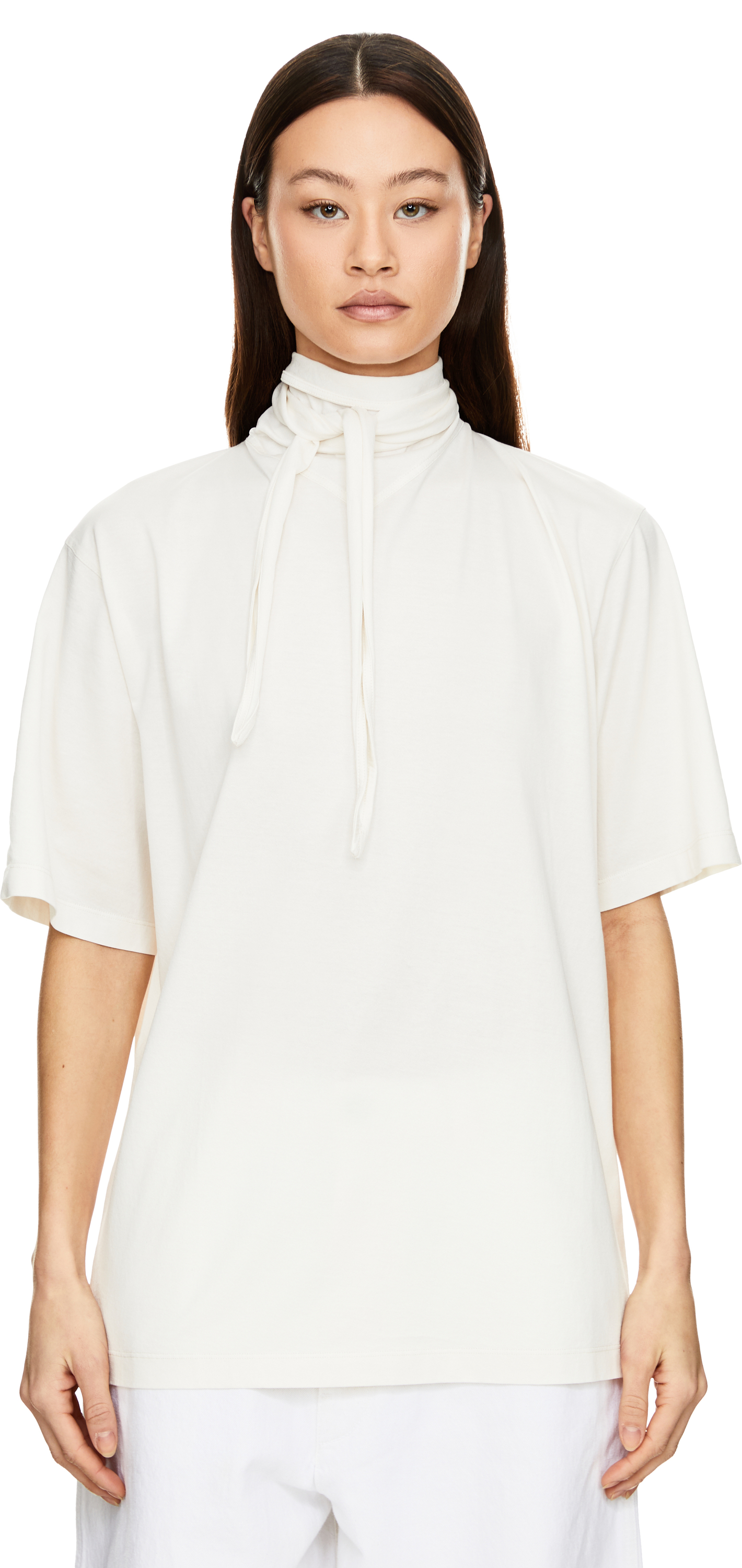 This cream T-shirt by Lemaire is made from lightweight, flowing cotton jersey and features a boxy fit. The short sleeves, stand-up collar and seam details at the hem and collar give this piece its character. The stand-up collar has a V-shaped base that merges into a scarf that can be tied to one side of the neck or left to fall forward.
