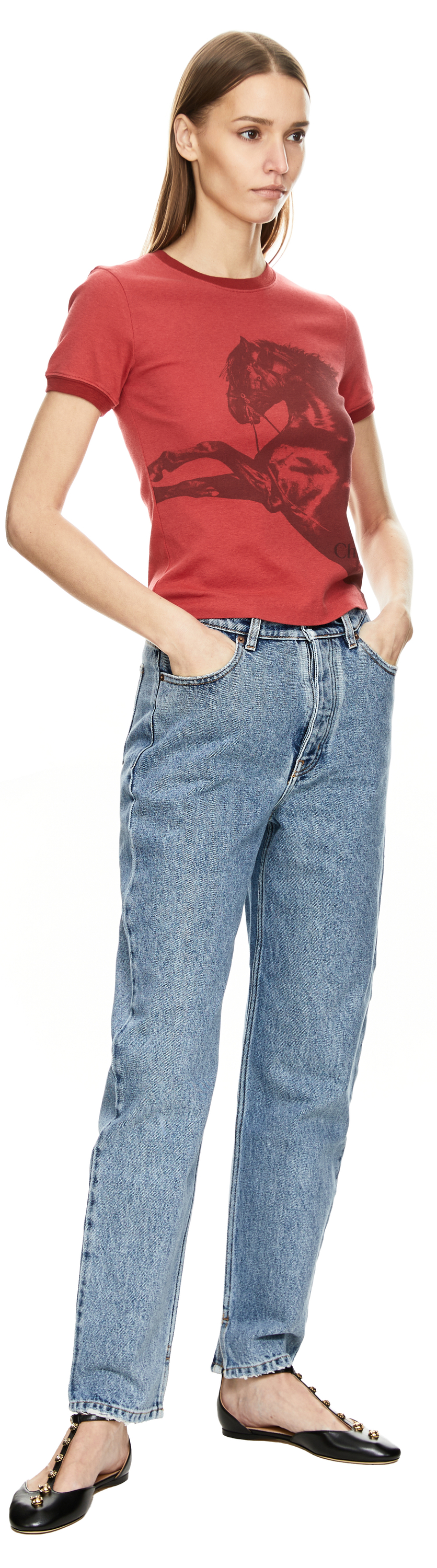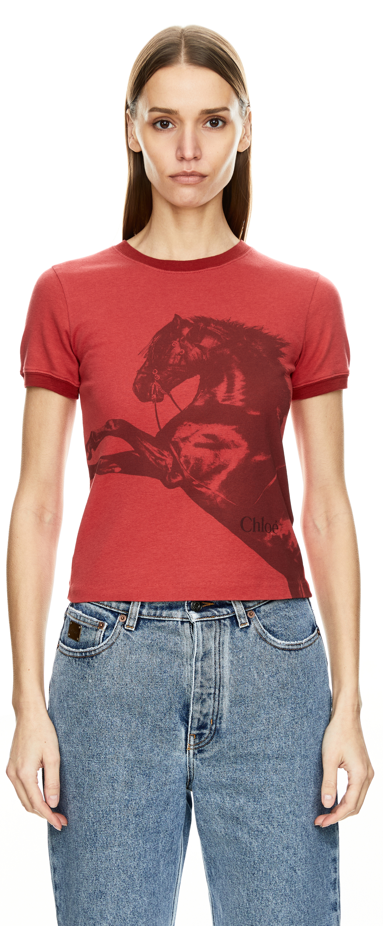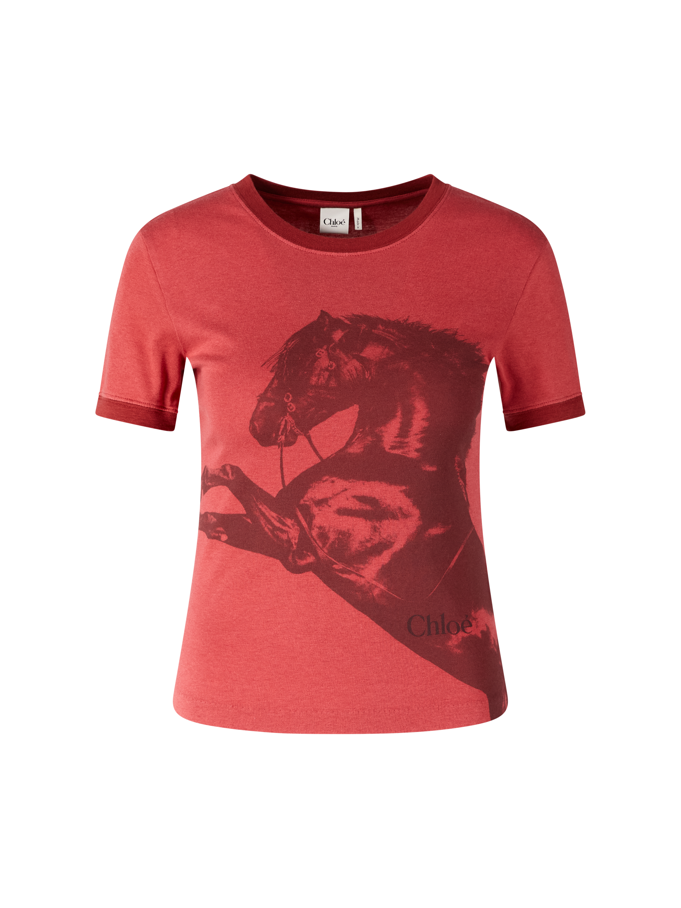 This T-shirt in red by Chloé is made from pure cotton and features an eye-catching horse and Chloé logo print. The baby fit and classic round neckline give the style a casual yet feminine touch.