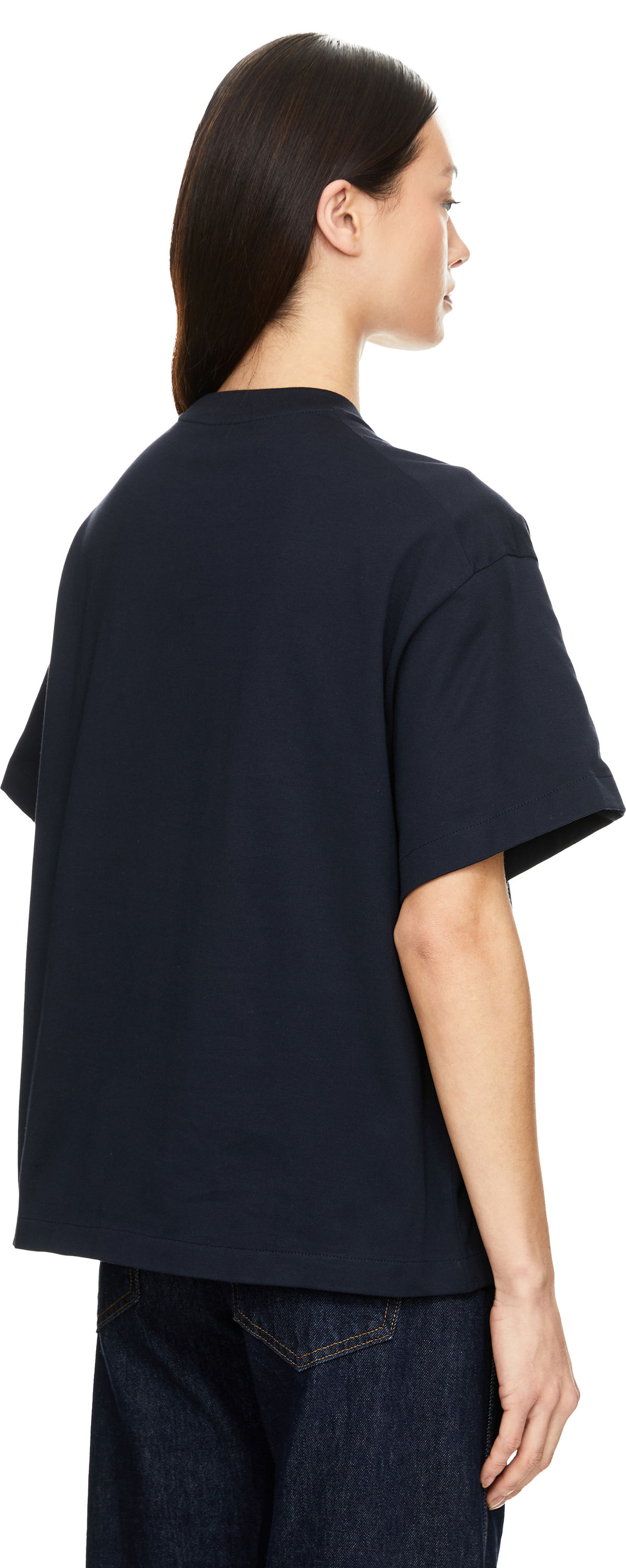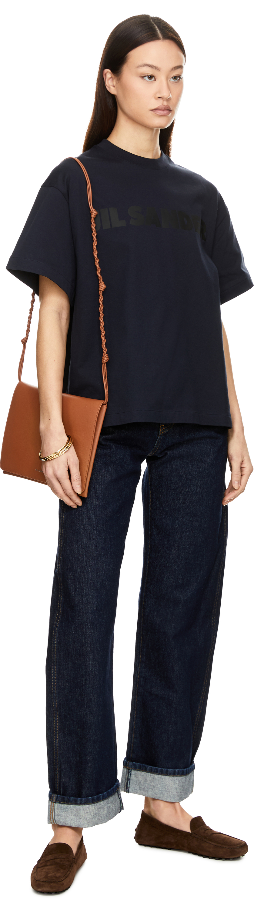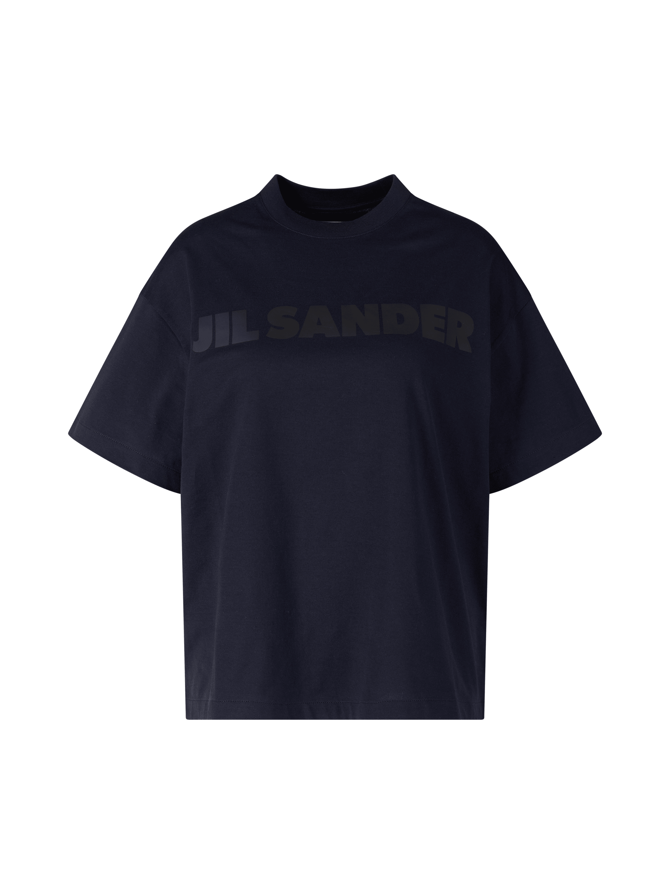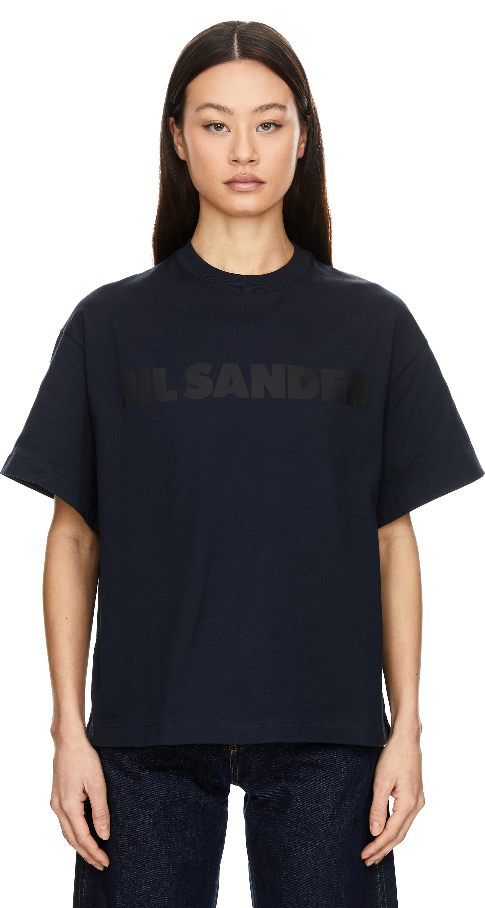 This navy blue T-shirt by JIL SANDER is made from pure cotton and stands out with its boxy shape and oversized fit. The dropped shoulders, short sleeves and round neckline characterise this classic style. The printed Jil Sander logo on the front rounds off the design.