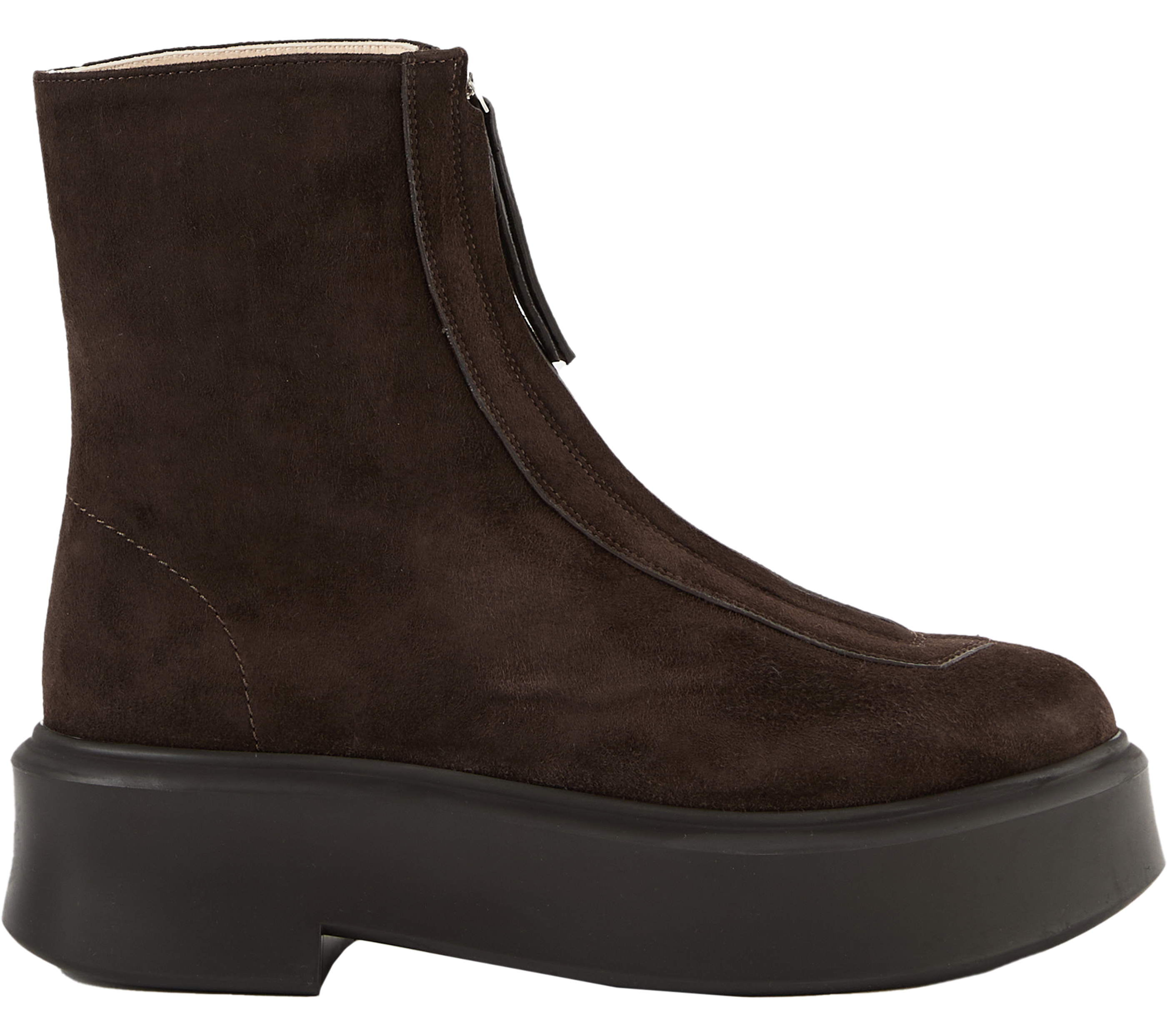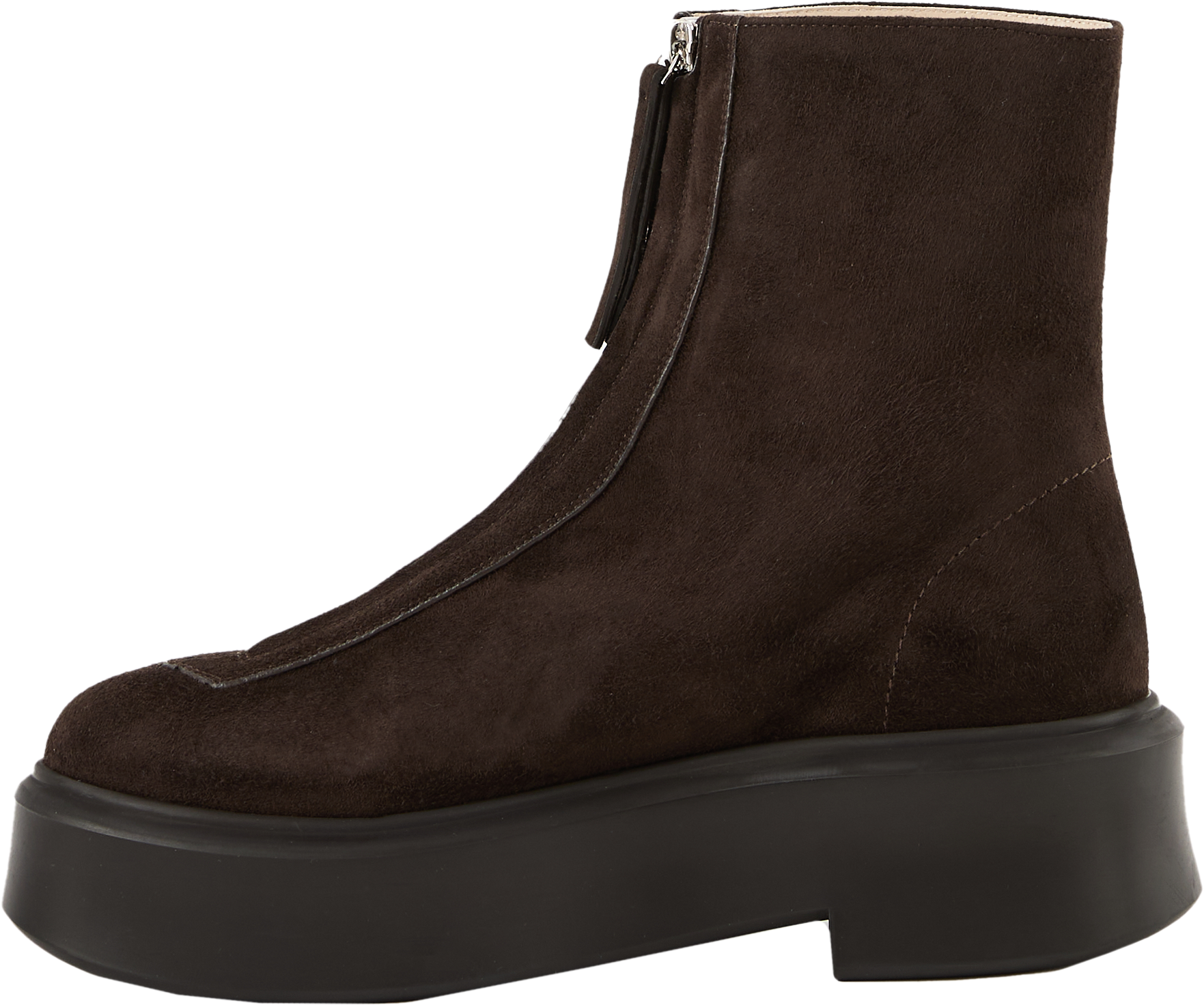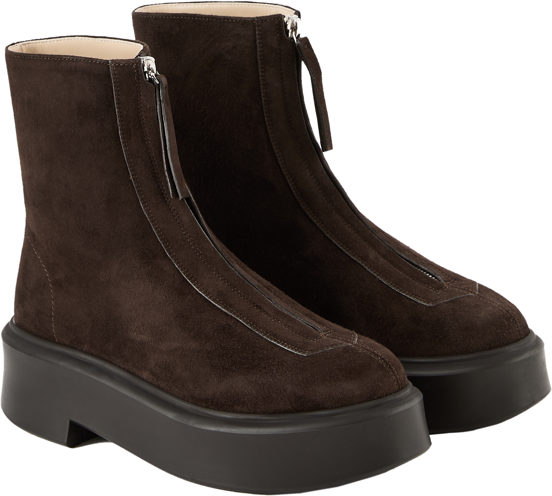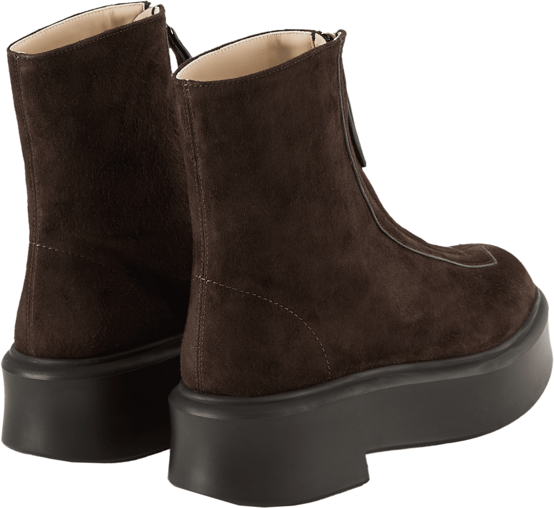 The 'Zipped' ankle boots in dark brown by The Row are made from soft suede and feature a front zip fastening. The robust design is rounded off by the thick sole. The subtle stitching accentuates this minimalist style.
