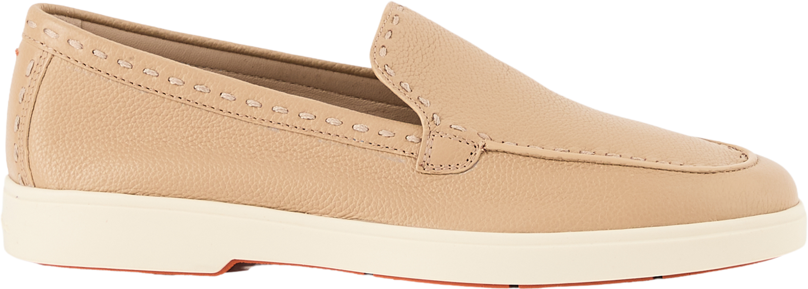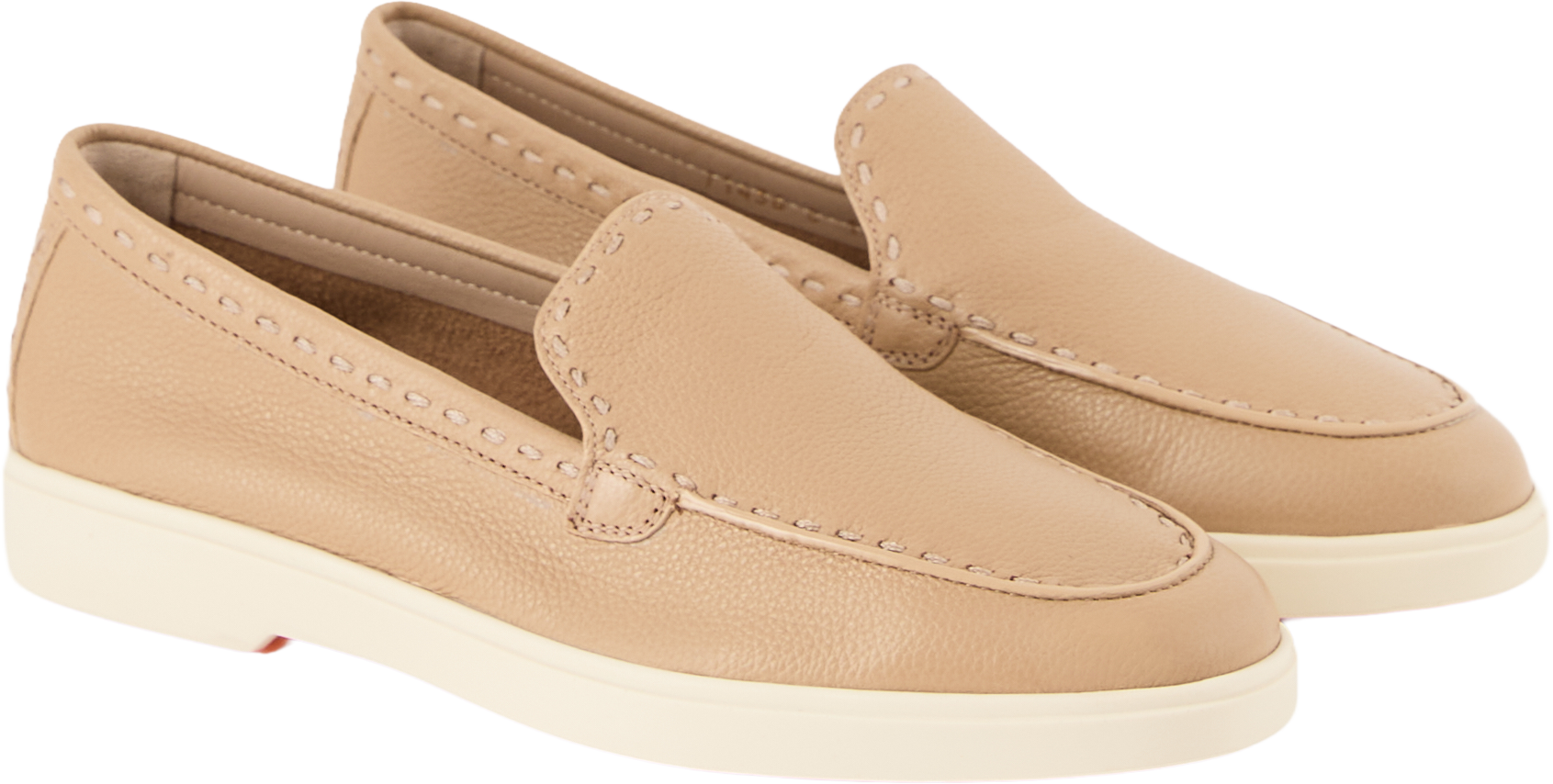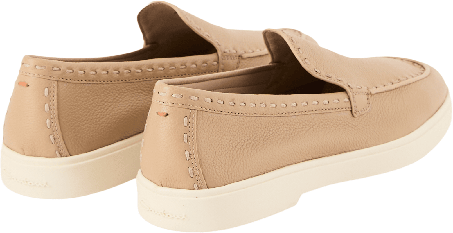 These beige loafers from Santoni are made from grained calfskin and impress with their classic style and high level of comfort. The distinctive stitching along the shoe emphasises the silhouette, while the flexible and non-slip sole ensures maximum comfort. Flexible inserts on the sides make them easy to put on and take off, making this model the perfect companion for every day.