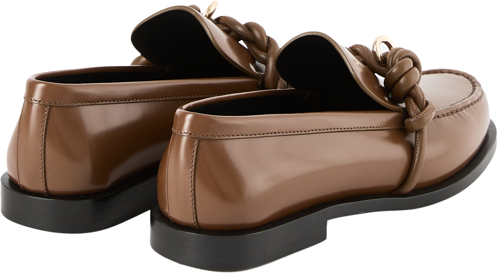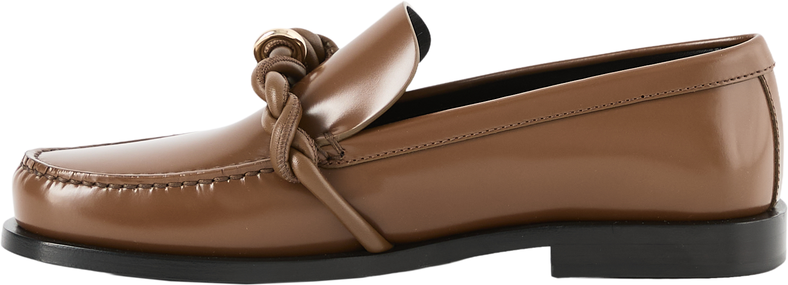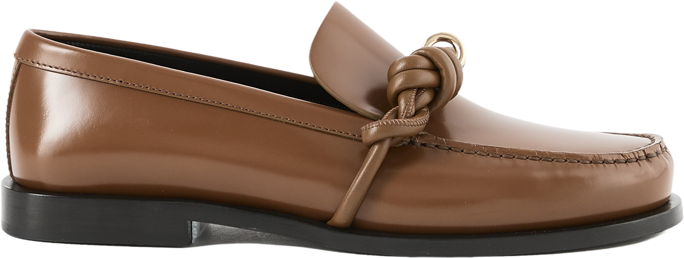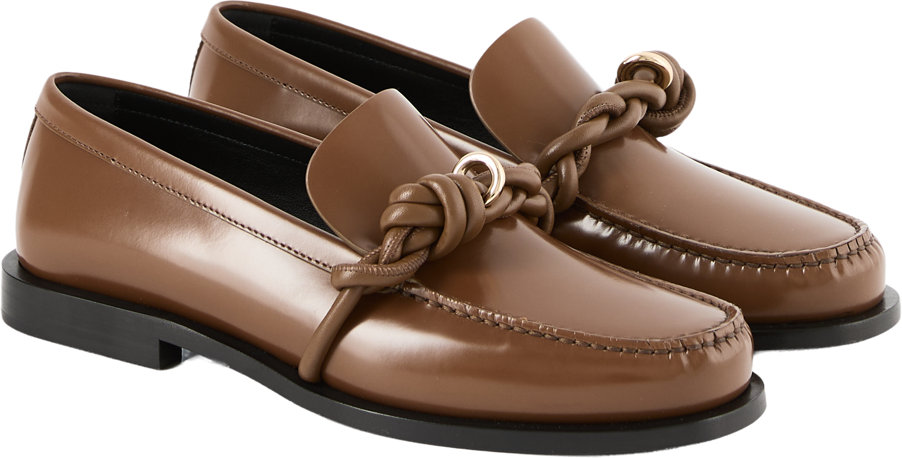 The 'Tangle' loafer in brown by JIL SANDER is made from calfskin and stands out with its hand-knotted detail and gold ring. The round toe, calfskin sole with injected rubber and insole with JIL SANDER logo stylishly round off the design.