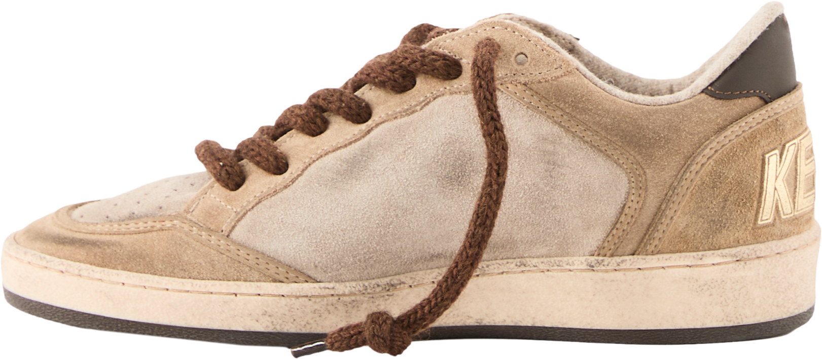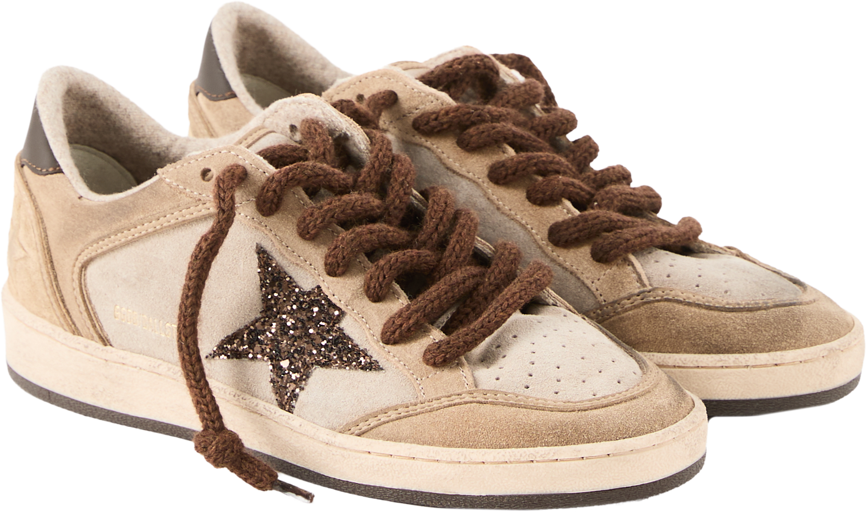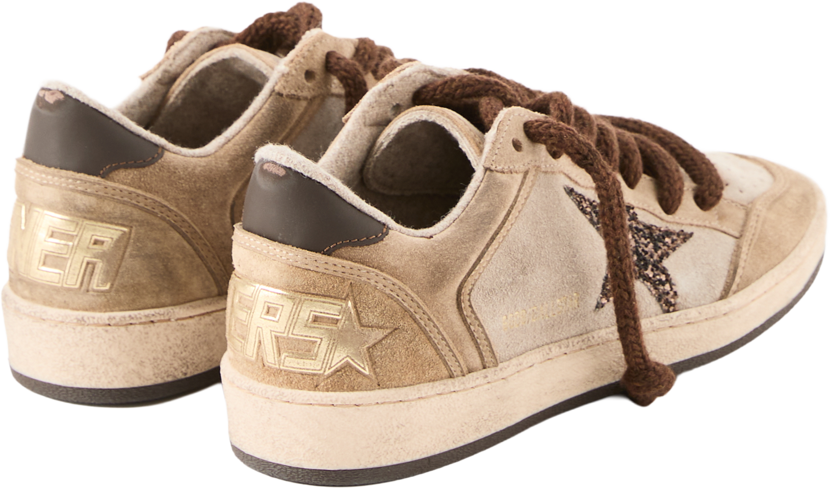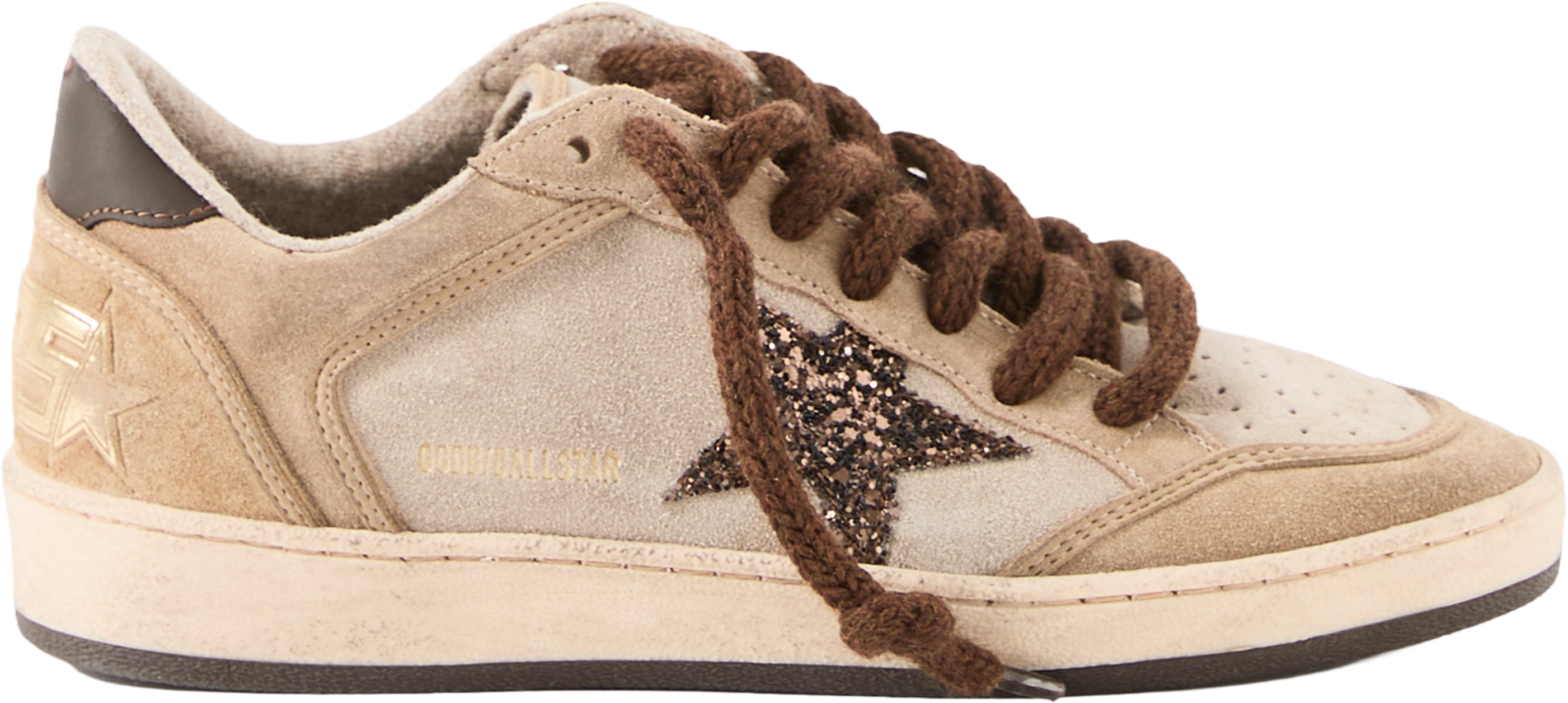 The 'Ballstar' trainers in beige by Golden Goose are made from calfskin and stand out with their brown glitter star. The round toe section, the glitter logo on the heel and the gold-coloured metallic leather logo on the side harmoniously round off the design.