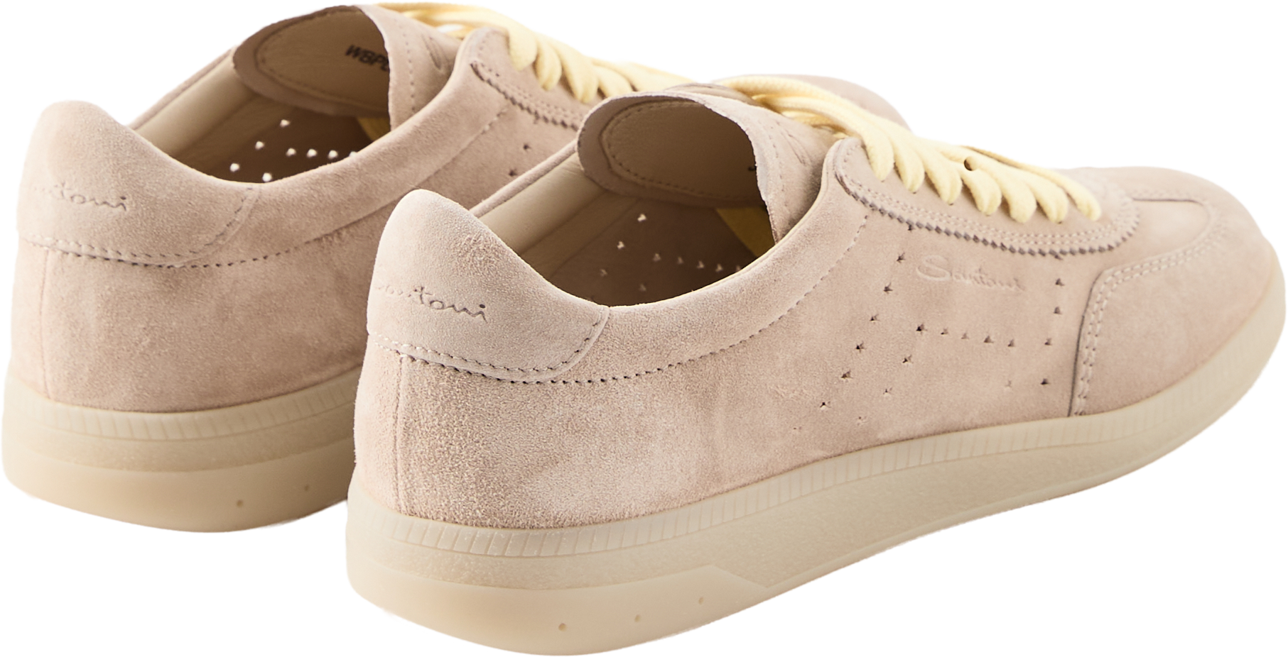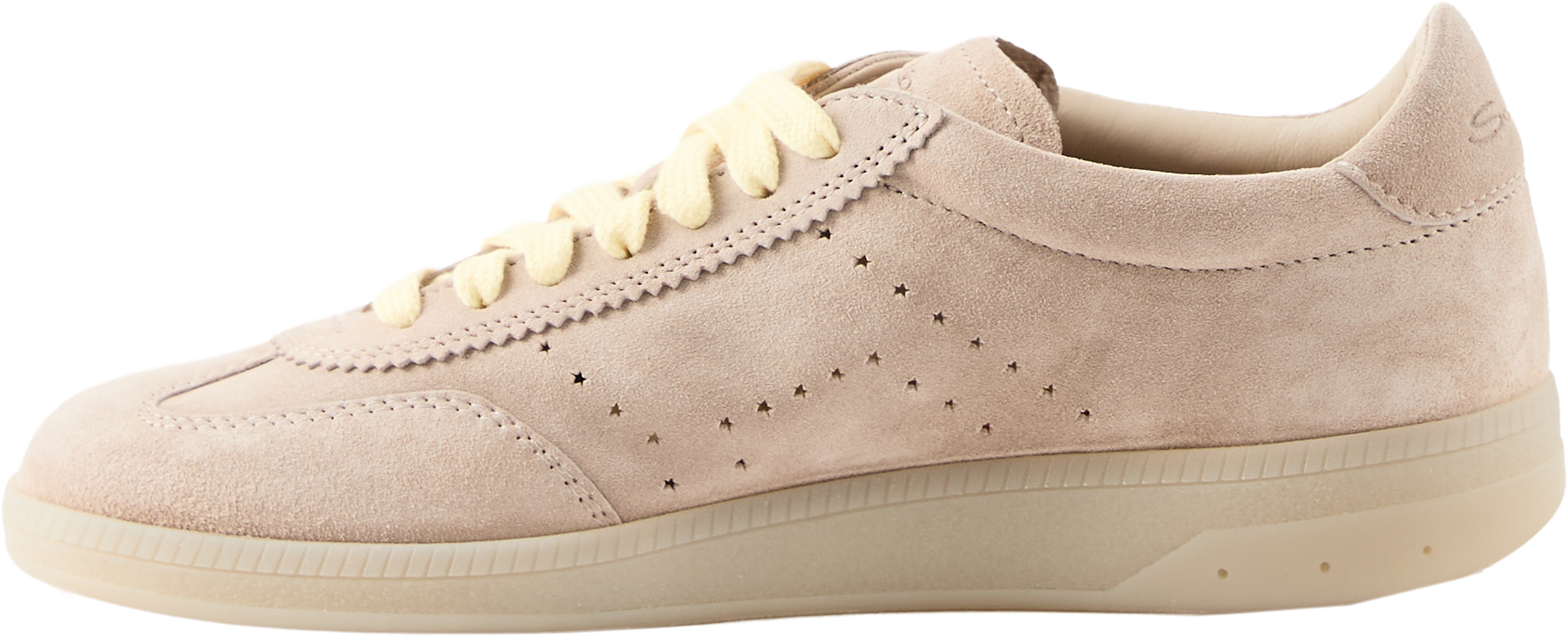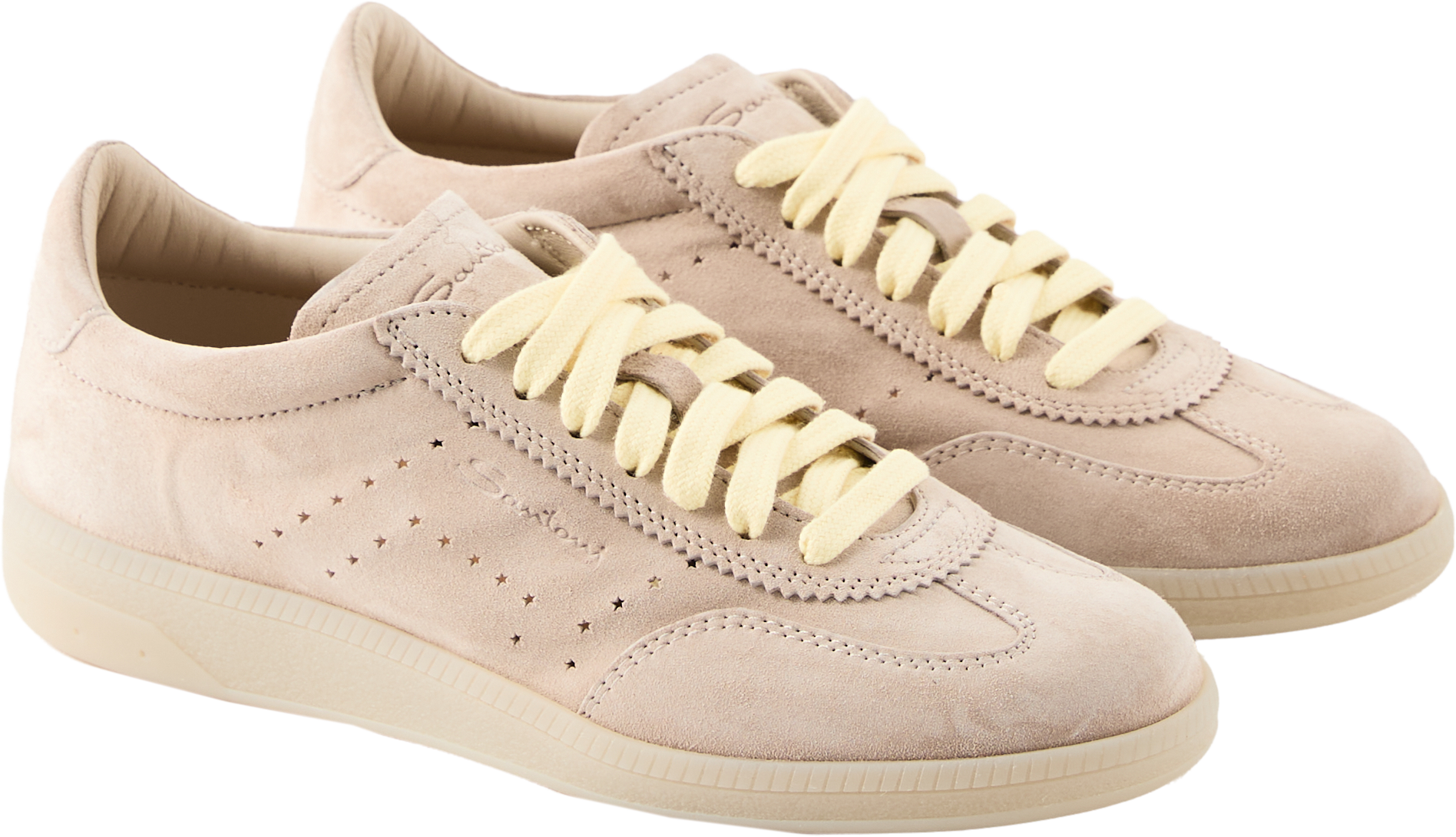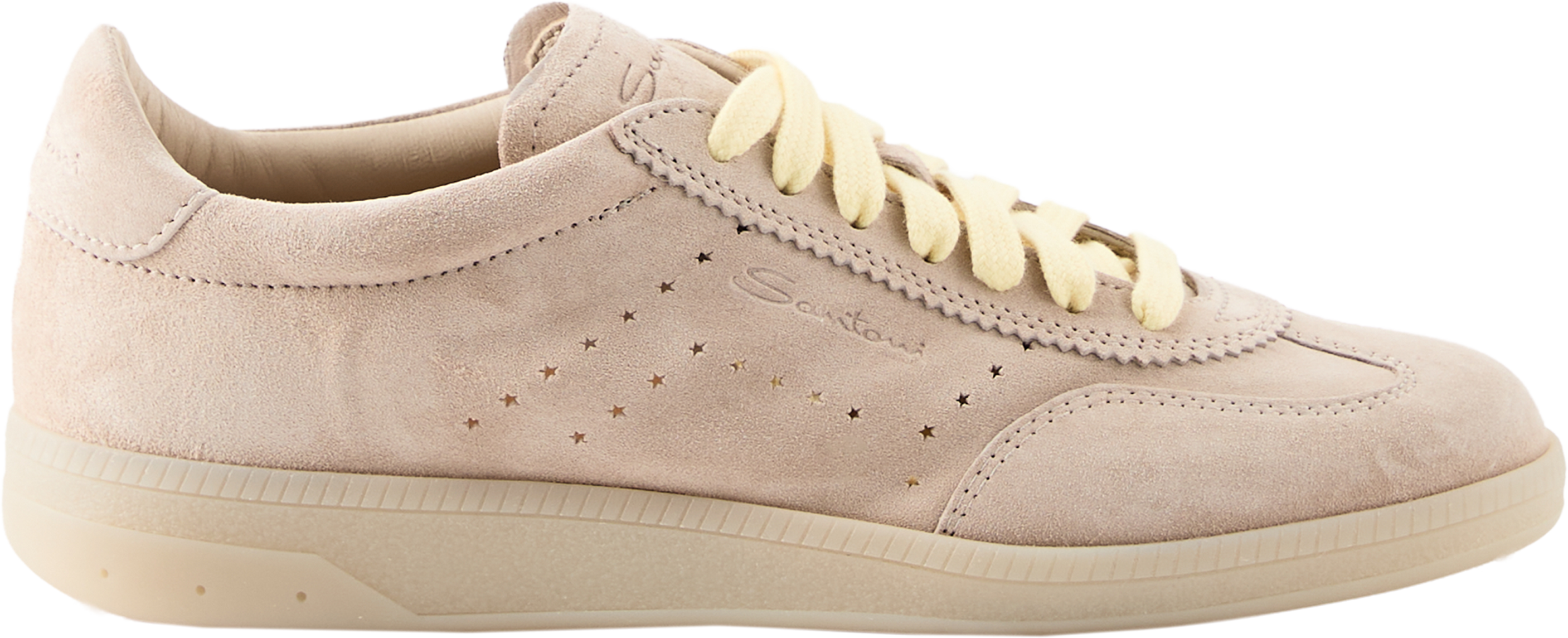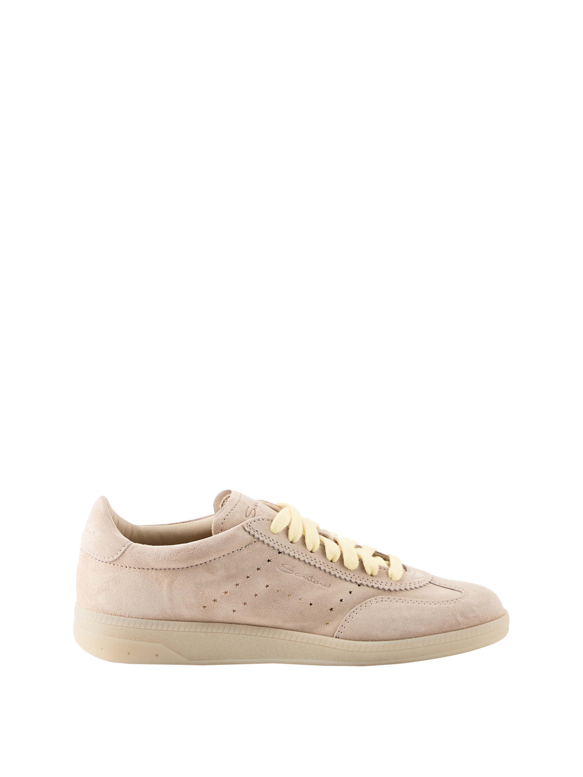 The 'Oly Pulse' trainers in beige by Santoni are made from suede and stand out with their star shapes on the sides. The rounded toe cap and slim silhouette give the model an elegant line. Coloured laces provide a stylish contrast, while additional laces offer variations on the look. The multiple logo engravings round off the sporty, luxurious design.