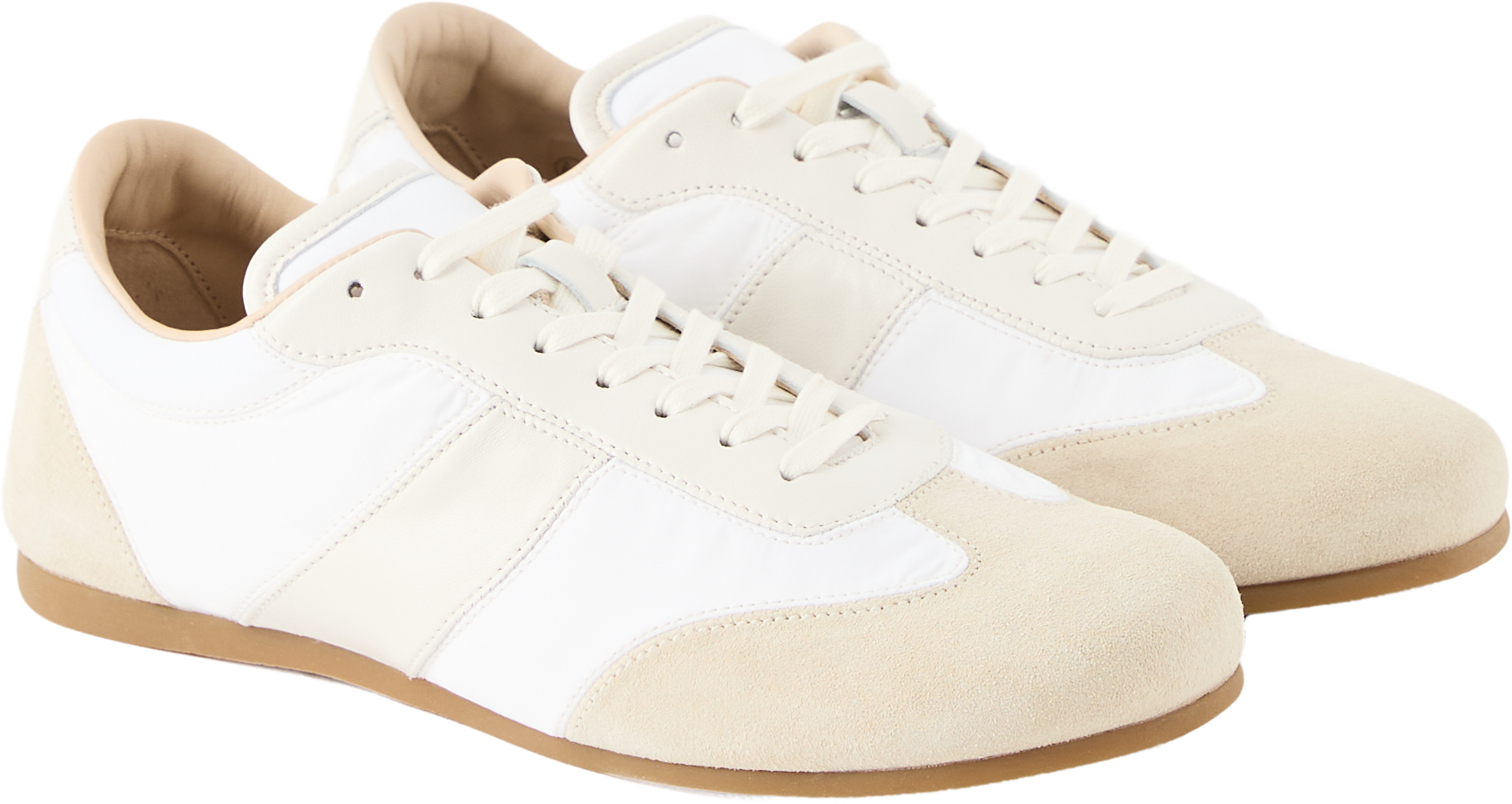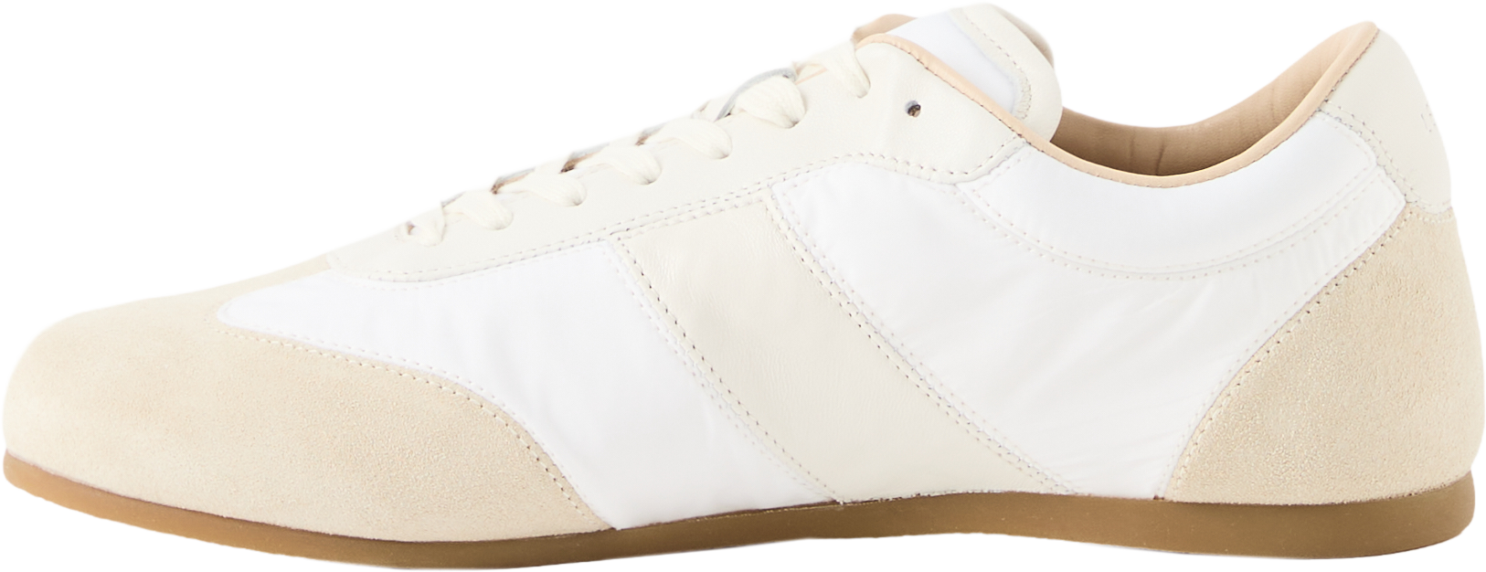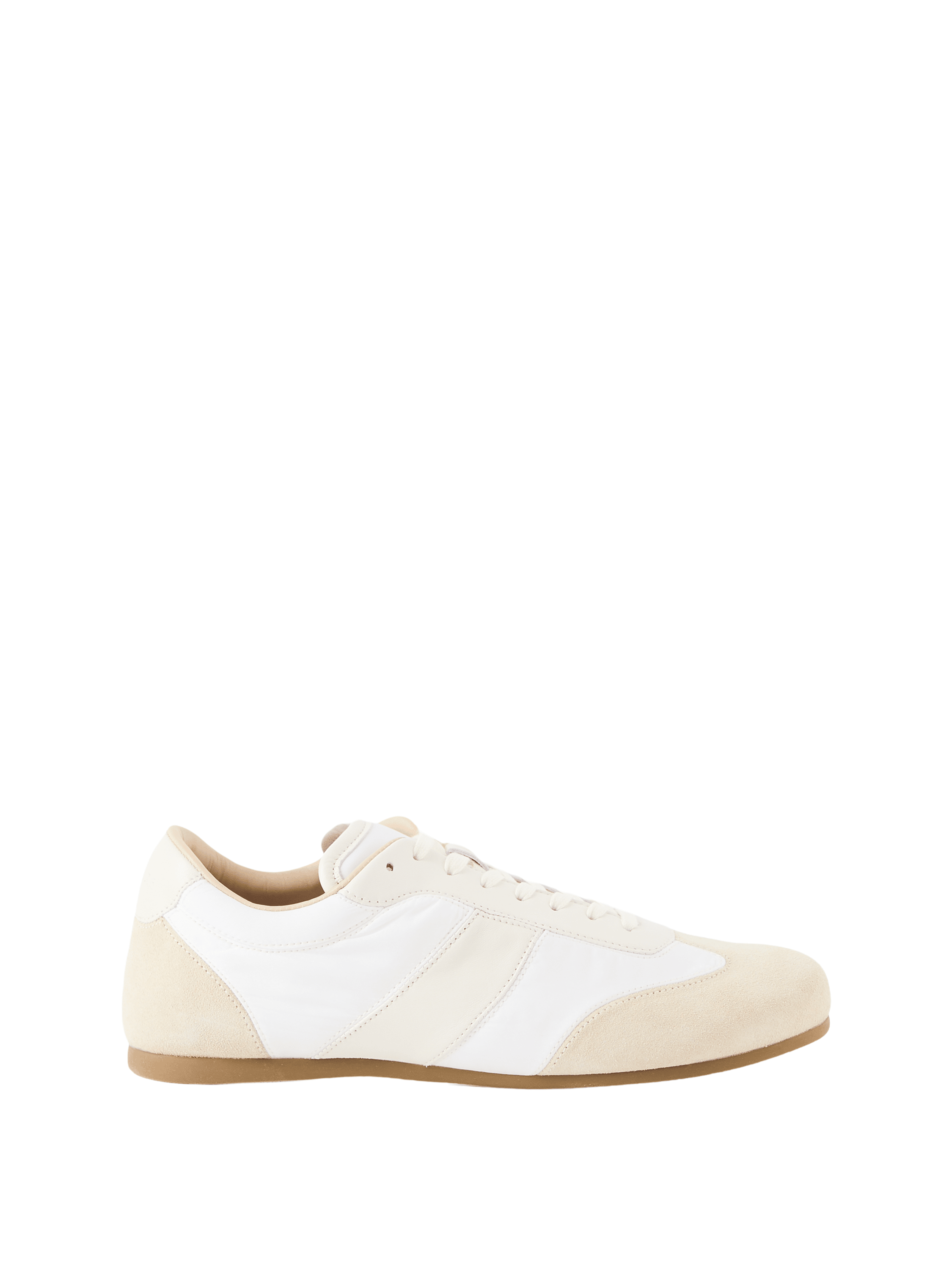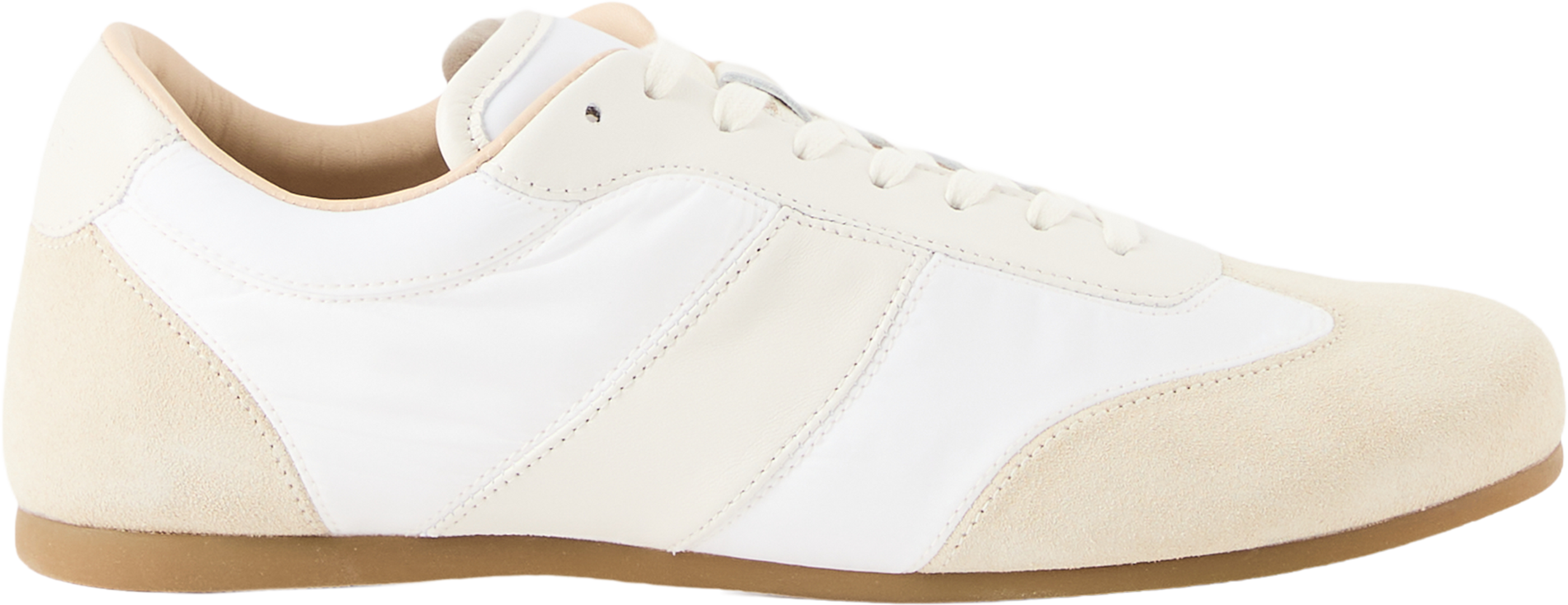 The 'Soft Runner' trainers in white by Lemaire are made from a blend of nappa suede and polyamide and impress with their round toe section. The cotton laces, decorative stitching, padded inserts and softly padded tongue emphasise the design.