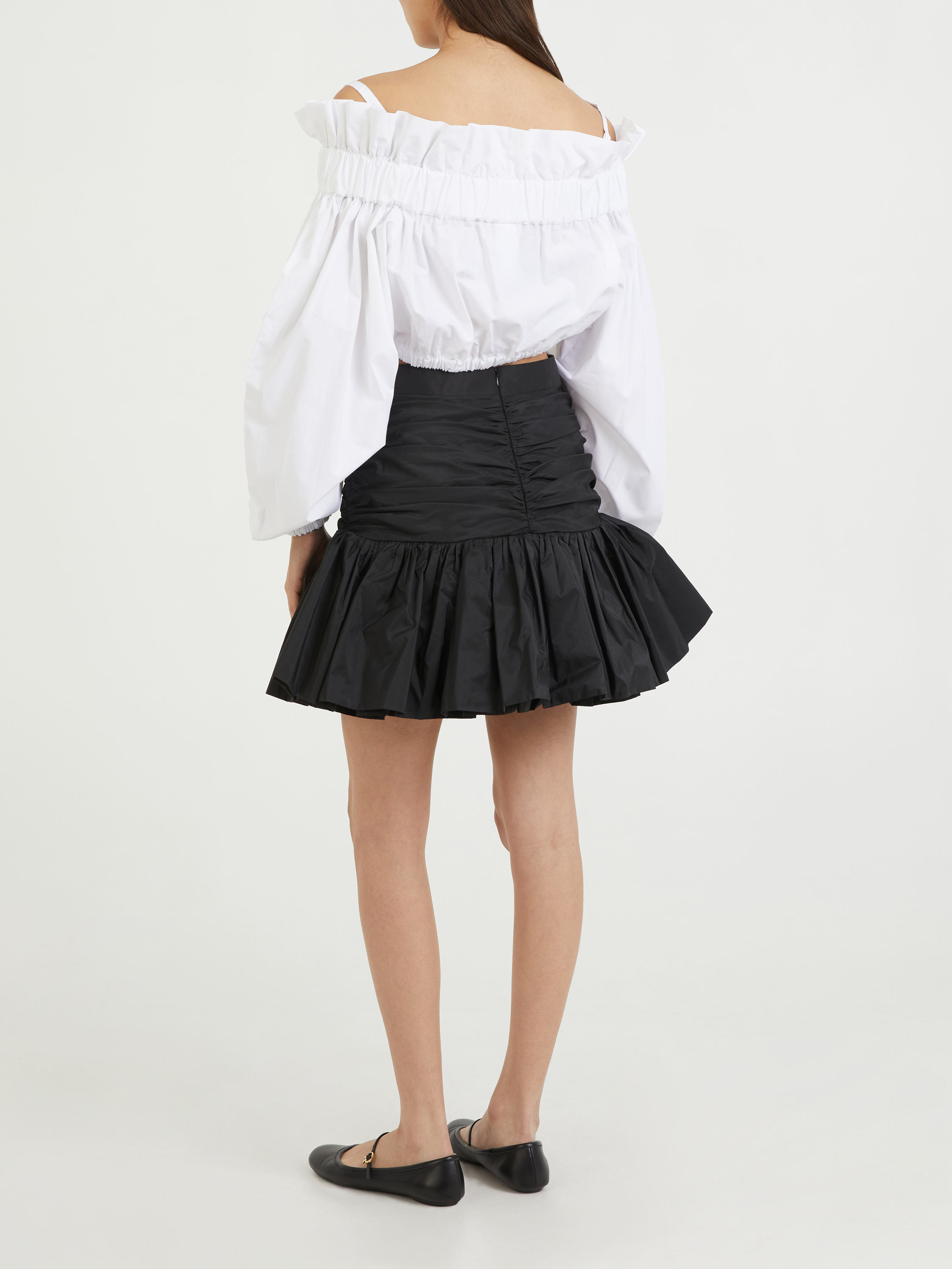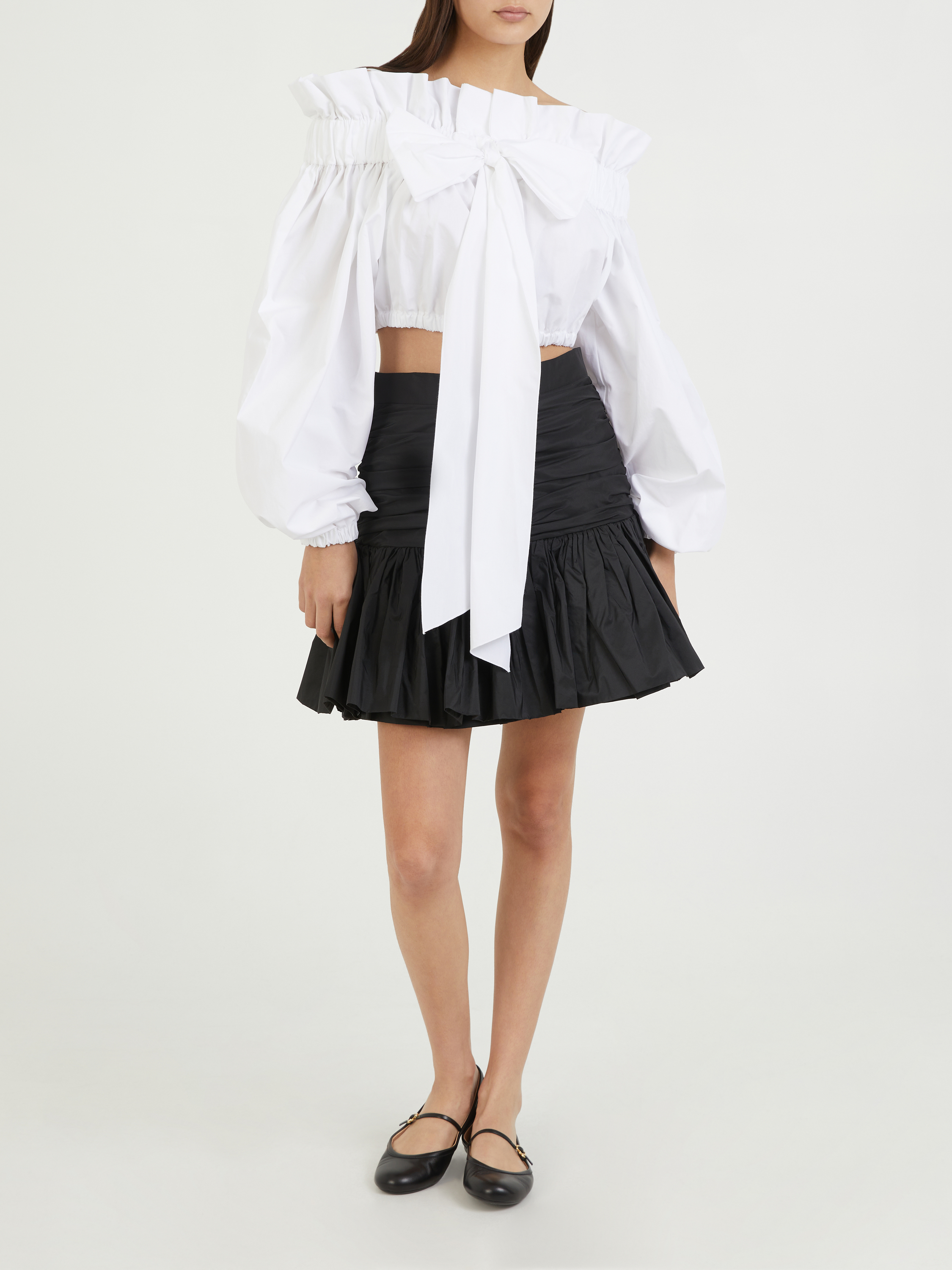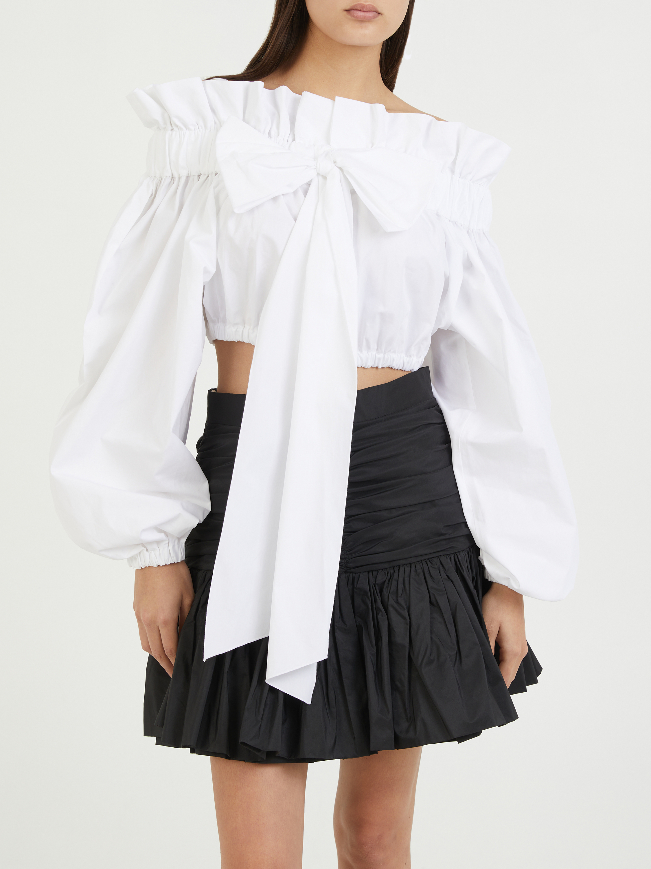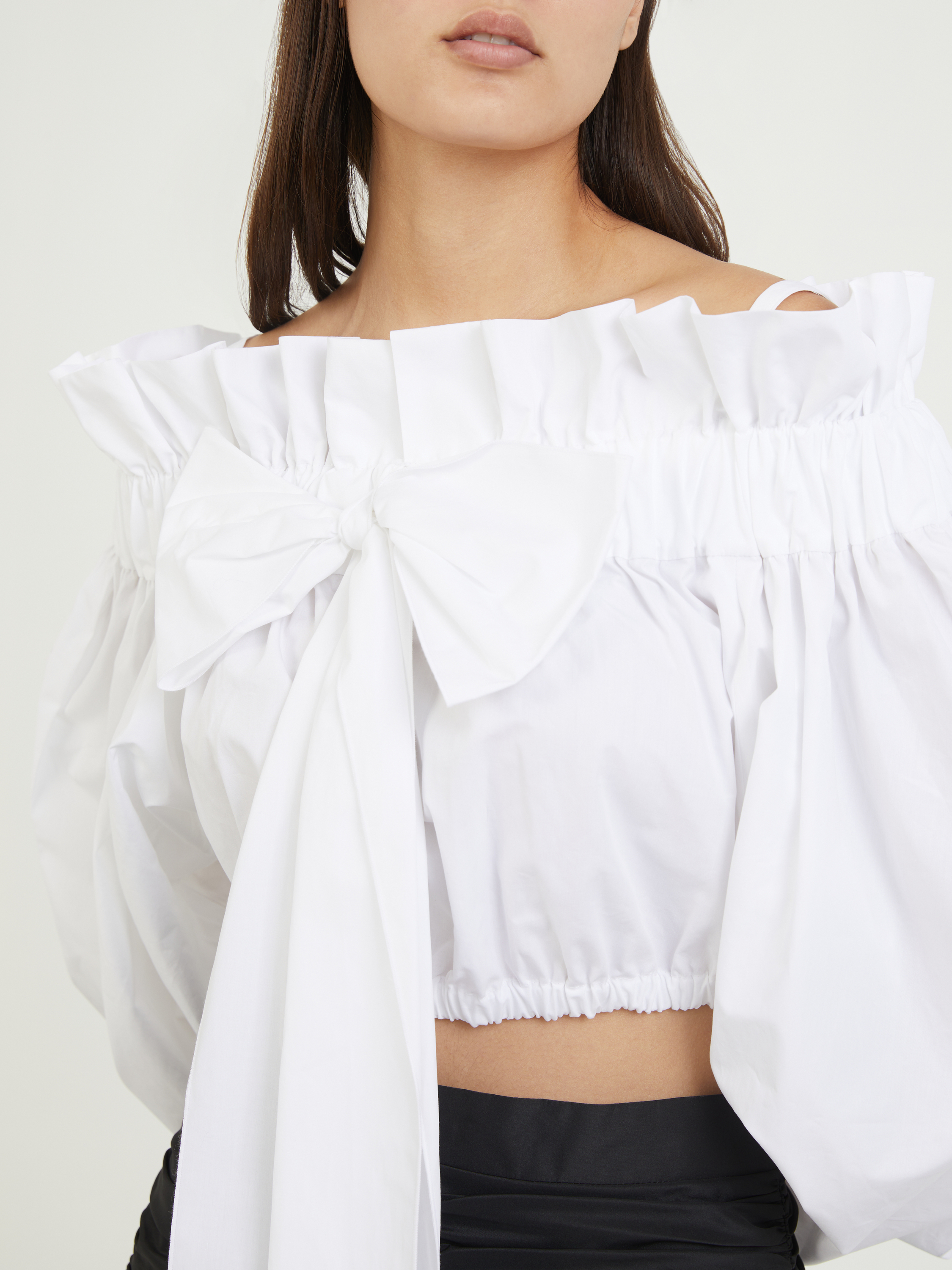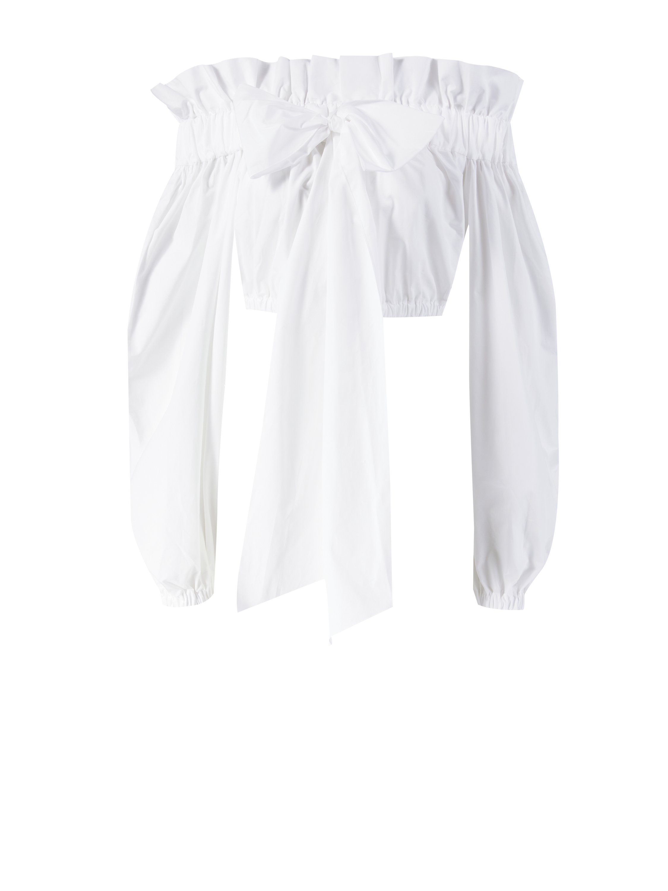 Das Bustiertop in Weiß von PATOU wurde aus reiner Baumwolle gefertigt und besticht durch die kurze Passform. Die langen, voluminösen Ärmel, die frontale Schleife und der schulterfreie Ausschnitt zeichnen dieses romantische Design aus.