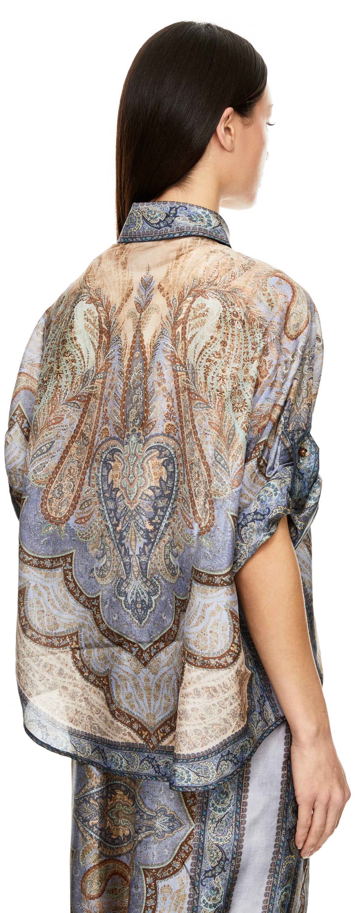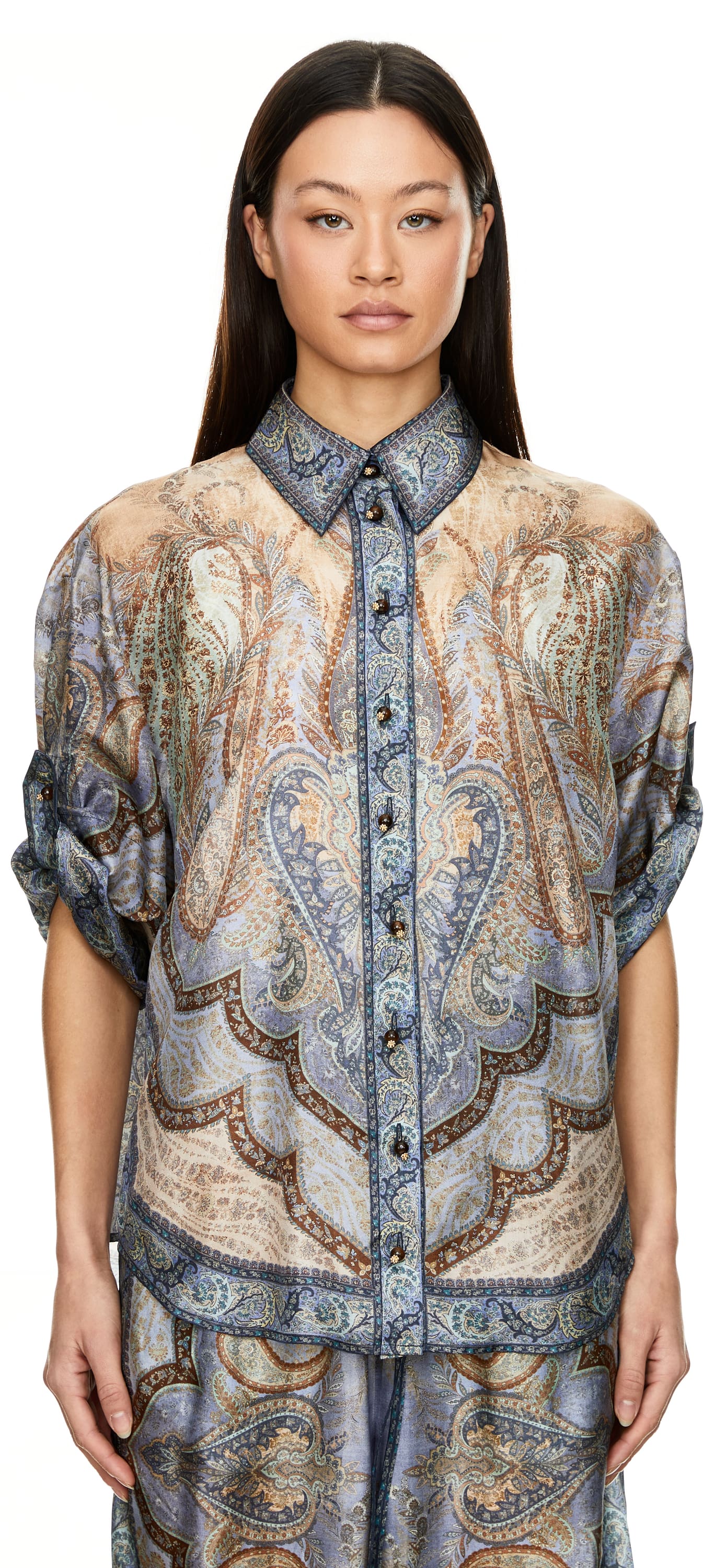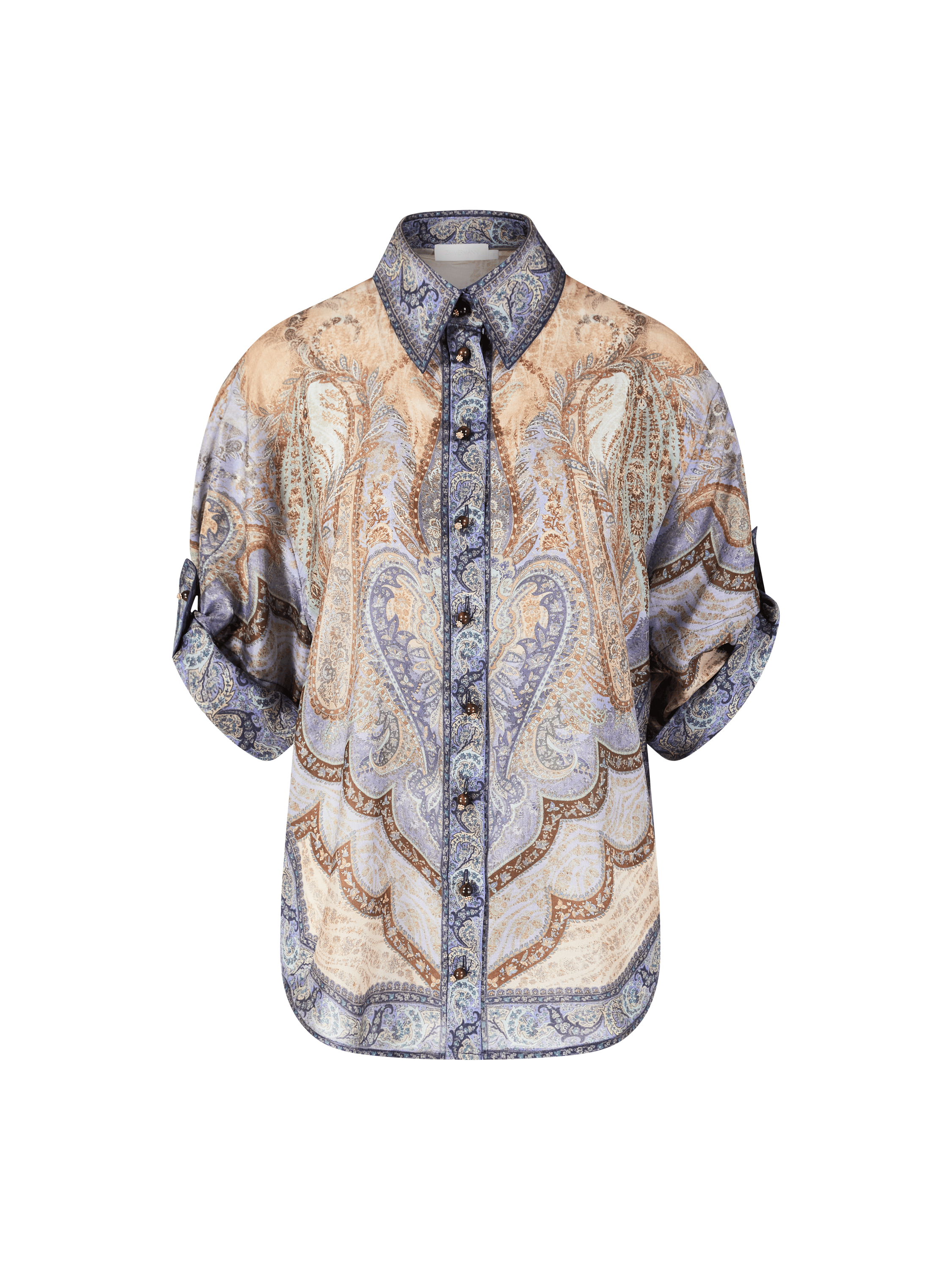 Die Bluse 'Wanderlust' in Hellgrün von Zimmermann wurde aus Ramie gefertigt und besticht durch das Wallpaper Floral Mint-Muster. Der Stehkragen, der Muschelsaum, die Rouleau-Knöpfe sowie die langen Ärmel mit elastischen Bündchen zeichnen dieses charmante Modell aus.
