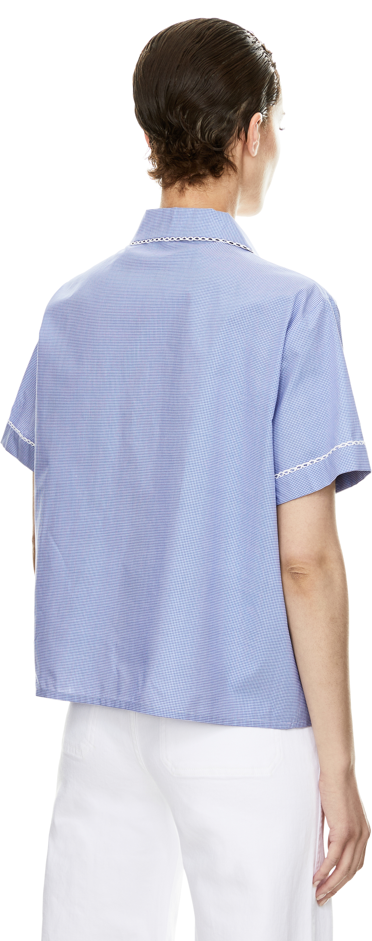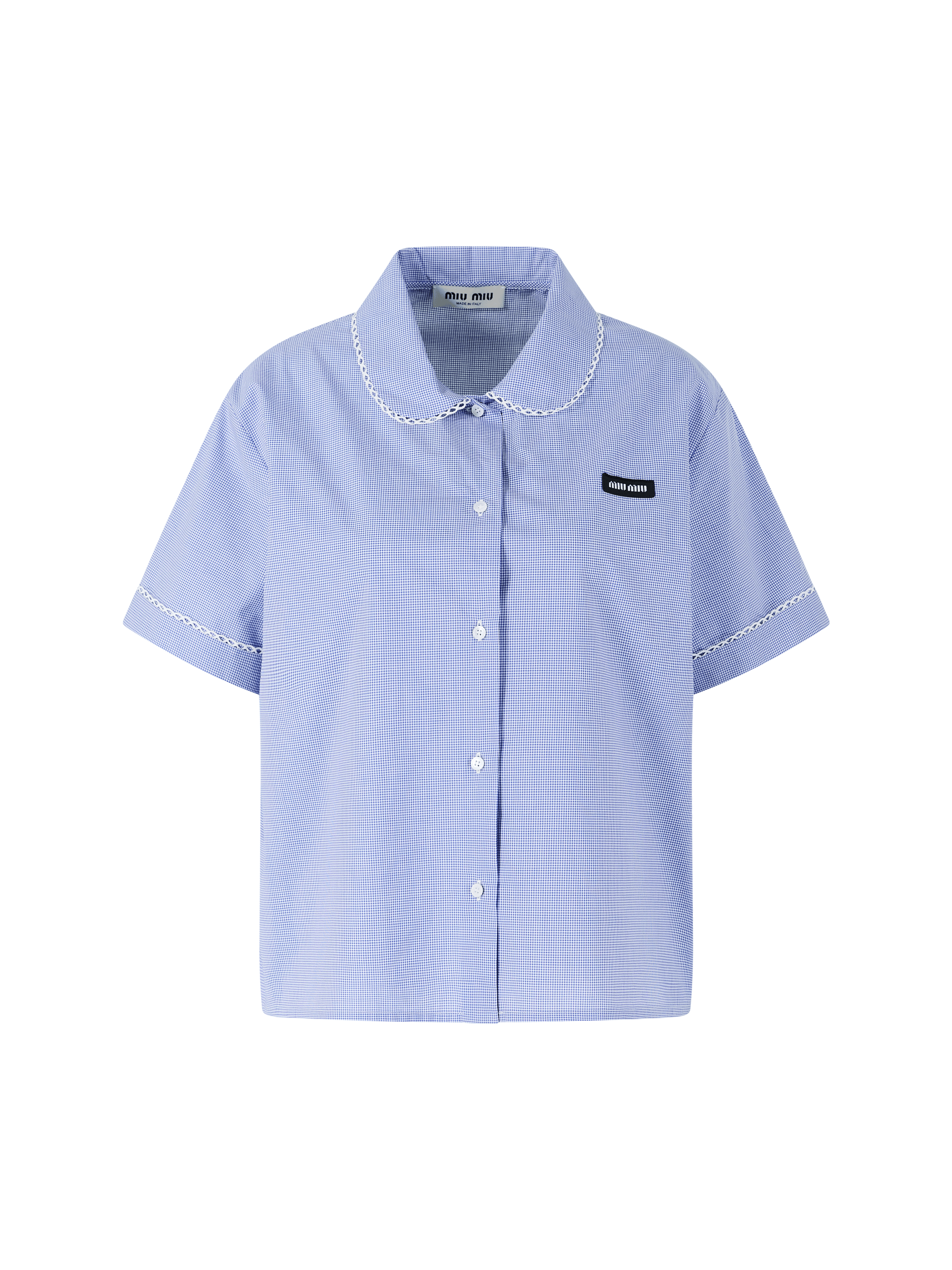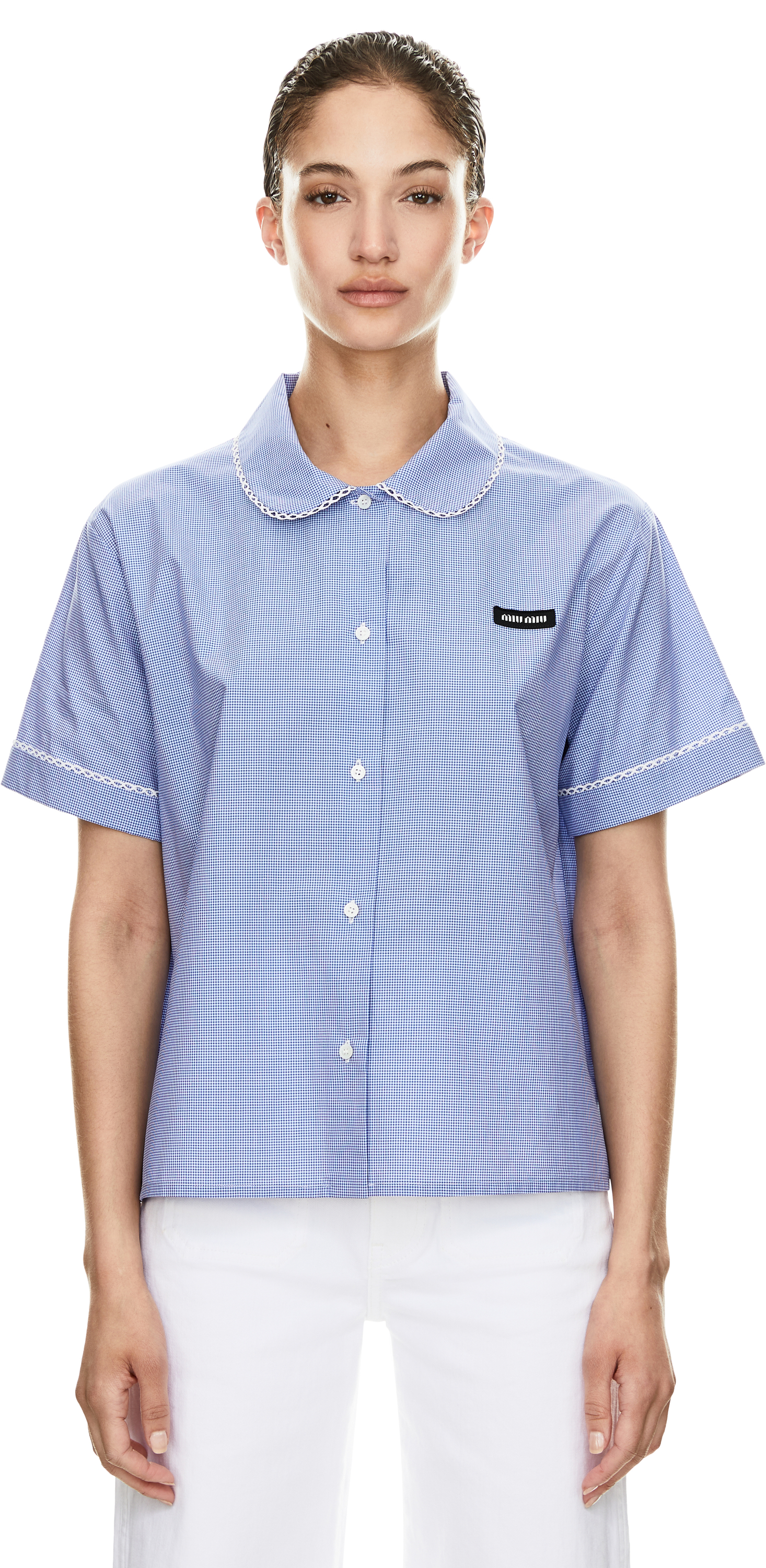 Dieses Hemd in Blau von miu miu wurde aus hochwertiger Baumwollpopeline gefertigt und besticht durch die gerade Passform. Die elegante Stickerei am Kragen und an den Ärmeln, die durchgehende Knopfleiste sowie das gestrickte Logo-Etikett auf der Vorderseite verleihen dem Design eine besondere Note.