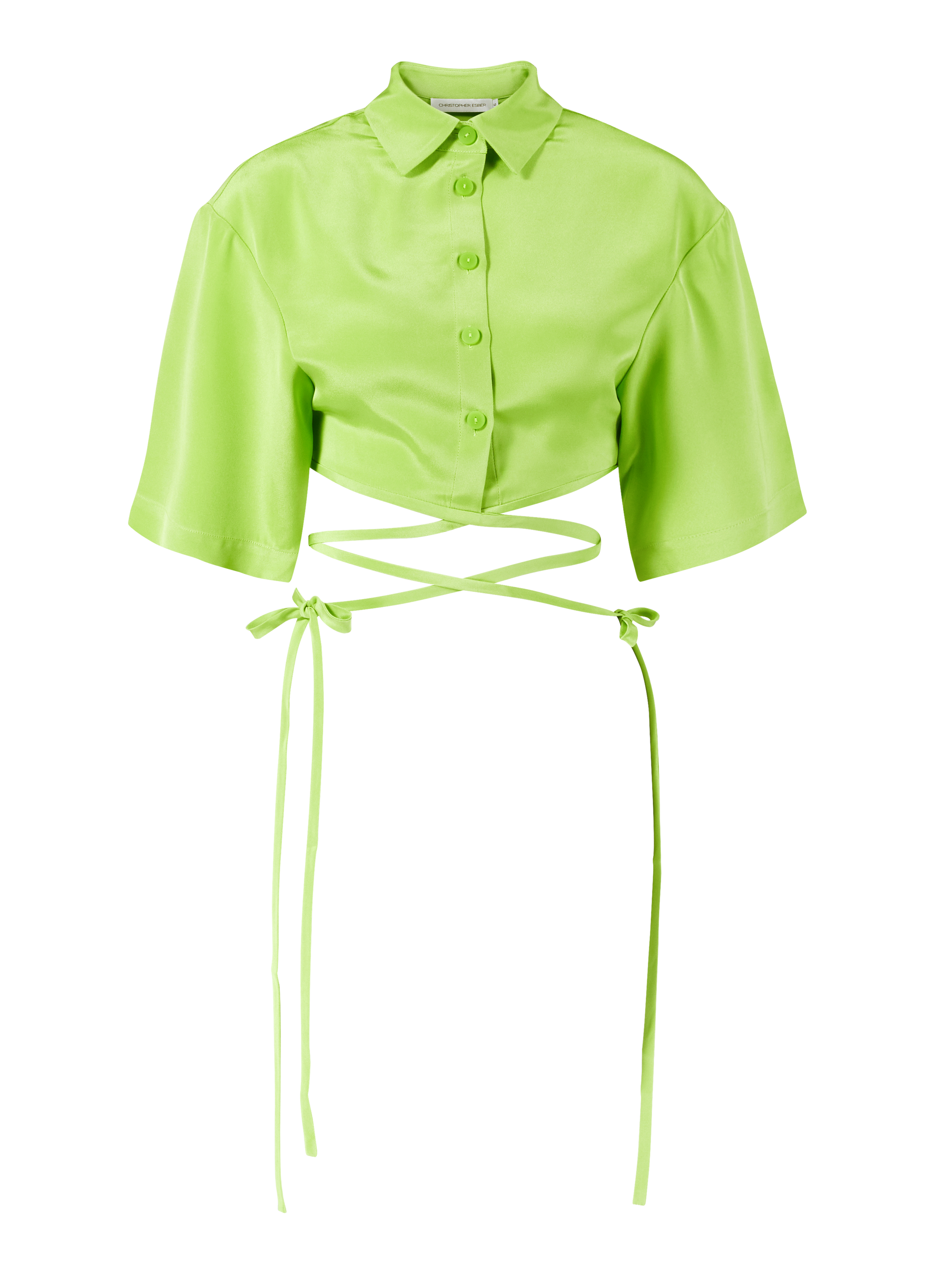 Diese Bluse in Grün von CHRISTOPHER ESBER wurde aus reiner Seide gefertigt und besticht durch das Binde-Detail. Das Design wird durch den klassischen Kentkragen und der Knopfleiste perfektioniert, während die verkürzte Silhouette den Look vollendet.