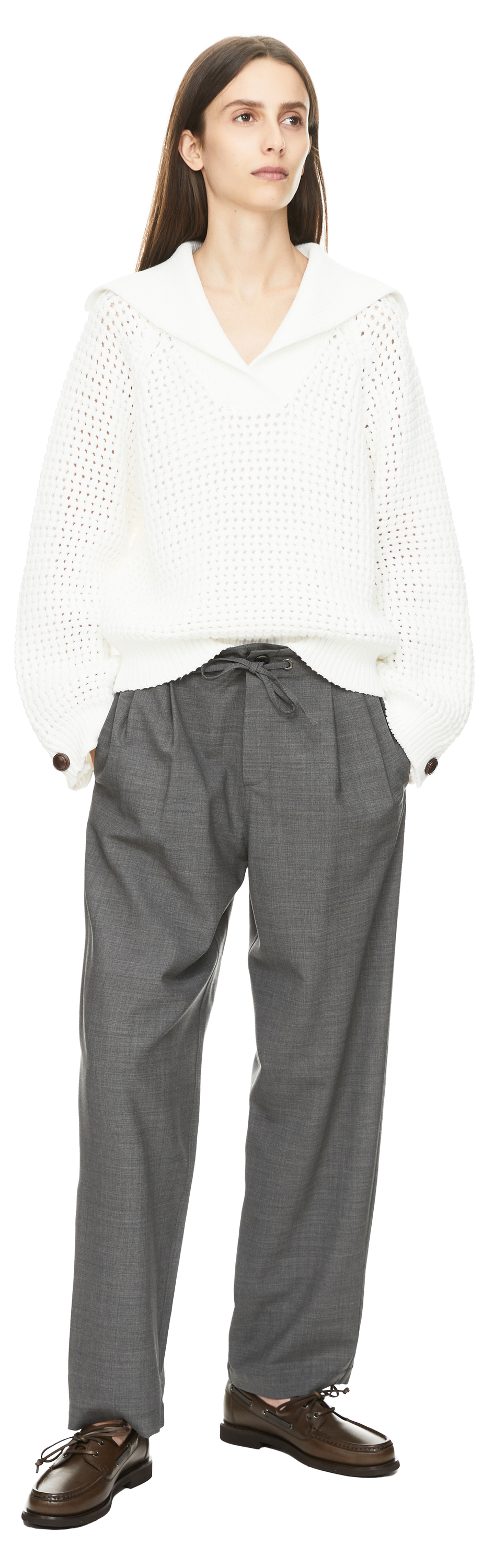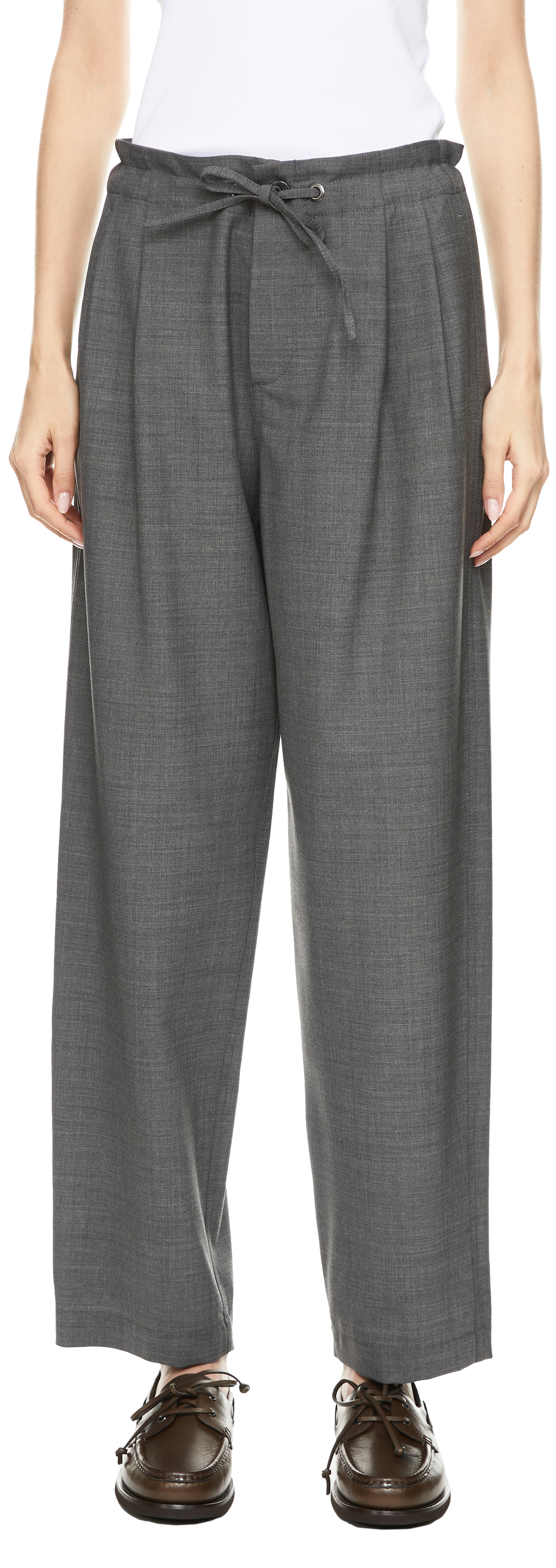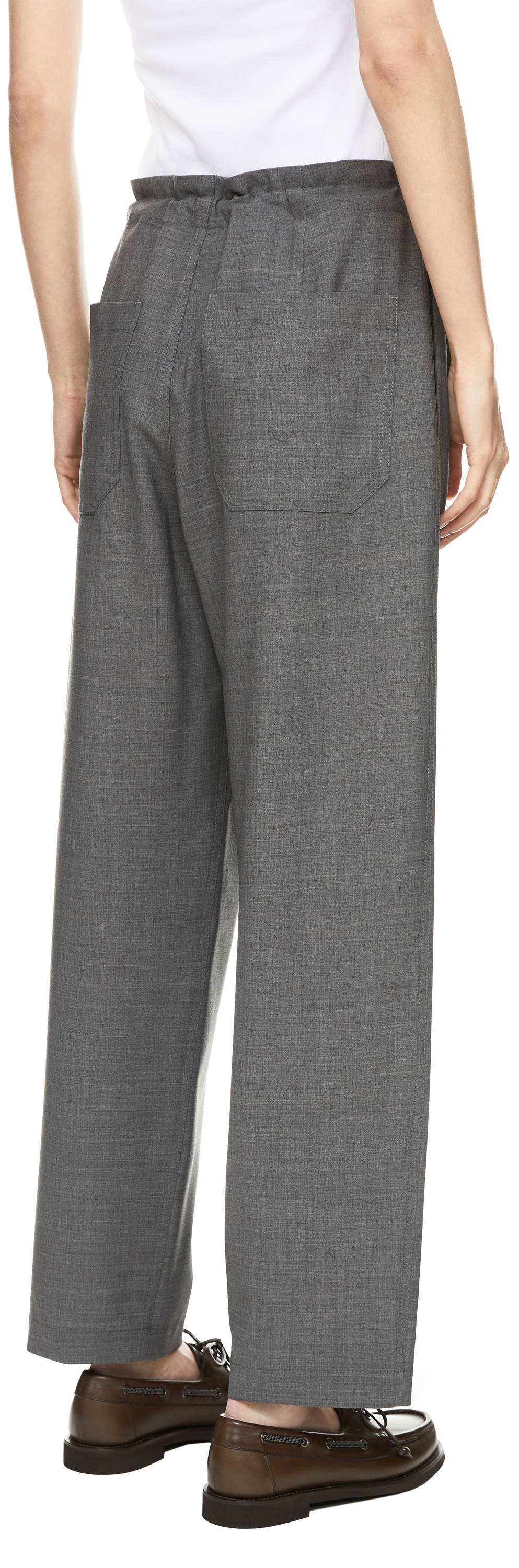 Diese Hose in Grau von Brunello Cucinelli wurde aus einer hochwertigen Schurwollmischung gefertigt und besticht durch die melierte Optik. Das gerade Bein und der Kordelzug verleihen dem Modell eine legere Eleganz. Seitliche Eingrifftaschen und aufgesetzte Gesäßtaschen runden das Design stilvoll ab.