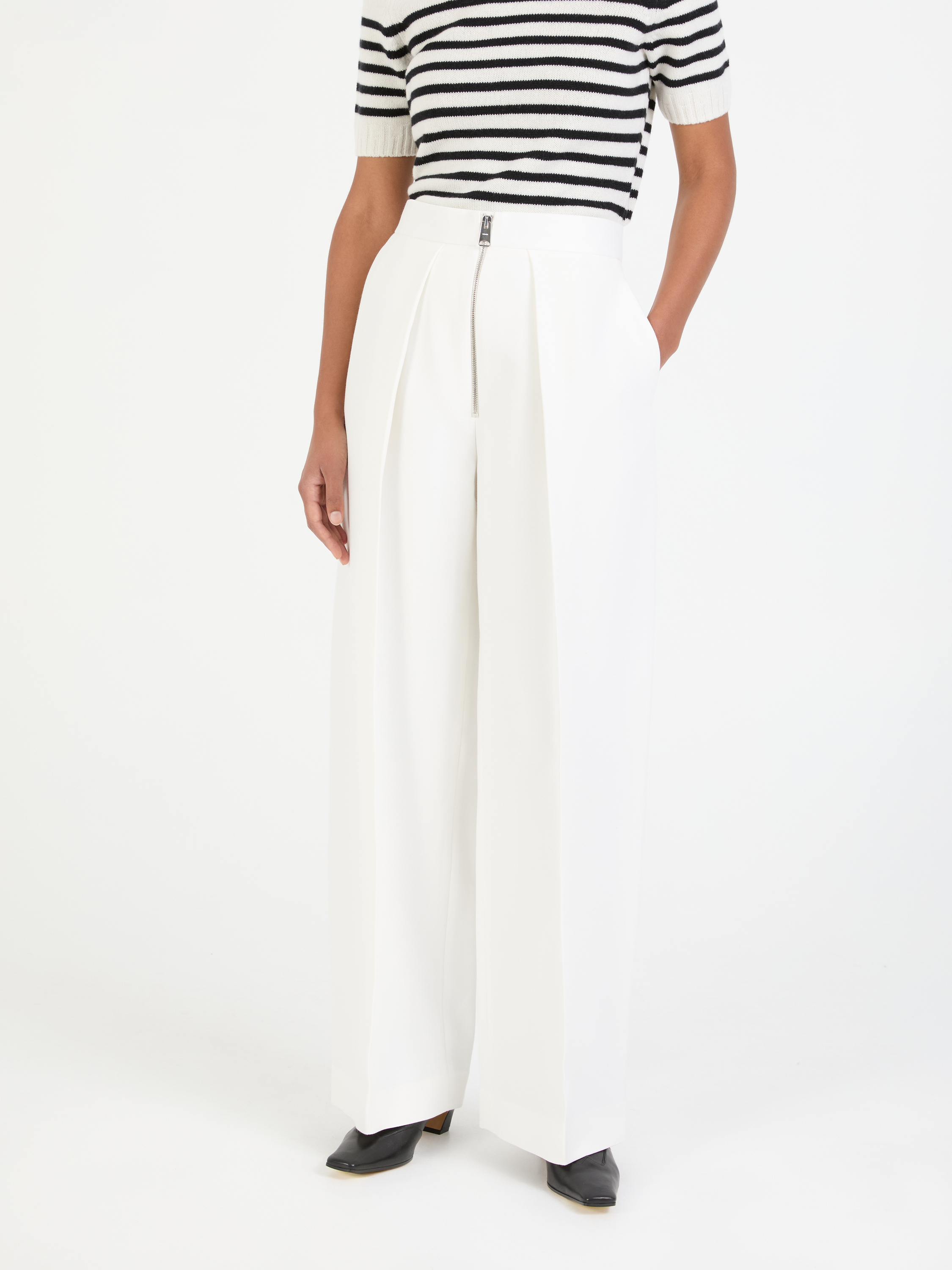 Die Hose 'Marine' in Crème von Khaite wurde aus einem Viskose-Gemisch gefertigt und besticht durch das weite Bein. Die hohe Leibhöhe und die Bügelfalten zeichnen dieses moderne Modell aus. Abgerundet wird dieser Look von einem silberfarbenen Reißverschluss.