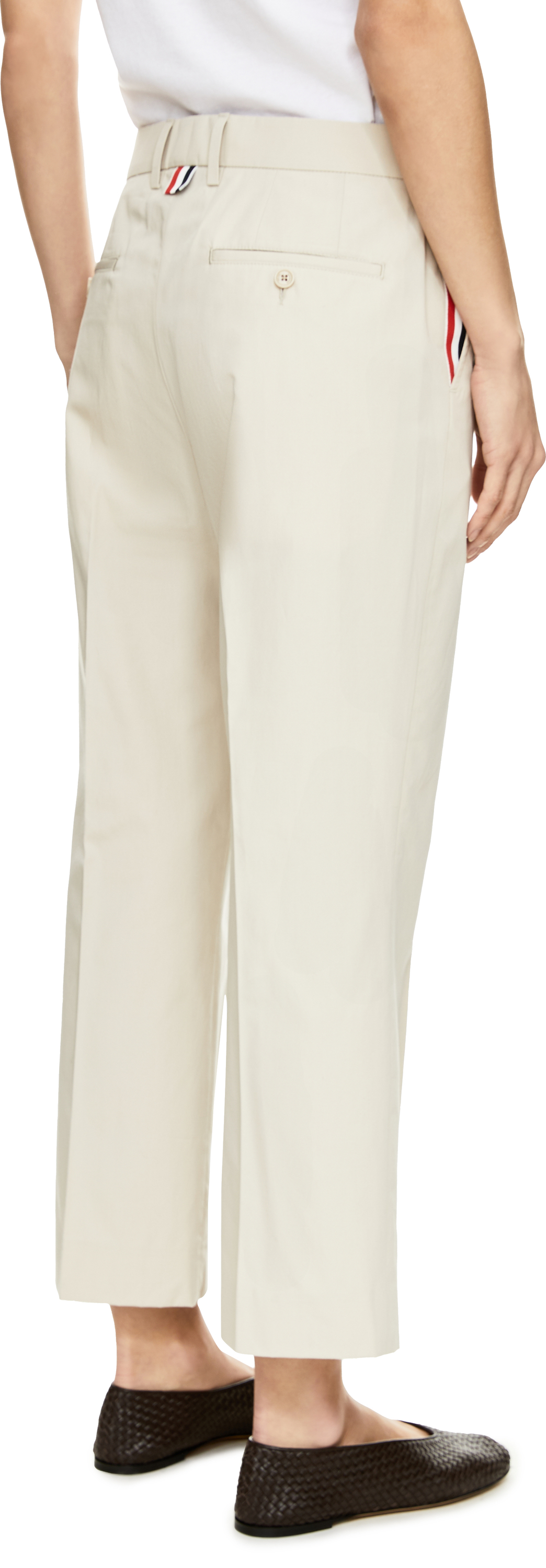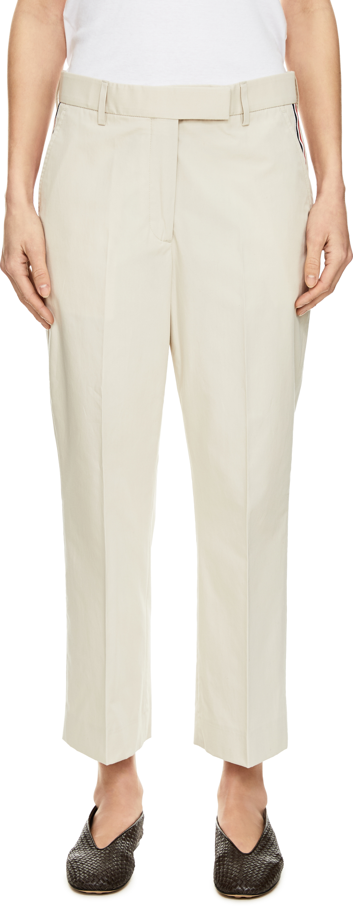 Diese Hose in Beige von Thom Browne wurde aus hochwertiger Baumwolle gefertigt und besticht durch ihr klassisches Design. Das leicht schmal zulaufende Bein wird durch die Bügelfalten entlang des Beins dezent akzentuiert. Charakteristische Details wie die gestreifte Ripsbandschlaufe an den Seitentaschen und auf der Rückseite setzen subtile Markenakzente und zeichnen das Modell aus.