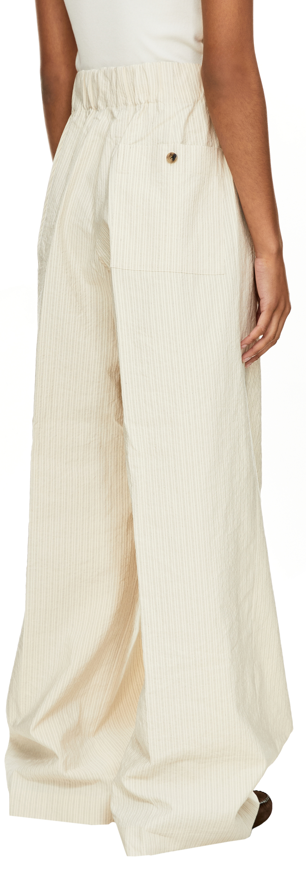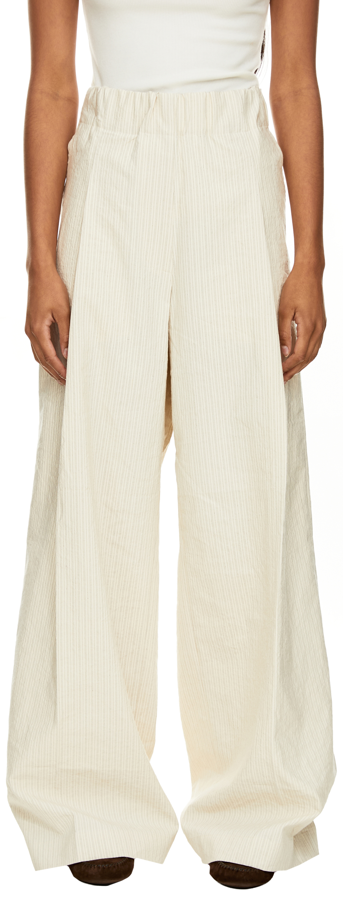 Die Hose 'Pila' in Ecru von Dries van Noten wurde aus einer hochwertigen Mischung aus Baumwolle und Papiergarn gefertigt und besticht durch elegante Nadelstreifen. Das weite, ausgestellte Bein sorgt für eine moderne Silhouette, die durch dezente Bundfalten akzentuiert wird. Der elastische Bund mit innenliegendem Kordelzug sorgt für einen idealen Sitz und angenehmen Tragekomfort.