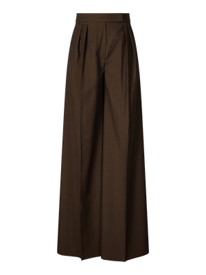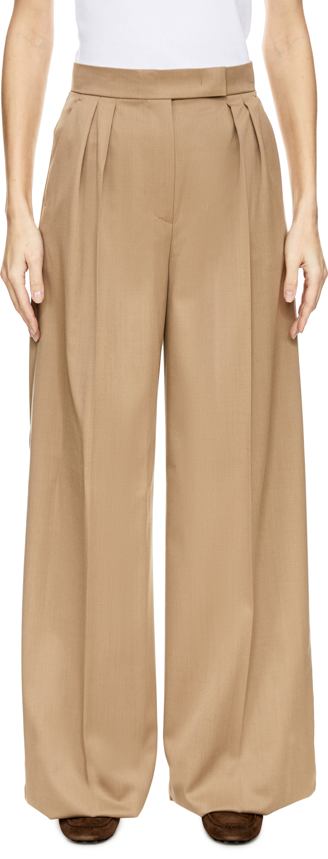 Die Hose 'Quorum' in Beige von Max Mara wurde aus hochwertiger Schurwolle gefertigt und besticht durch das weite, leicht ausgestellte Bein. Die hohe Leibhöhe wird durch dekorative Bundfalten betont, die dem Modell eine elegante Silhouette verleihen.