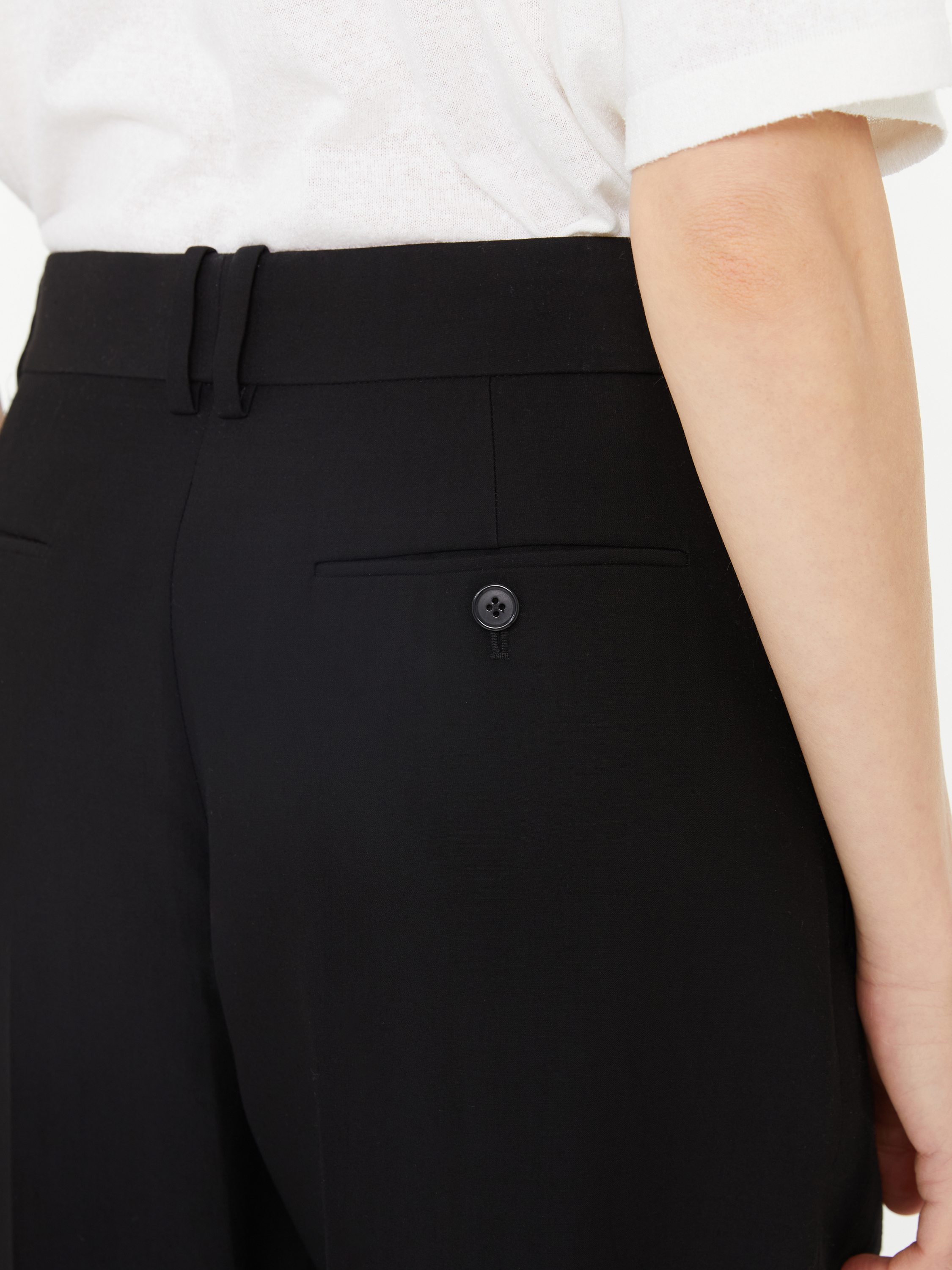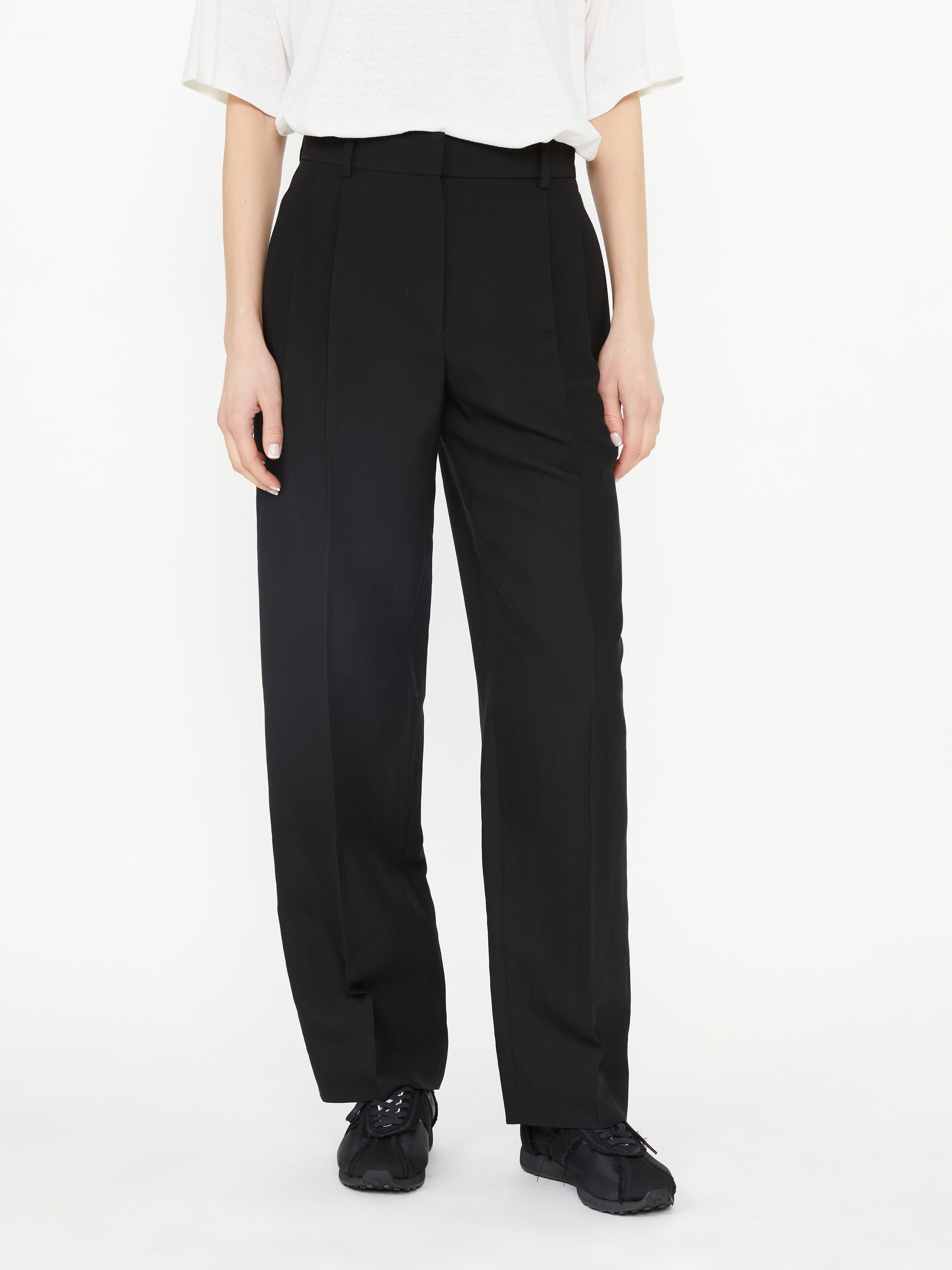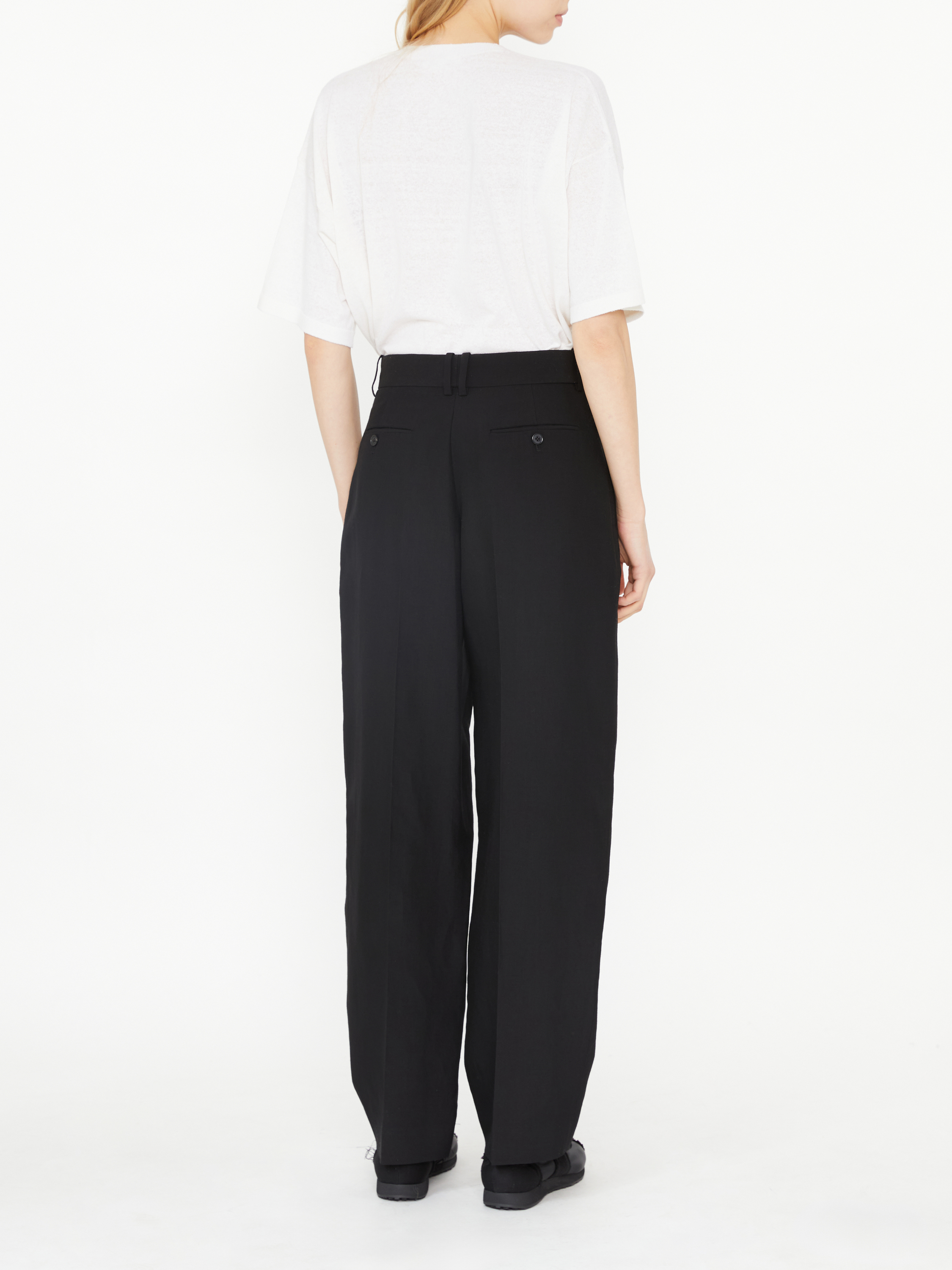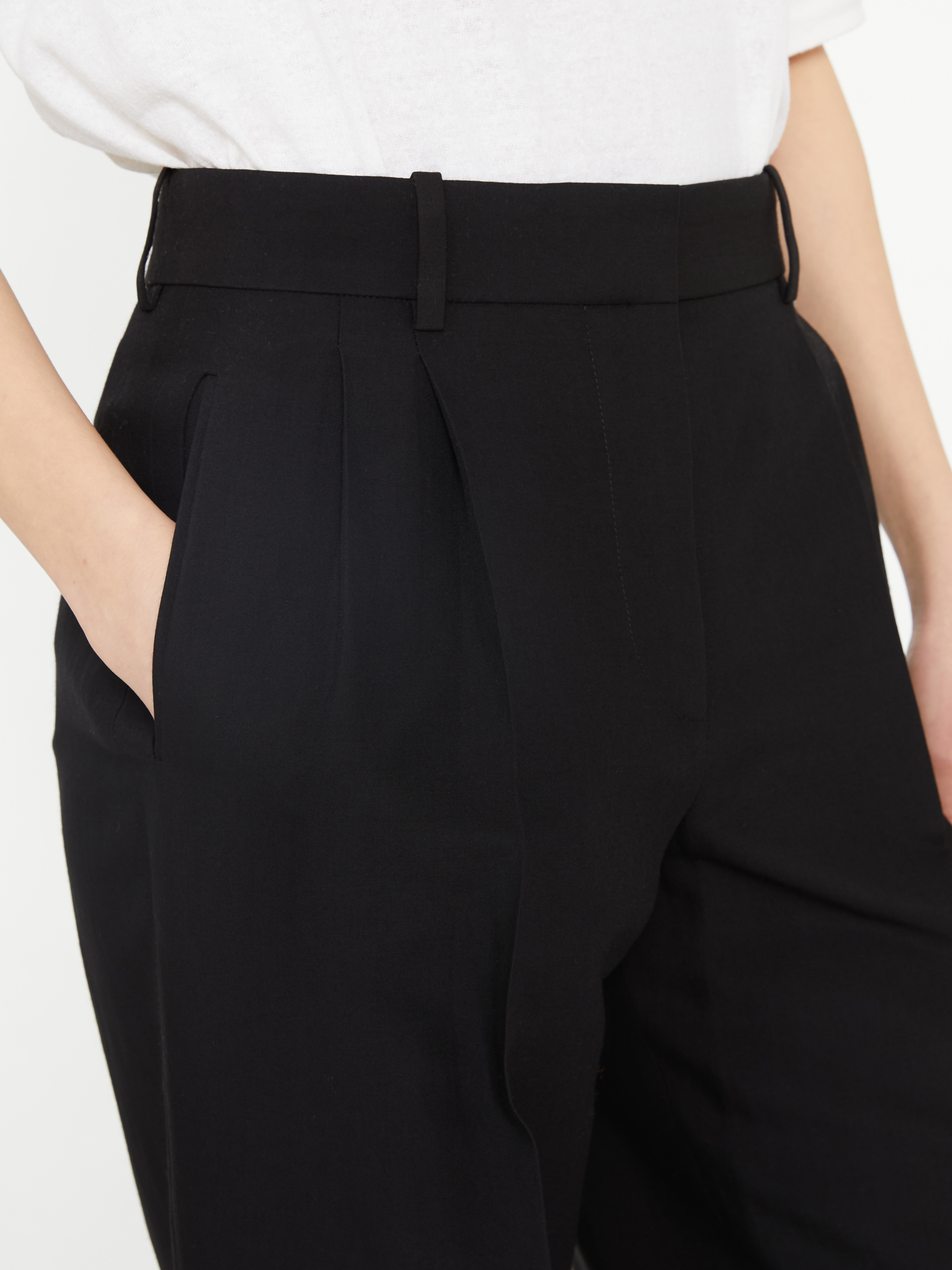 Die Hose 'Lilas Pant' in Schwarz von The Row wurde aus einer hochwertigen Woll-Leinenmischung gefertigt und besticht durch die weite Passform. Das gerade Bein und die Bundfalten zeichnen das Design aus.