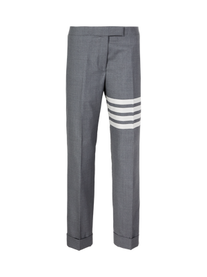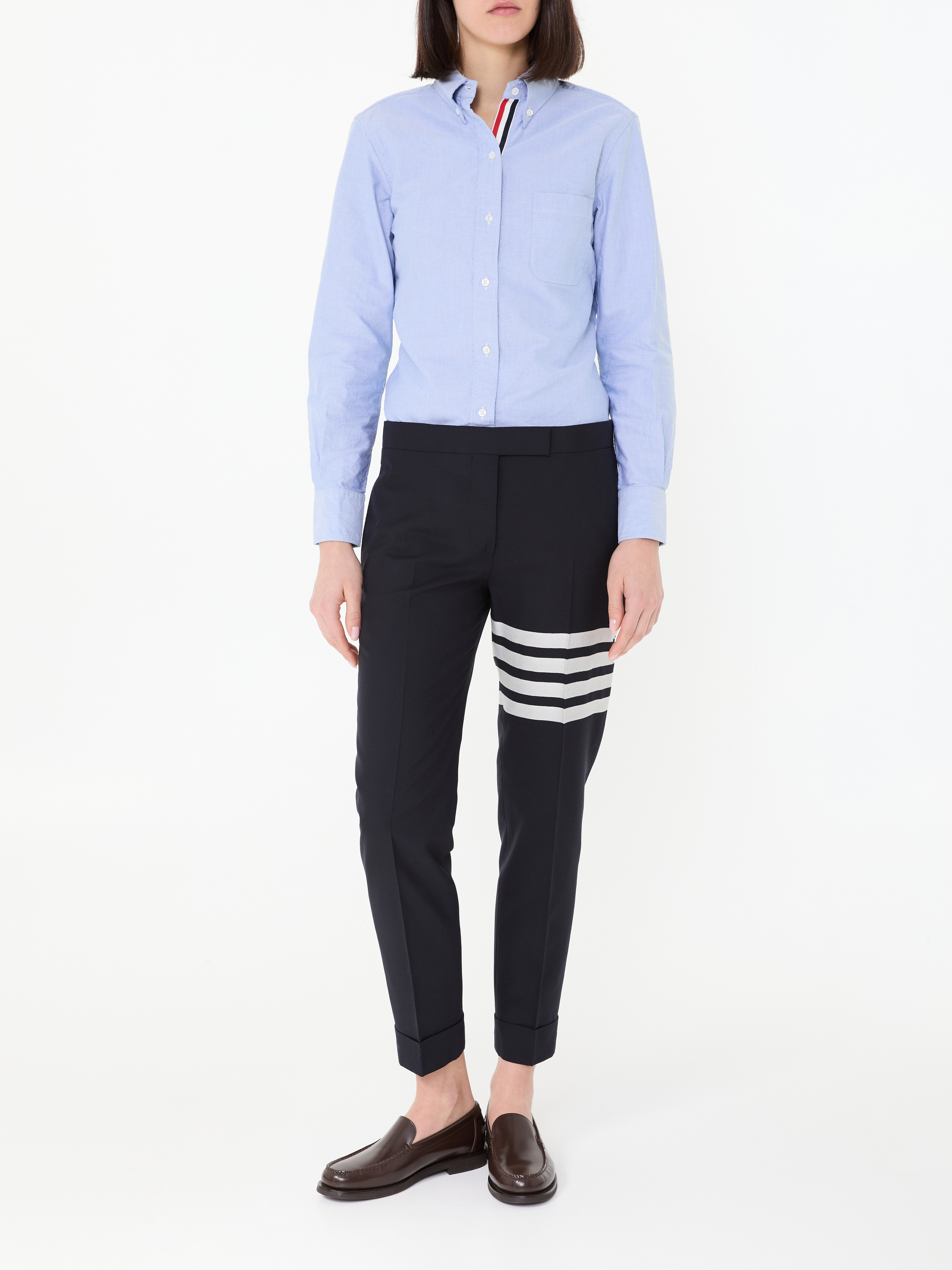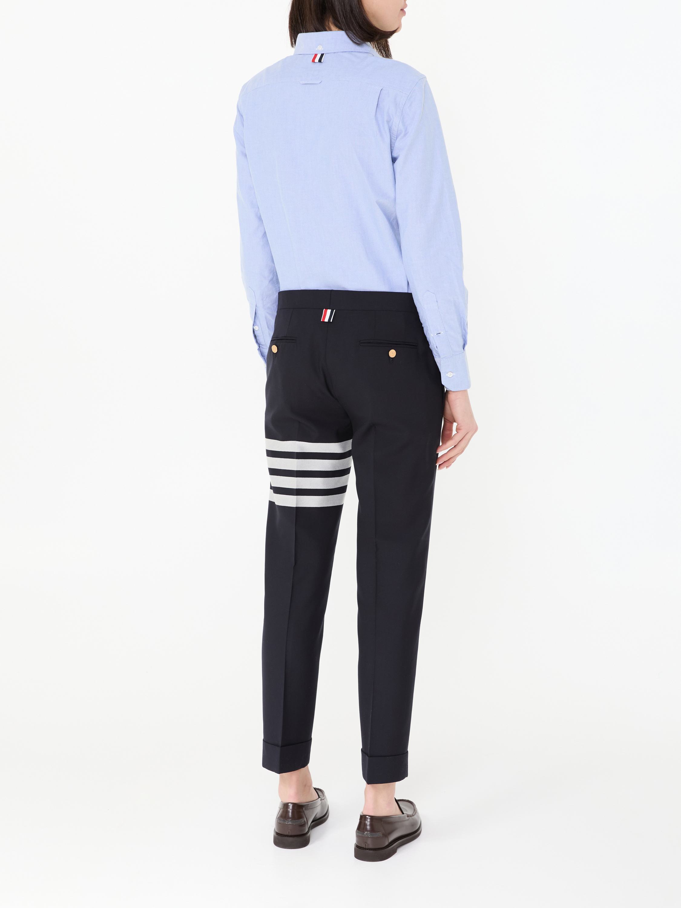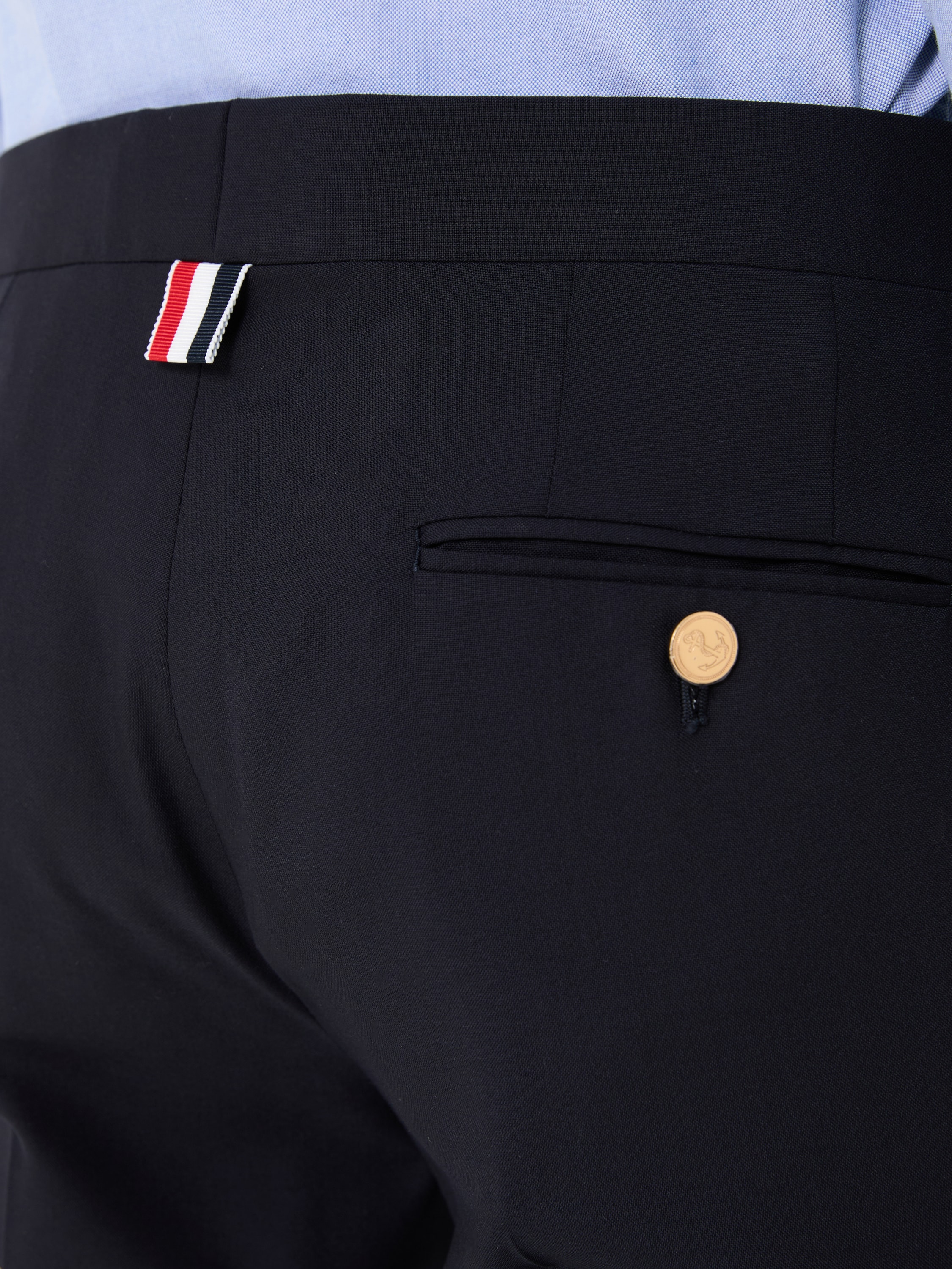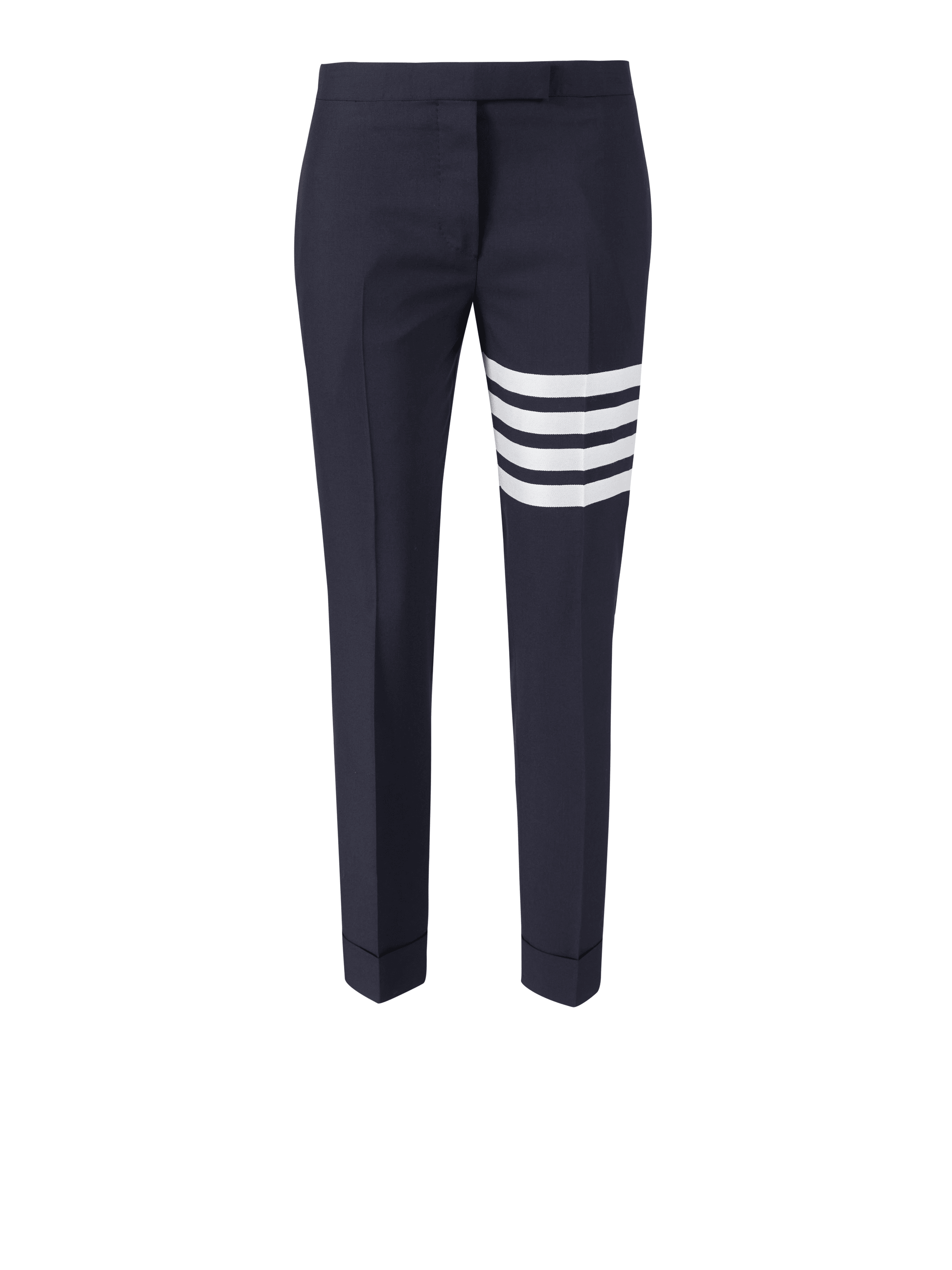 Diese Hose in Marineblau/Weiß von Thom Browne wurde aus hochwertiger Wolle gefertigt. Der klassisch verkürzte Saum ist eine Hommage an Thom Brownes herausragender Schneiderkunst und die Low-Rise-Silhouette perfektioniert das moderne Design.