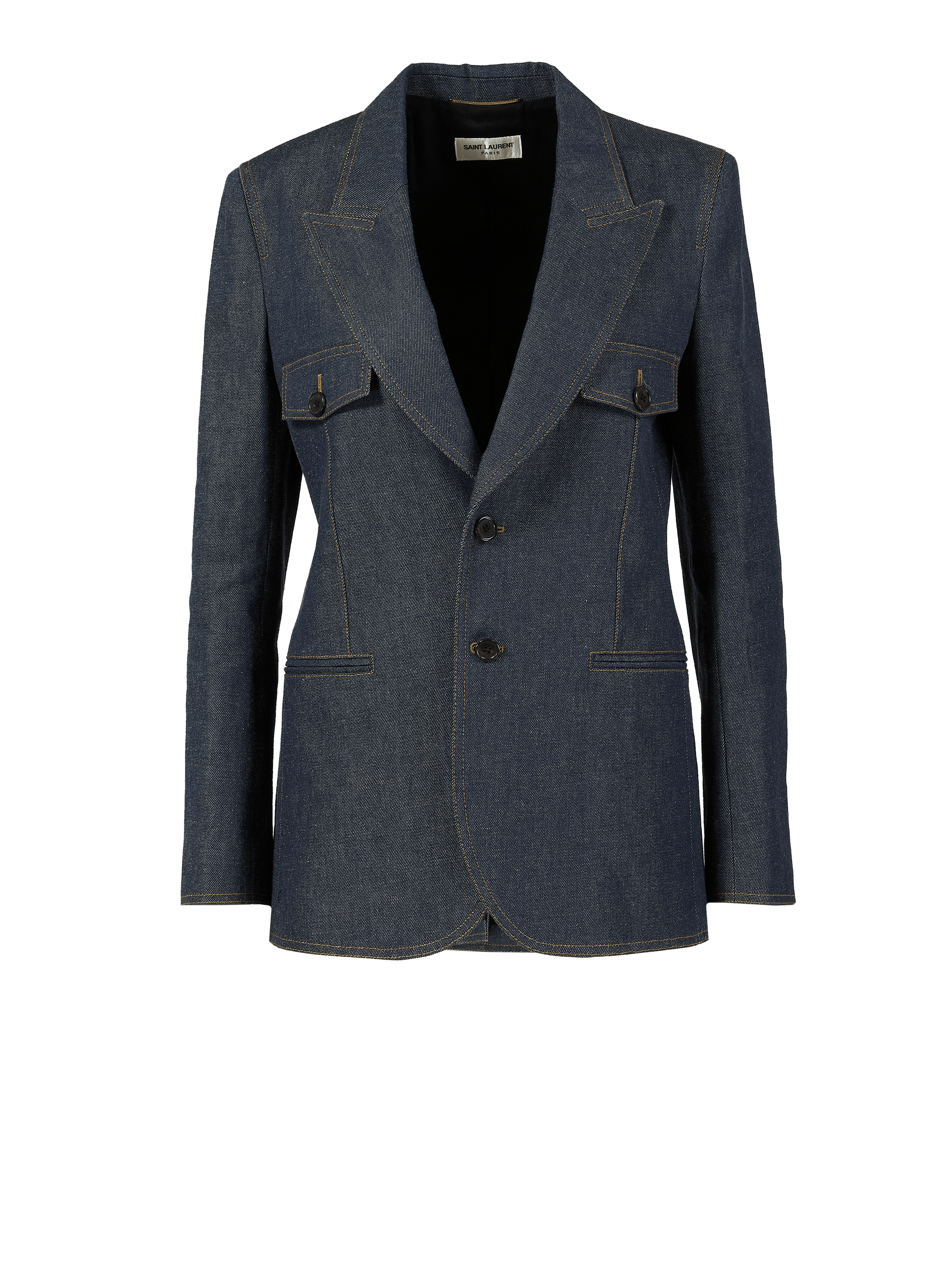 Dieser Blazer in Blau von Saint Laurent wurde aus reiner Baumwolle gefertigt und besticht durch die elegante Passform mit kontrastreichen Nähten. Der aufsteigende Reverskragen, die Knopfleiste und die aufgesetzten Paspeltaschen zeichnen dieses elegante Modell aus.
