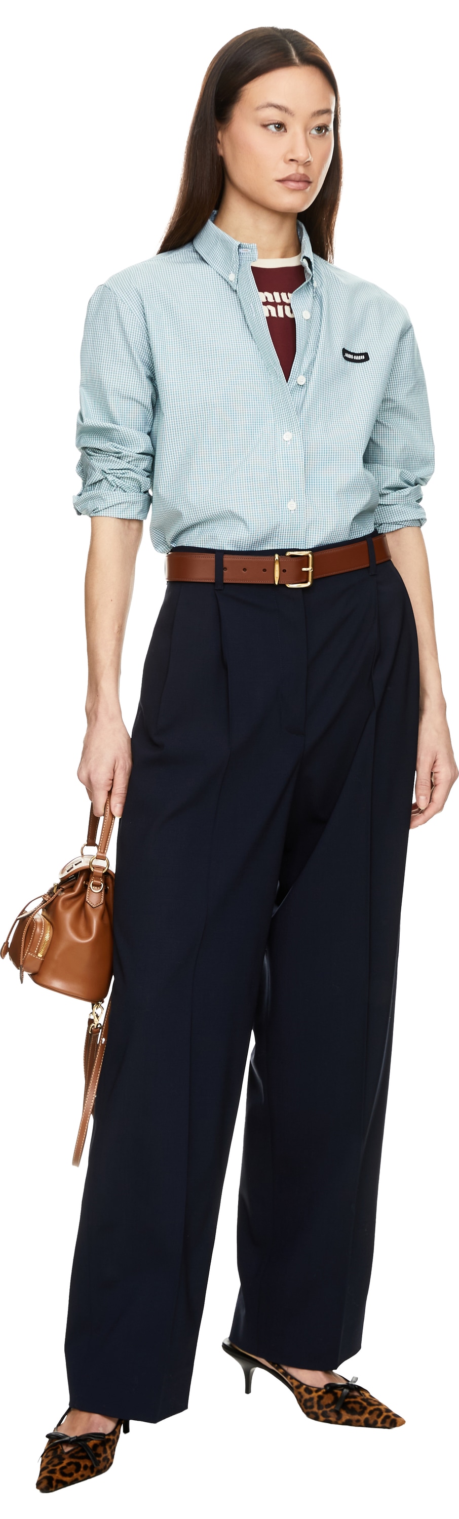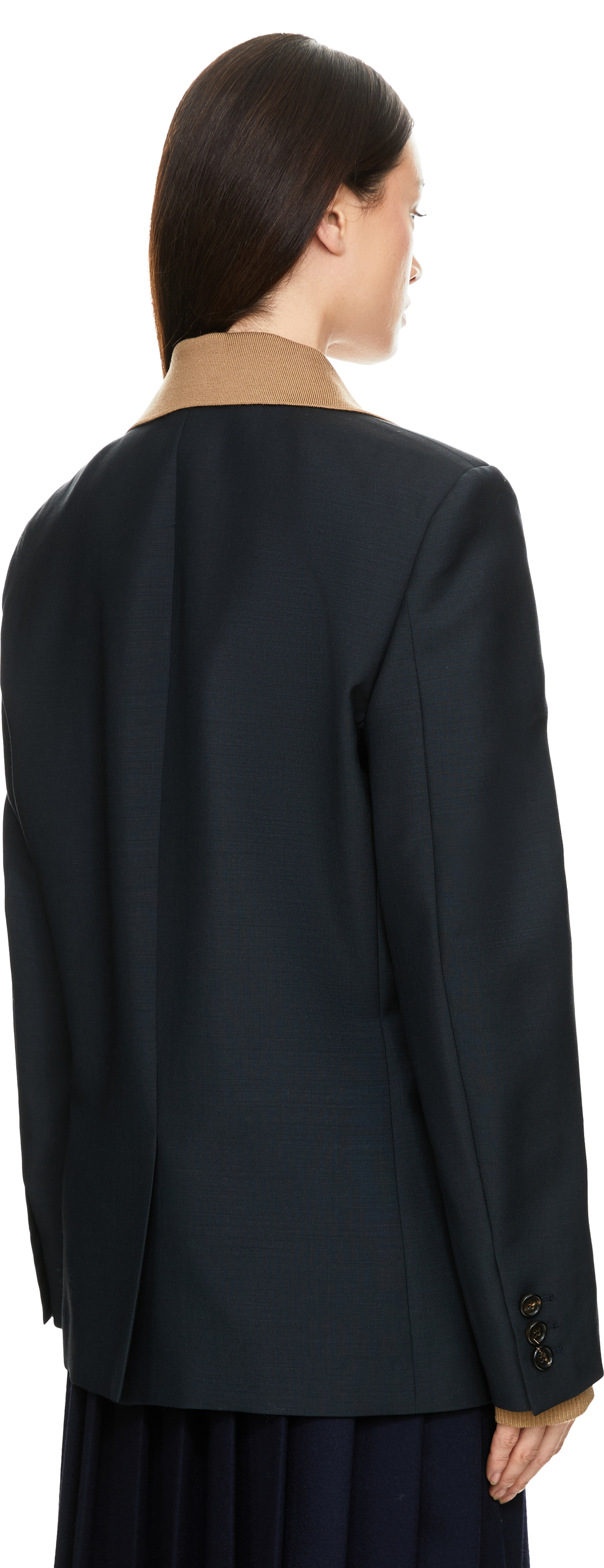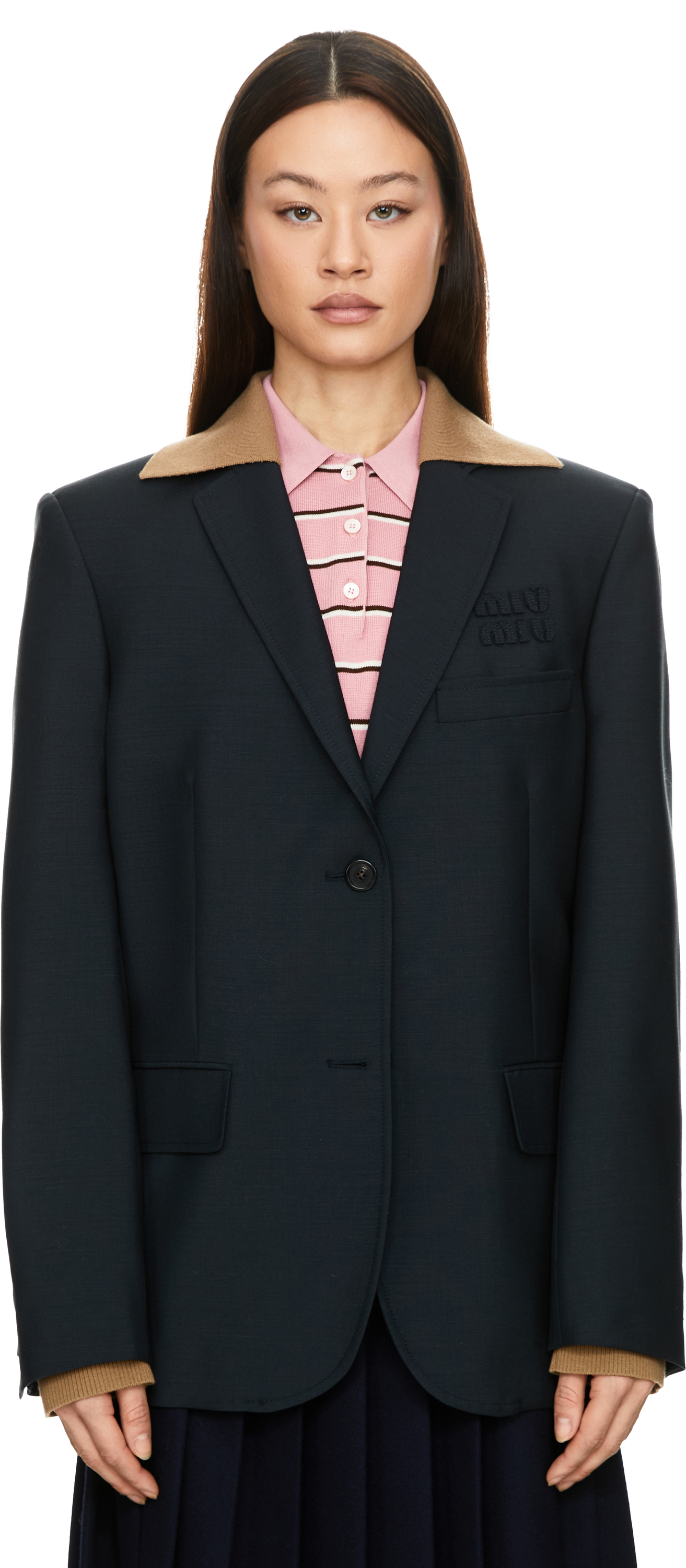 Dieser Blazer in Marineblau von miu miu wurde aus einer Wollmischung gefertigt und besticht durch die gerade Silhouette. Der klassische Reverskragen, die Knopfleiste auf der Vorderseite, die geraden Ärmel mit drei Knöpfen sowie das Sticklogo zeichnen dieses hochwertige Modell aus.