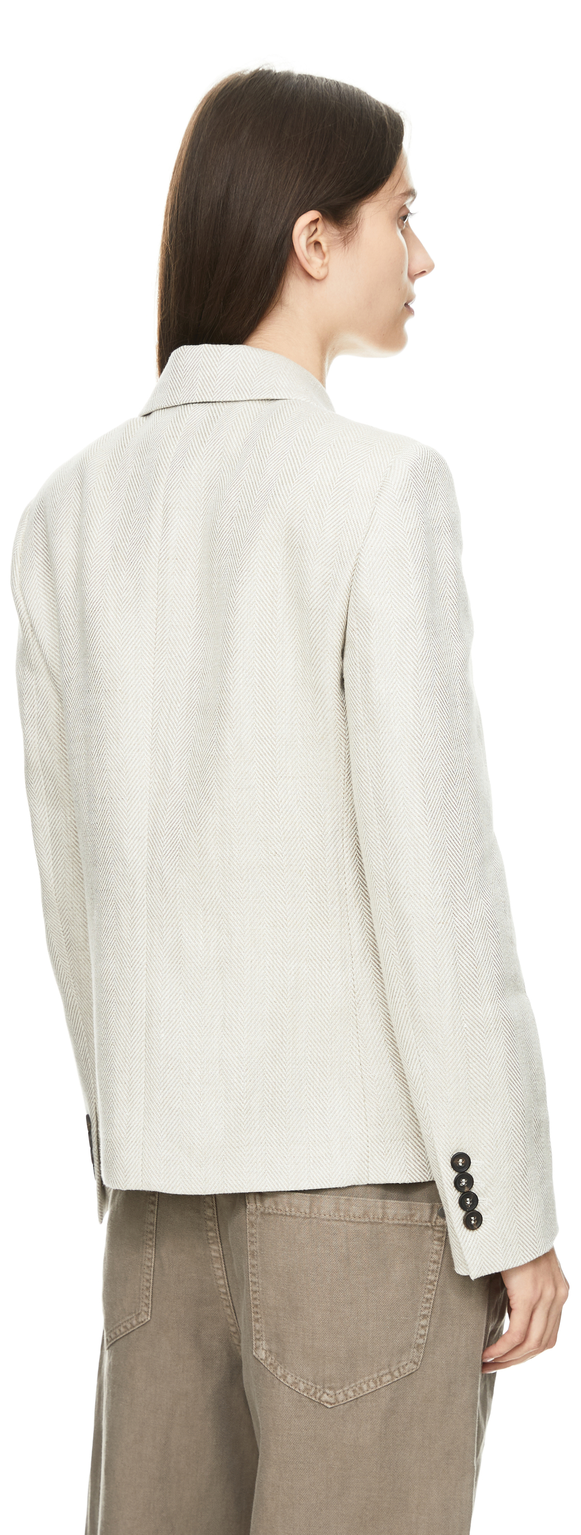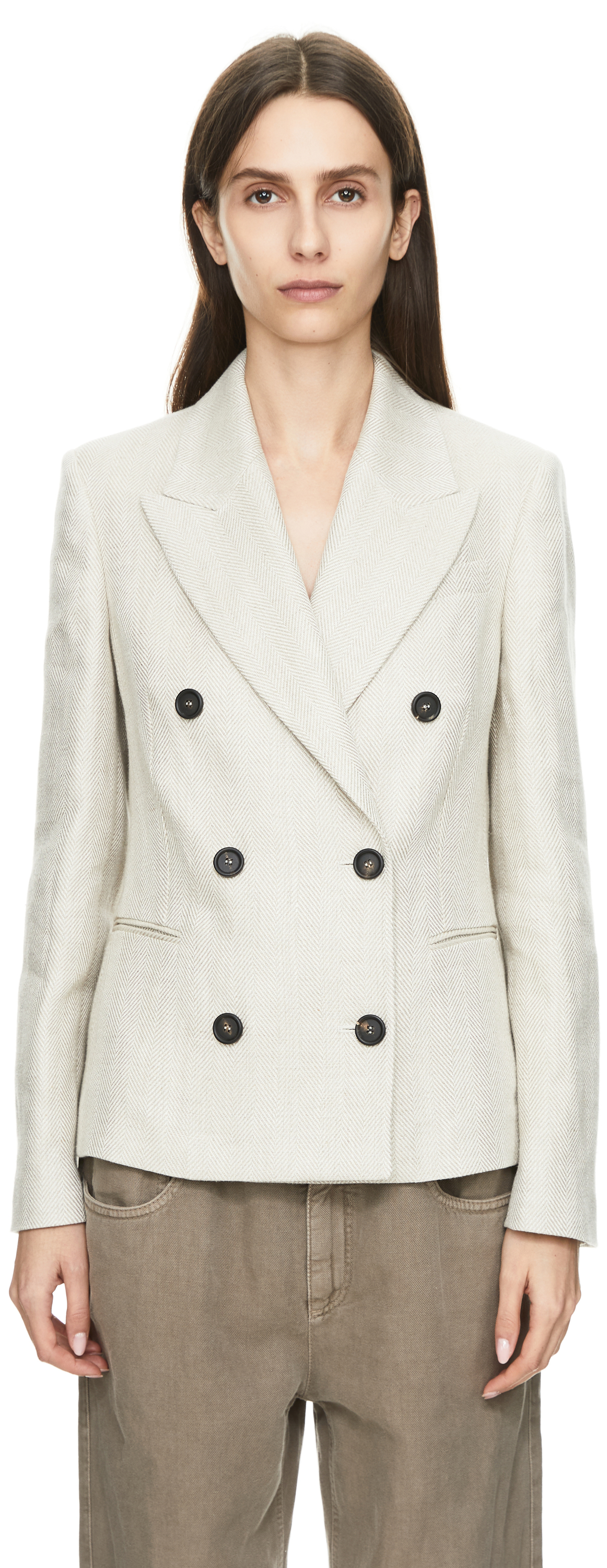 Dieser Blazer in Beige von Brunello Cucinelli wurde aus einer hochwertigen Leinenmischung gefertigt und besticht durch die strukturierte Optik und Haptik. Das Modell wird durch die doppelreihige Knopfleiste und die Paspeltaschen stilvoll ergänzt. Einen stimmigen Abschluss schaffen die Monili-Perlen am Nacken.