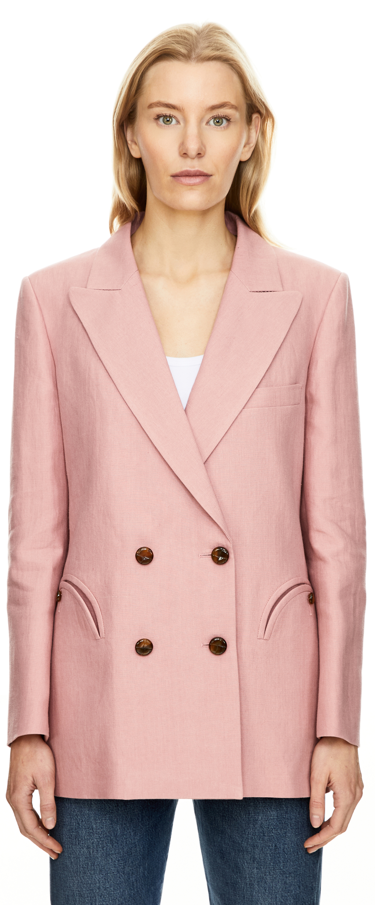 Der Blazer 'Midday Sun Everyday' in Rosé von Blazé Milano wurde aus reinem Leinen gefertigt und besticht durch den kastenförmigen Schnitt. Die zweireihige Knopfleiste, die leicht gepolsterten Schultern, das Spitzrevers sowie der doppelte Rückenschlitz verleihen dem Modell eine elegante Struktur. Abgerundet wird das Design durch die charakteristischen Smiley-Taschen.