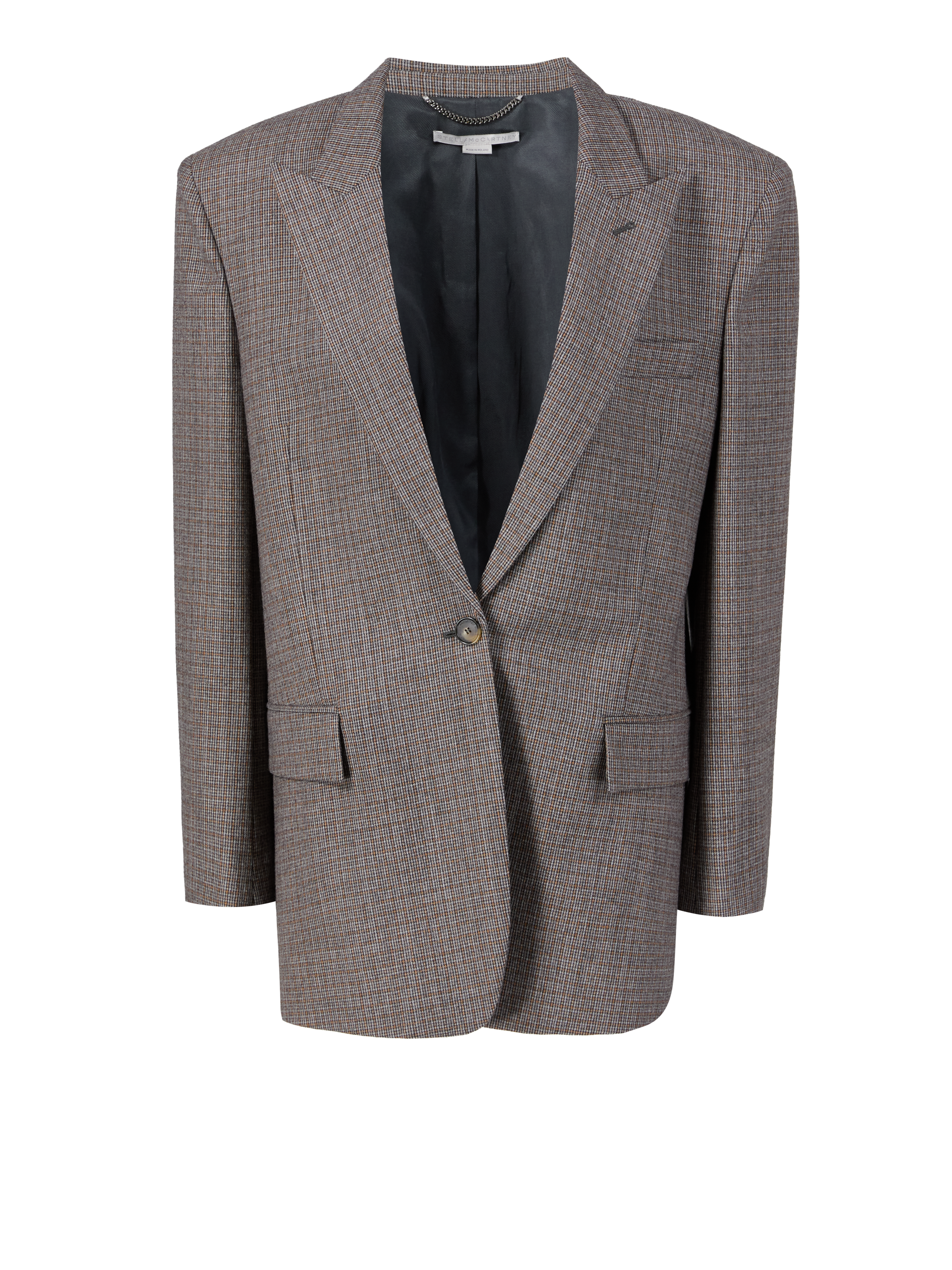 Dieser Blazer in Braun von Stella McCartney wurde aus hochwertiger Wolle gefertigt und besticht durch das Hahnentritt-Muster. Die oversized Passform, die Pattentaschen und der steigende Reverskragen zeichnen dieses hochwertige Modell aus.