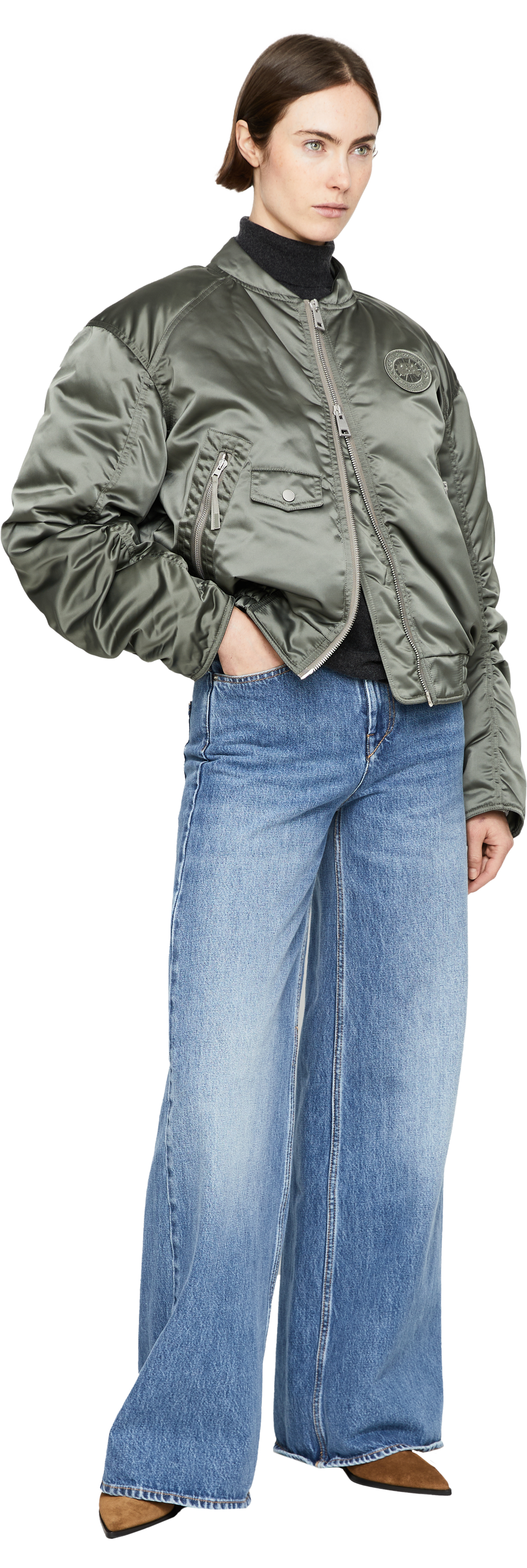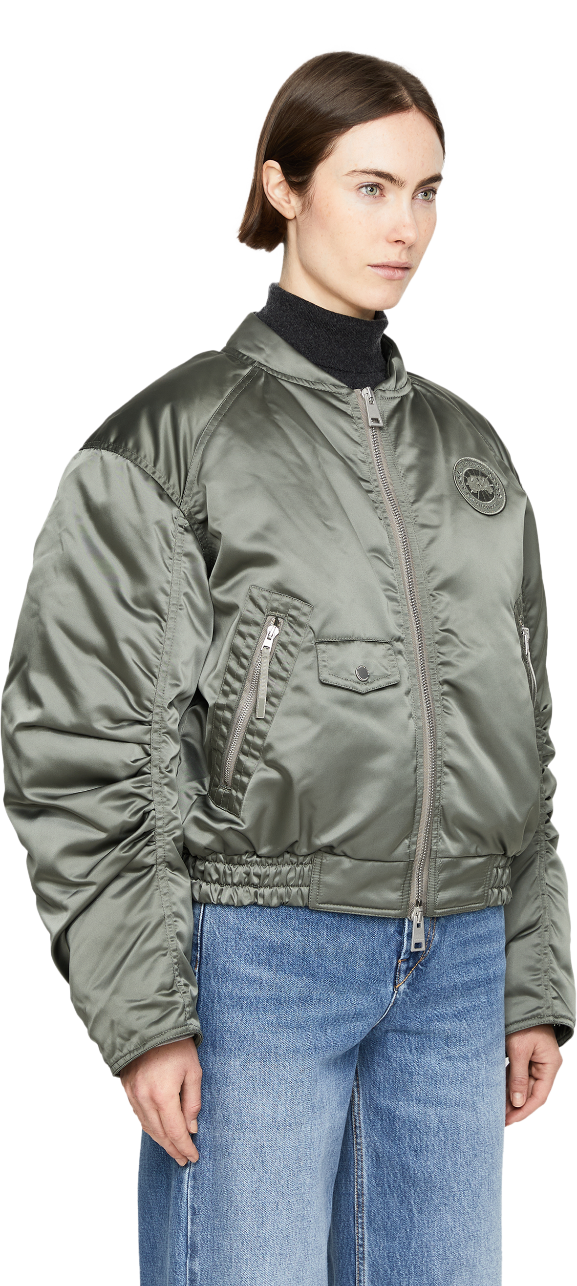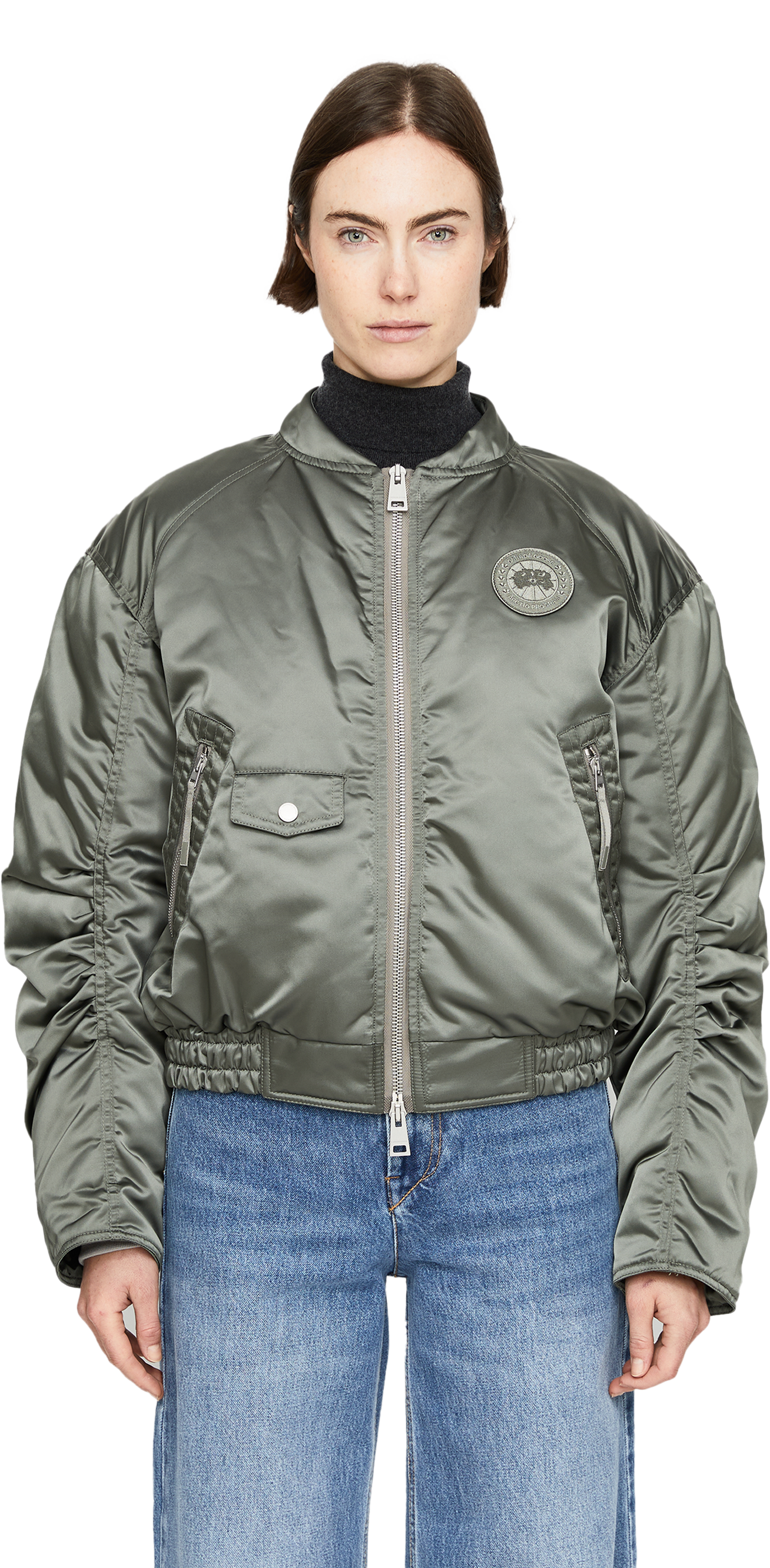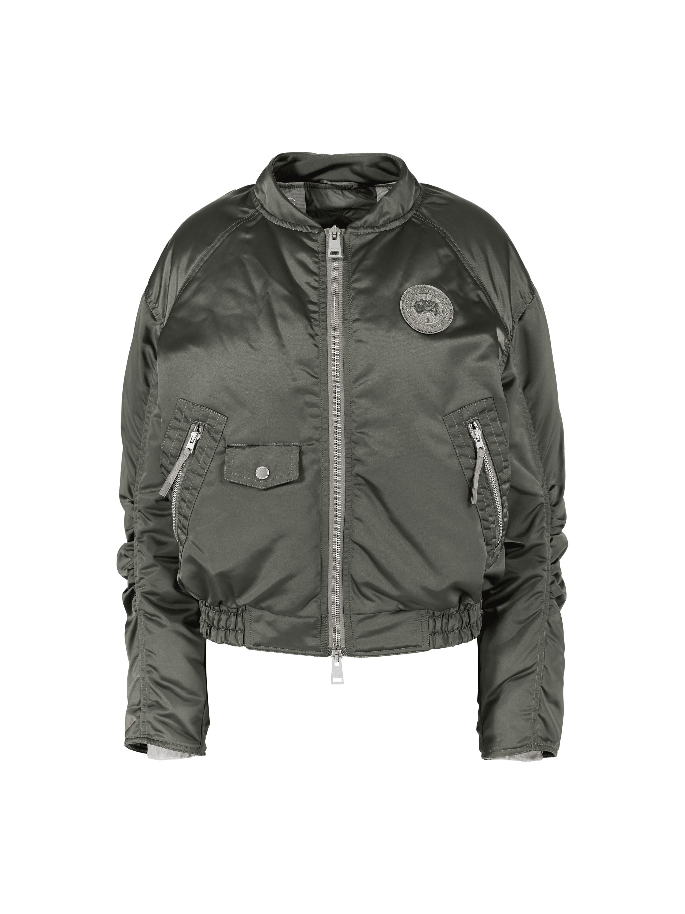 Die Bomberjacke 'Jade' in Khaki von Canada Goose wurde aus Nylongewebe gefertigt und besticht durch das geschmeidige Satin-Finish, das dem Piece einen eleganten Glanz verleiht. Die gerafften Ärmel, der Zwei-Wege-Reißverschluss und das Fleecefutter vervollständigen diesen modernen, lässigen Look.
