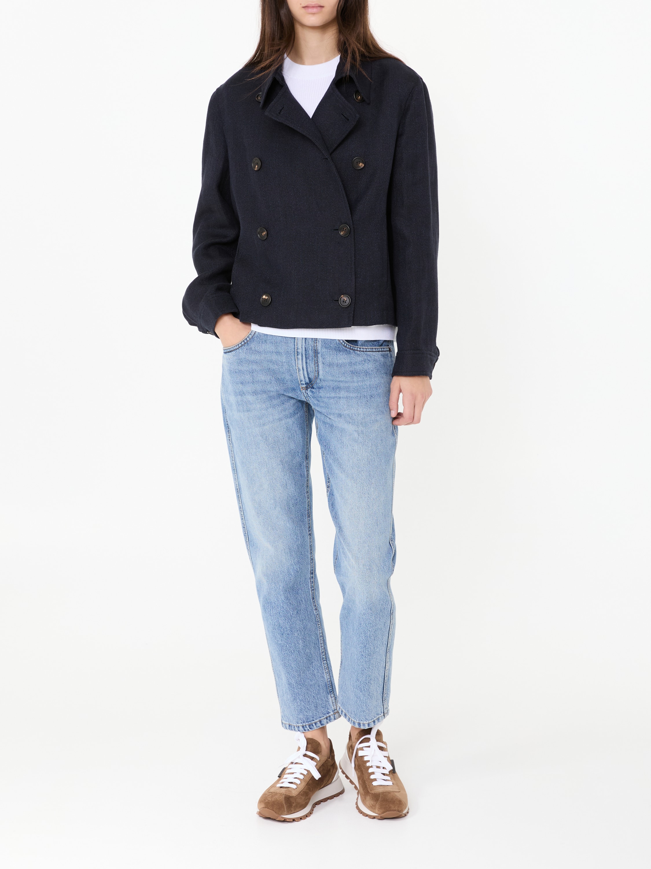 Diese Jacke in Marineblau von Brunello Cucinelli wurde aus Leinen gefertigt. Das Modell wird durch die doppelreihige Knopfleiste, die aufgesetzten Taschen und den abfallenden Reverskragen perfektioniert.