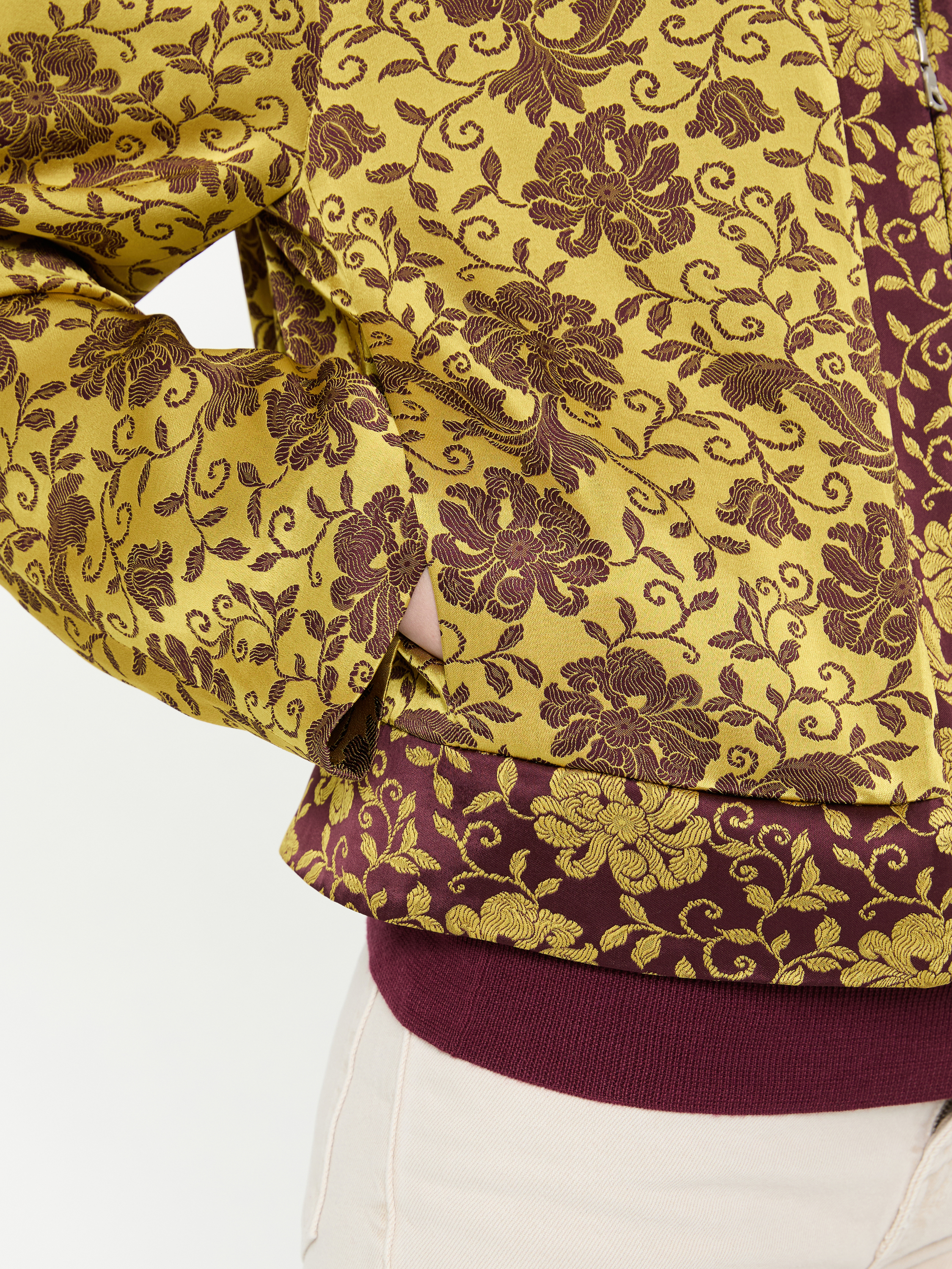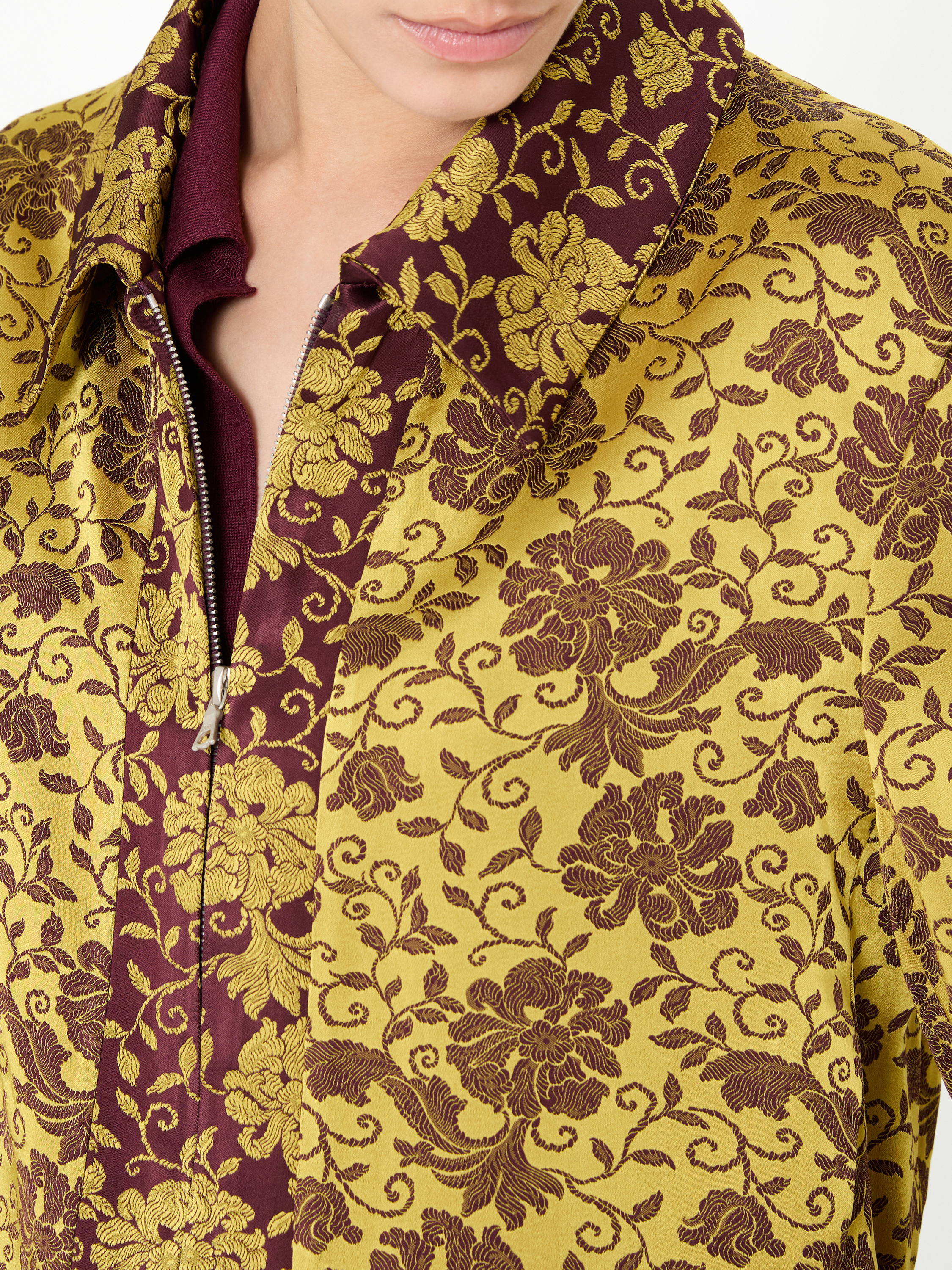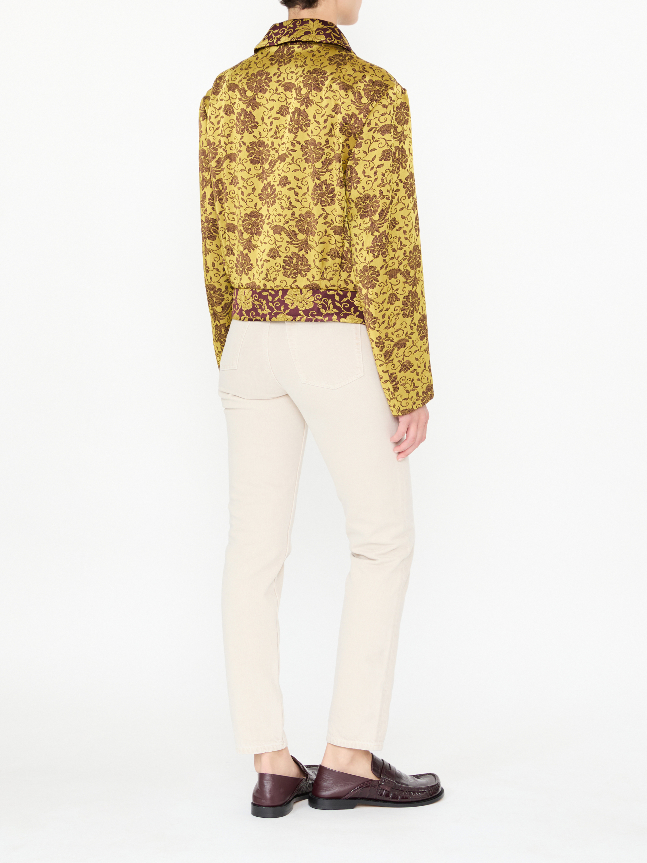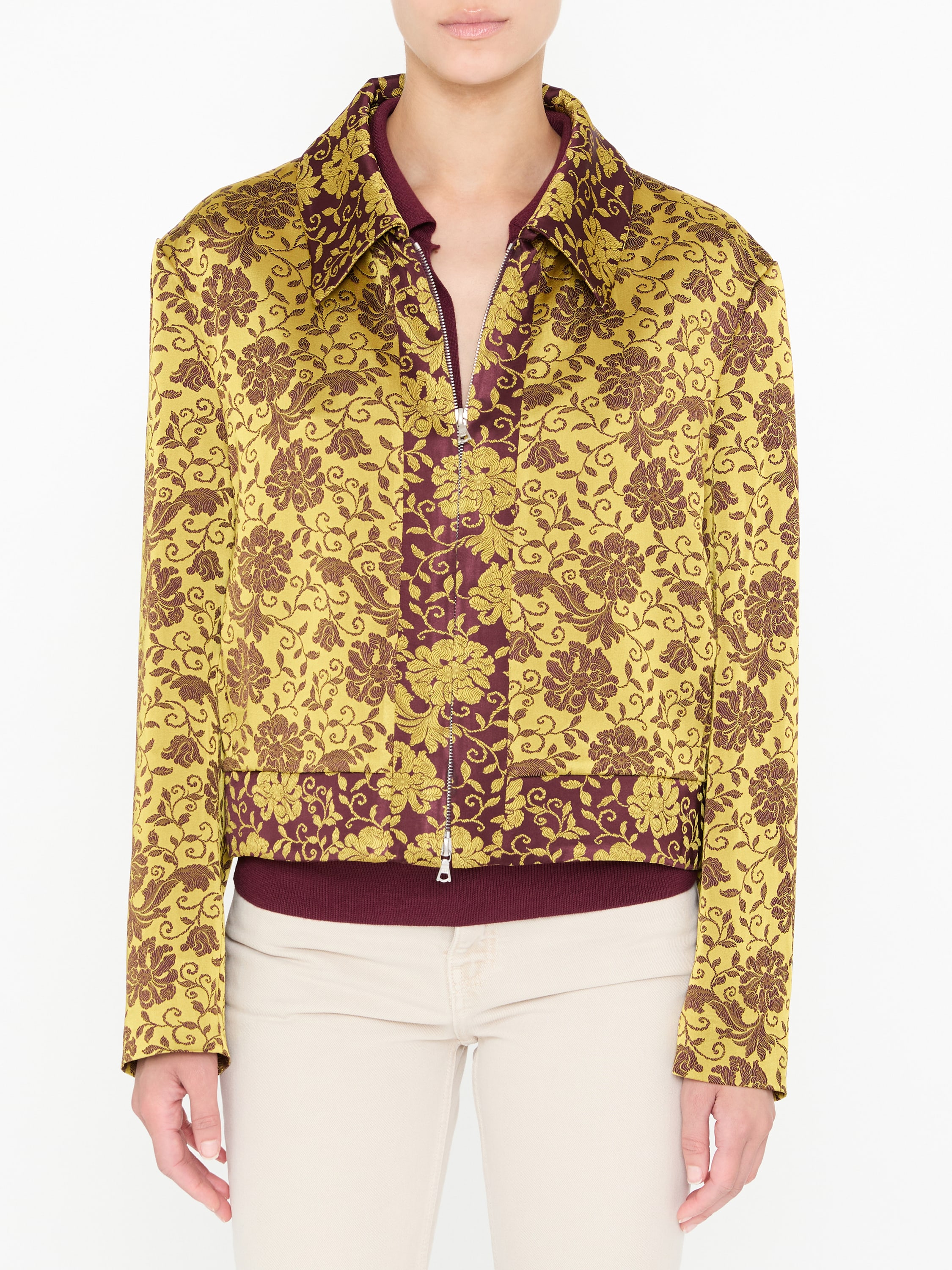 Die Blousonjacke 'Vurano' in Ocra von Dries van Noten wurde aus einer hochwertigen Materialmischung gefertigt und besticht durch den hochwertigen, glänzenden Jacquard. Die kastige Silhouette und der verdeckte Reißverschluss zeichnen dieses sommerliche Modell aus.