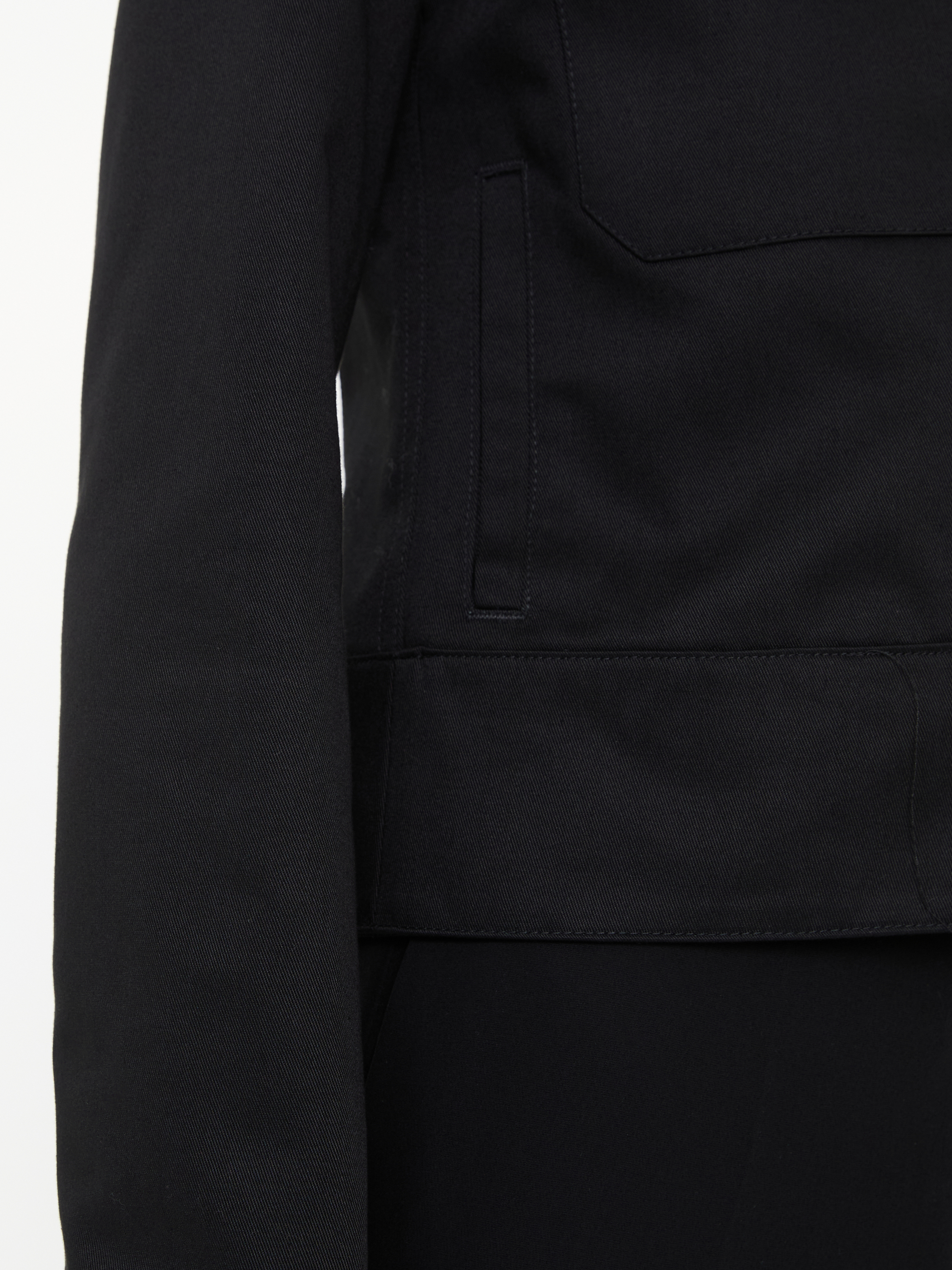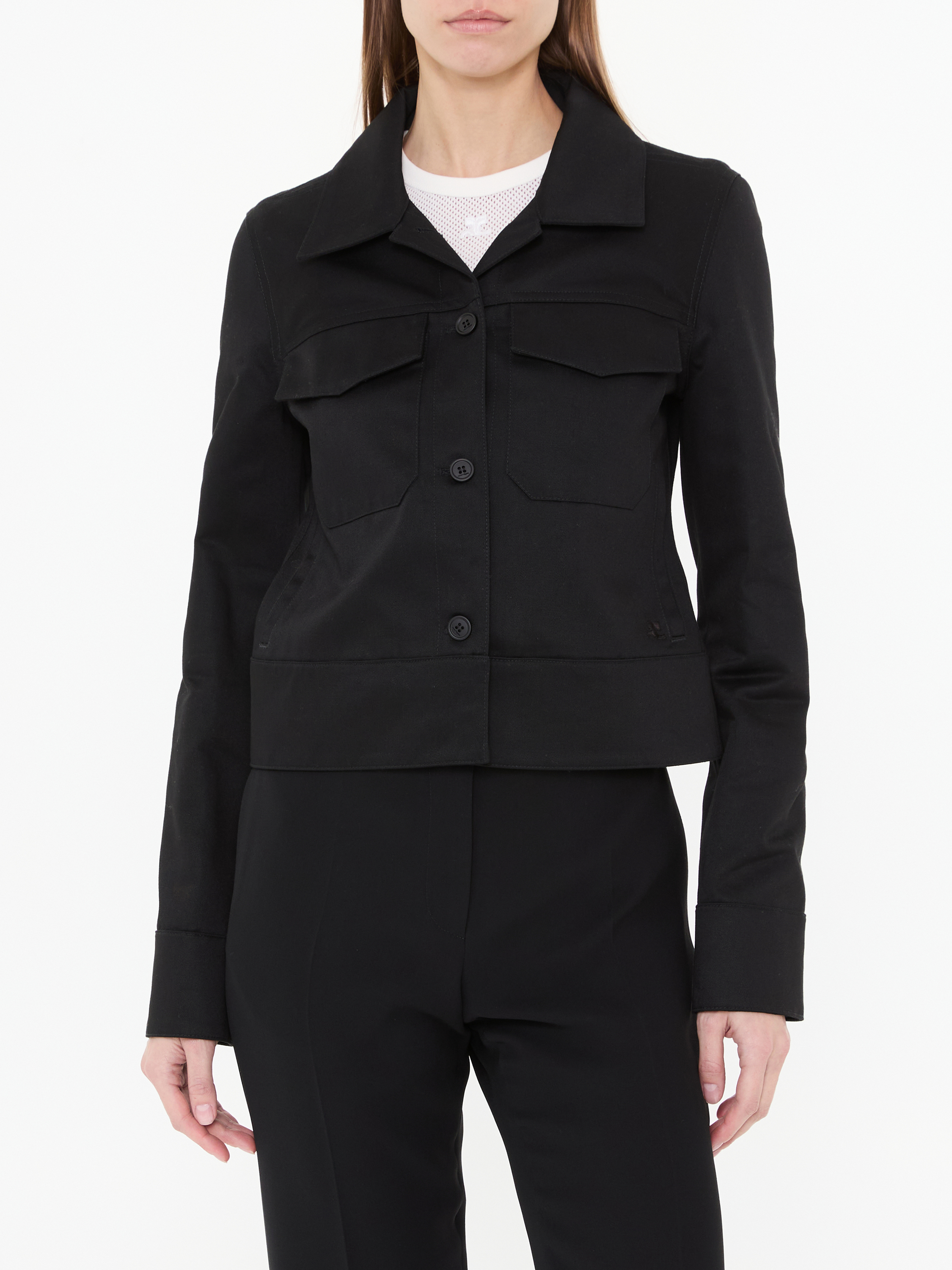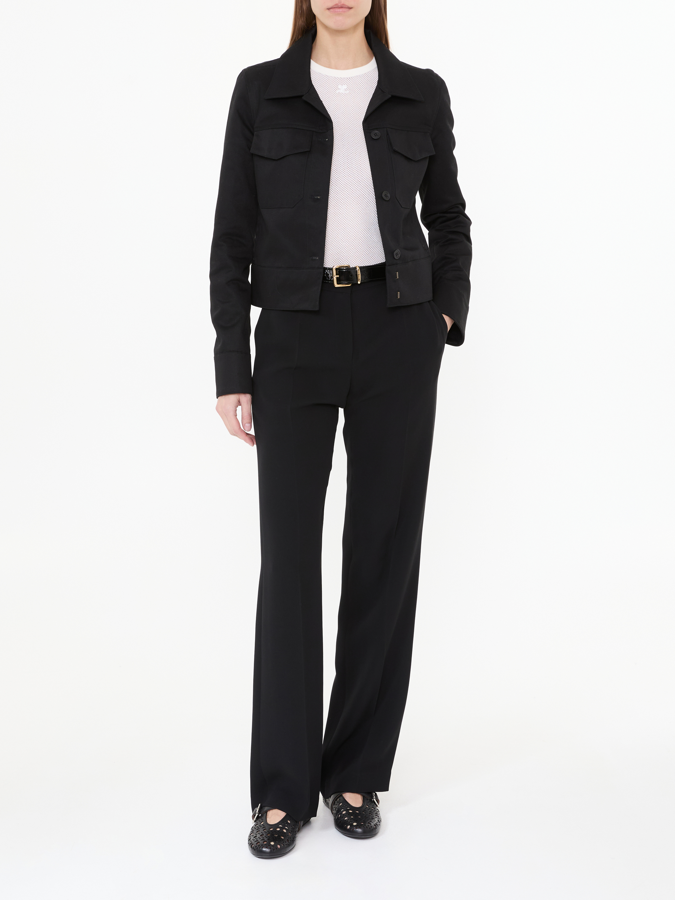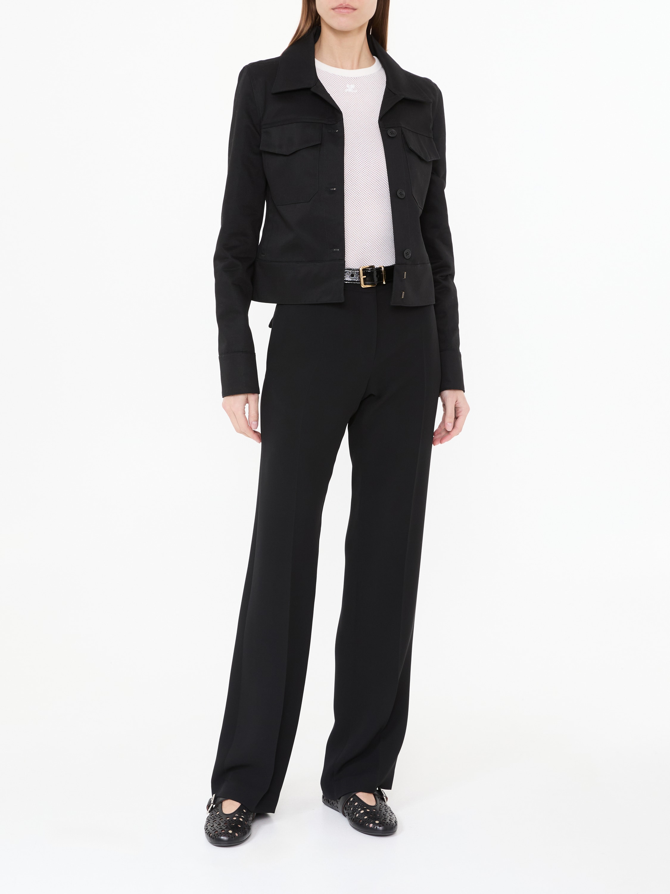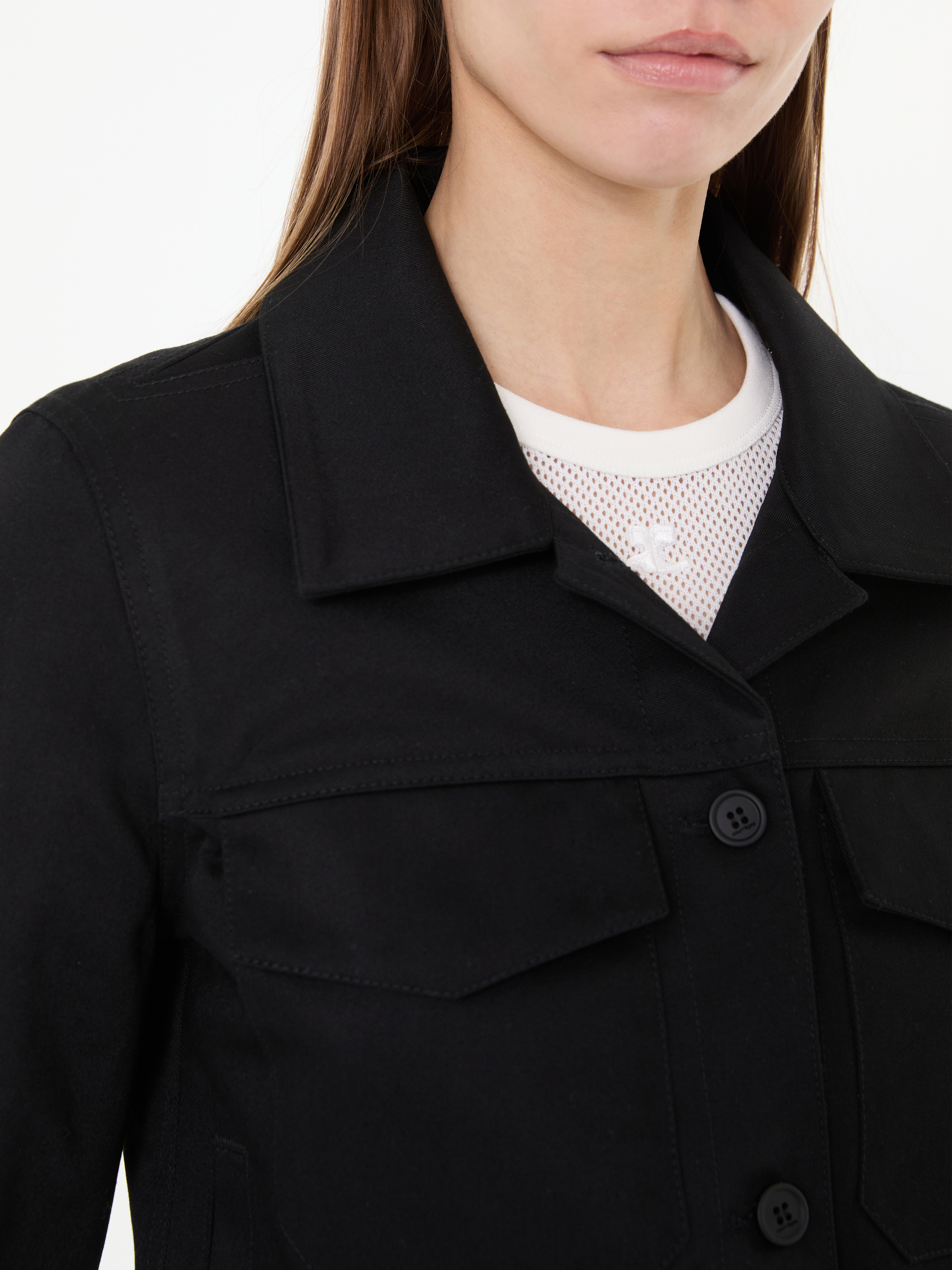 Diese Trucker-Jacke in Schwarz von courrèges wurde aus einer Materialmischung gefertigt und besticht durch das klassische Design. Zwei aufgesetzte Brusttaschen und zwei paspelierte Seitentaschen zeichnen dieses Modell aus.