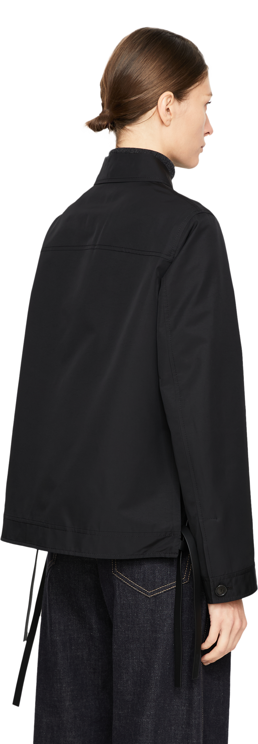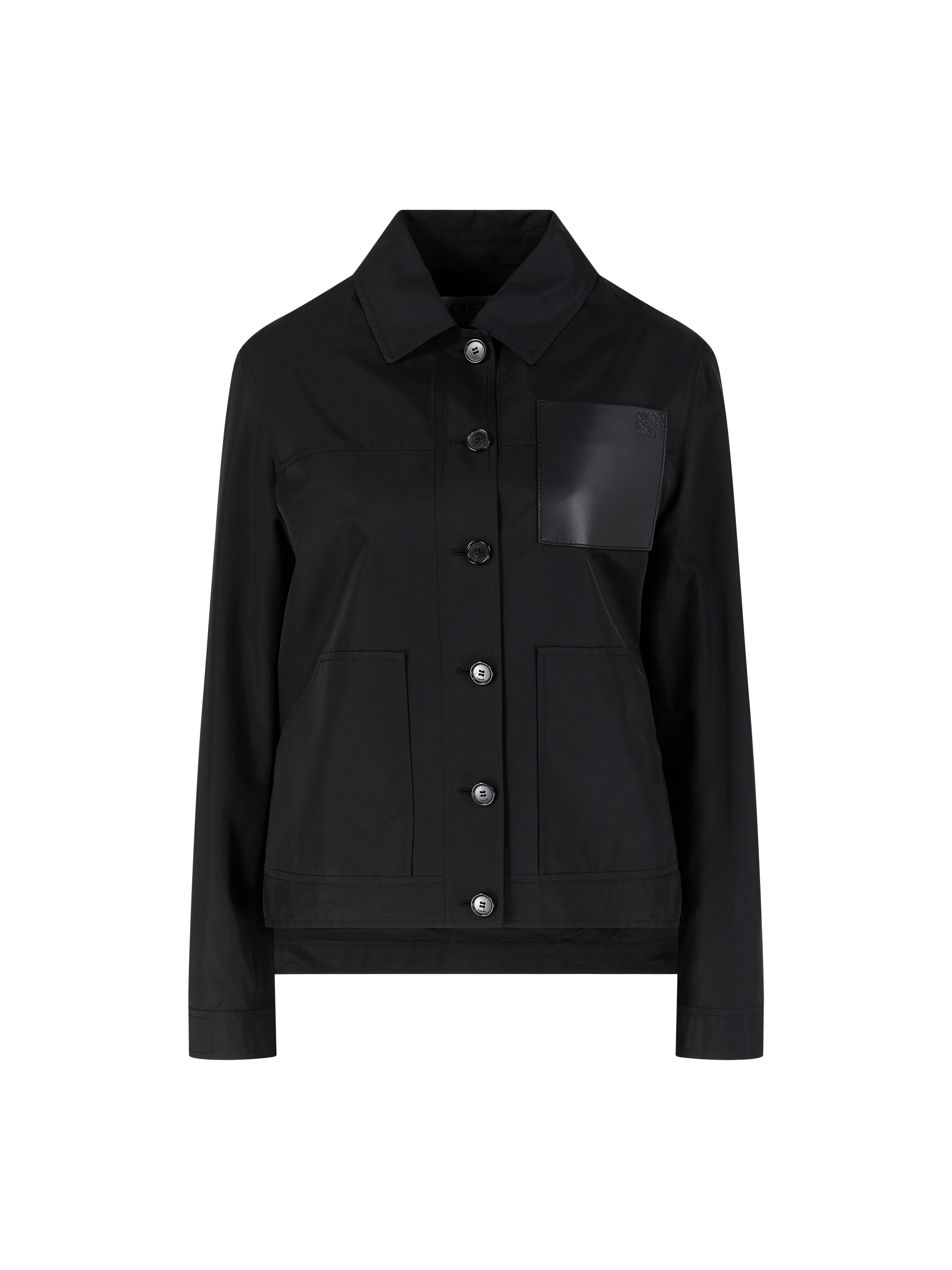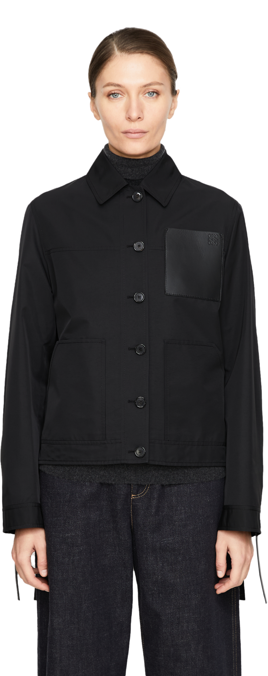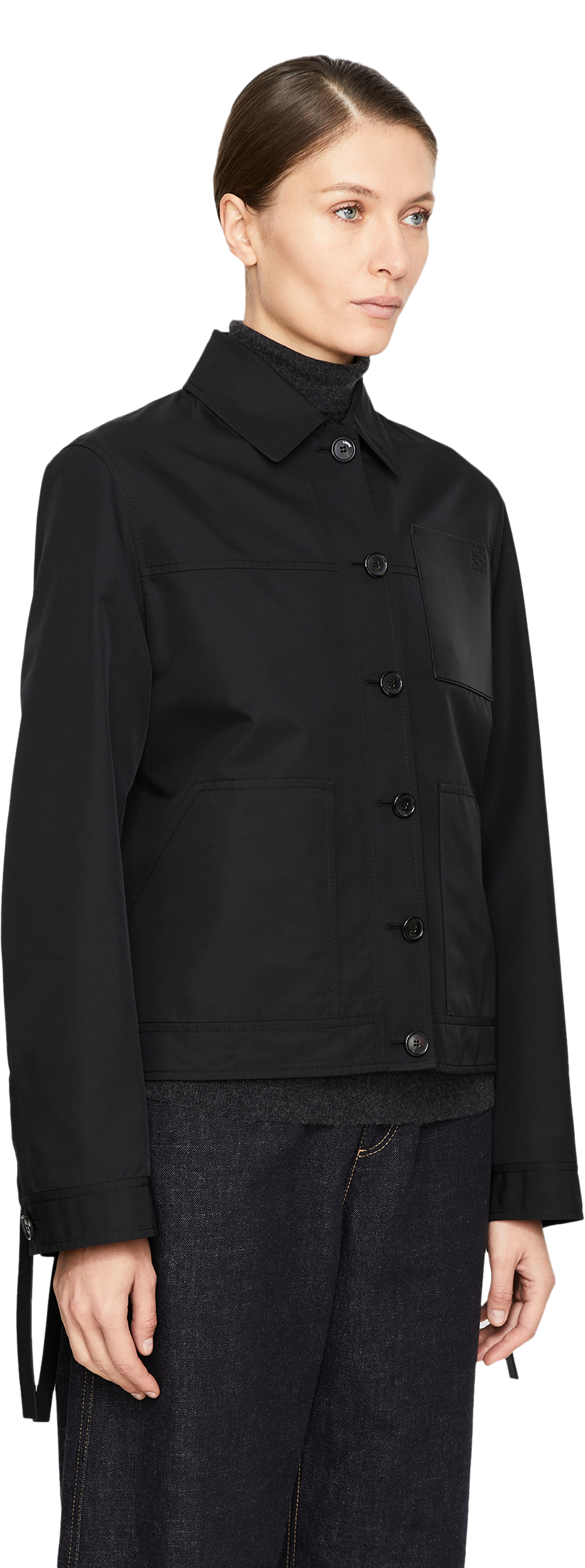Diese Jacke in Schwarz von LOEWE wurde aus einer Materialmischung gefertigt und besticht durch die entspannte Passform. Der asymmetrische Saum und die Bänder an den Seiten, der klassische Kragen, die aufgesetzten Taschen und die LOEWE-Ledertasche mit Anagramm-Prägung auf der Brust zeichnen dieses Modell aus.