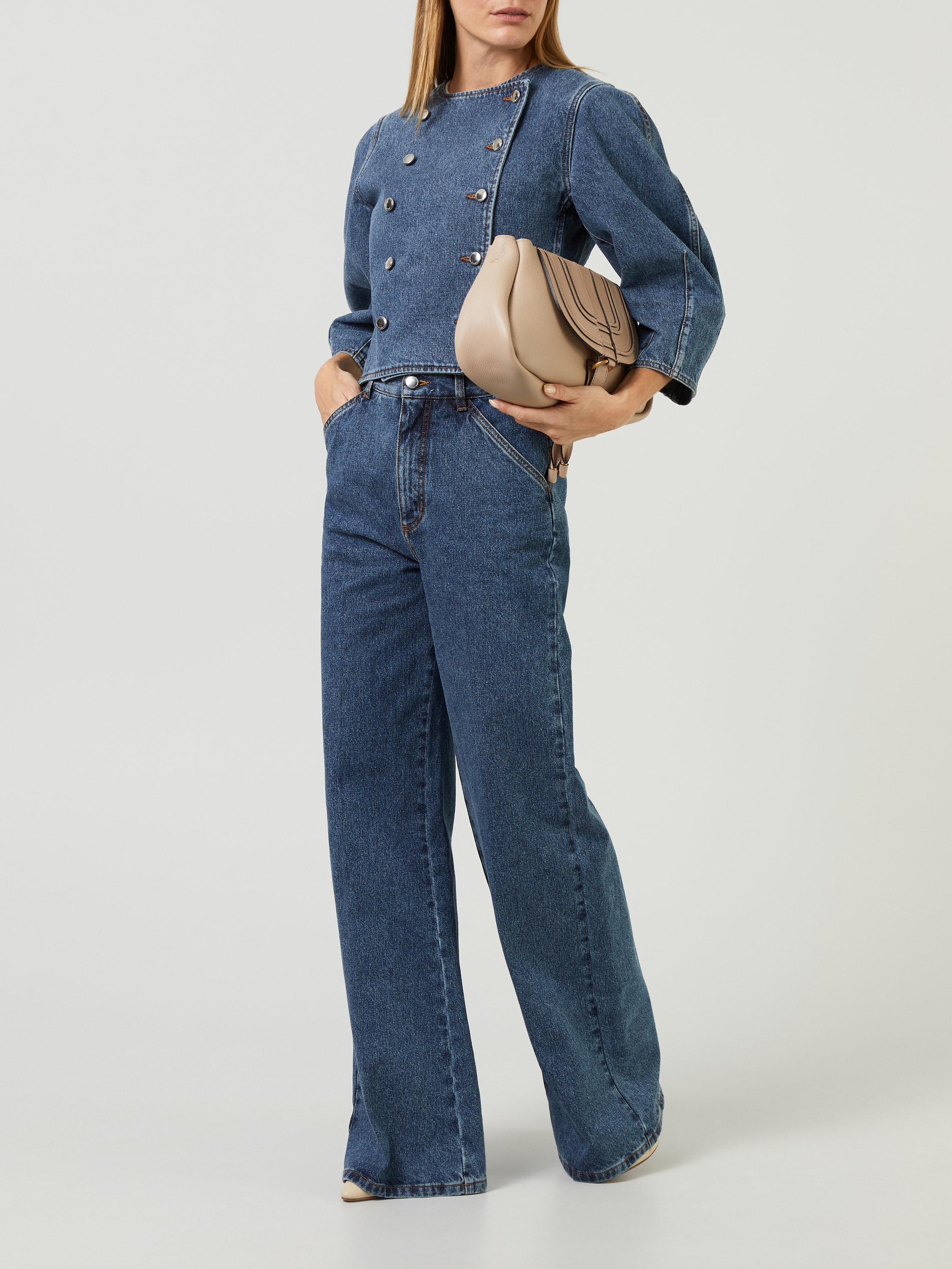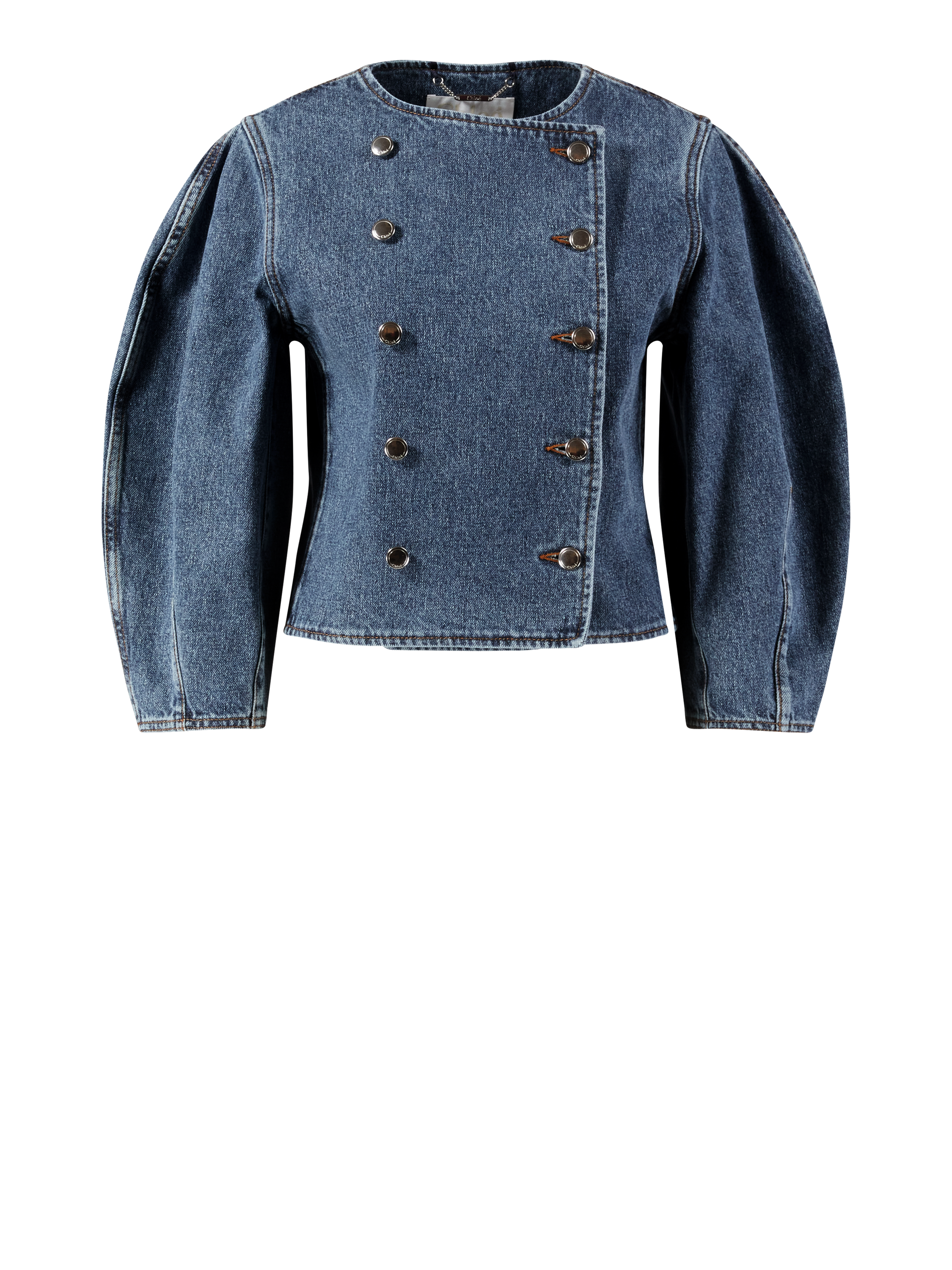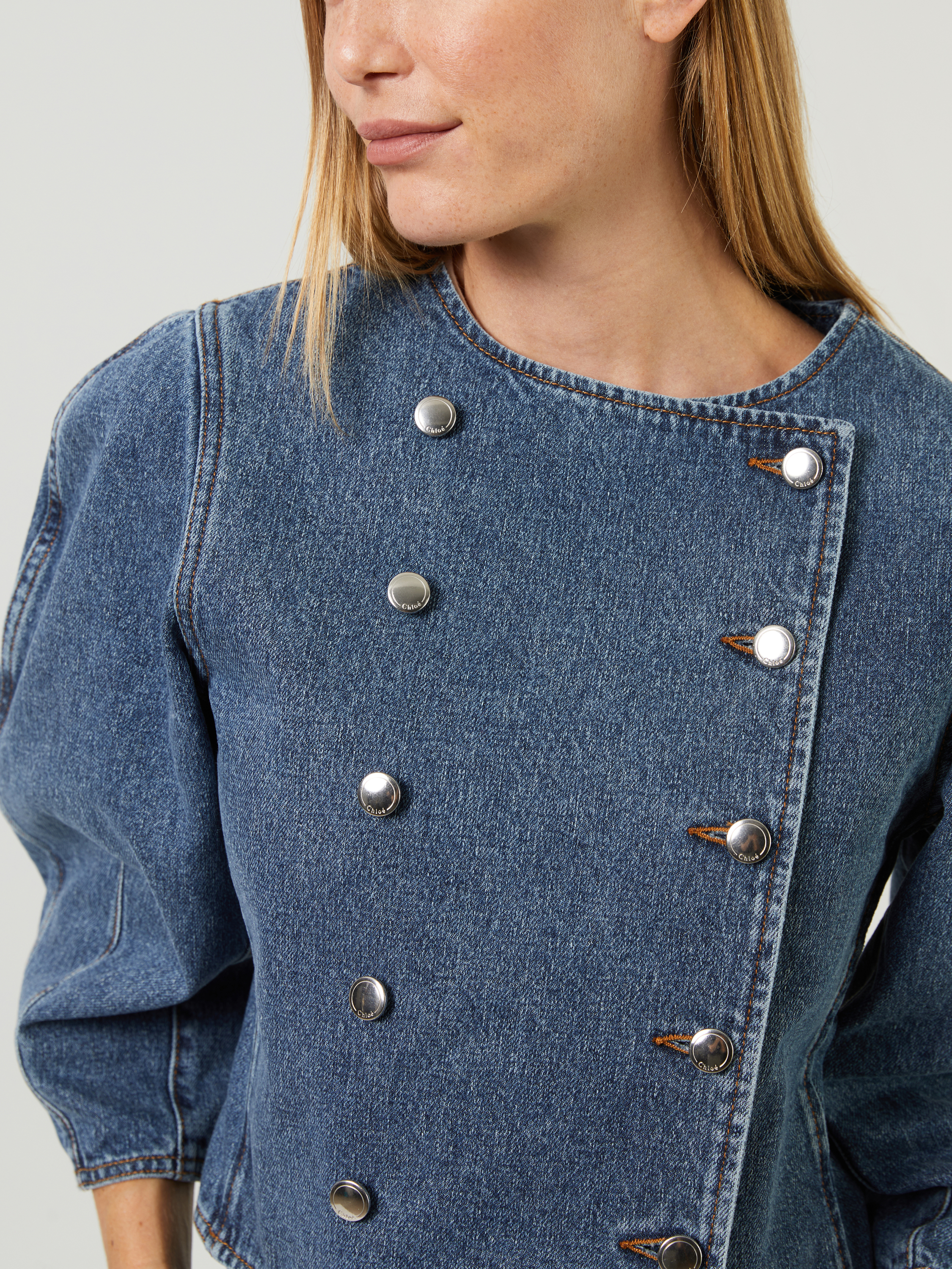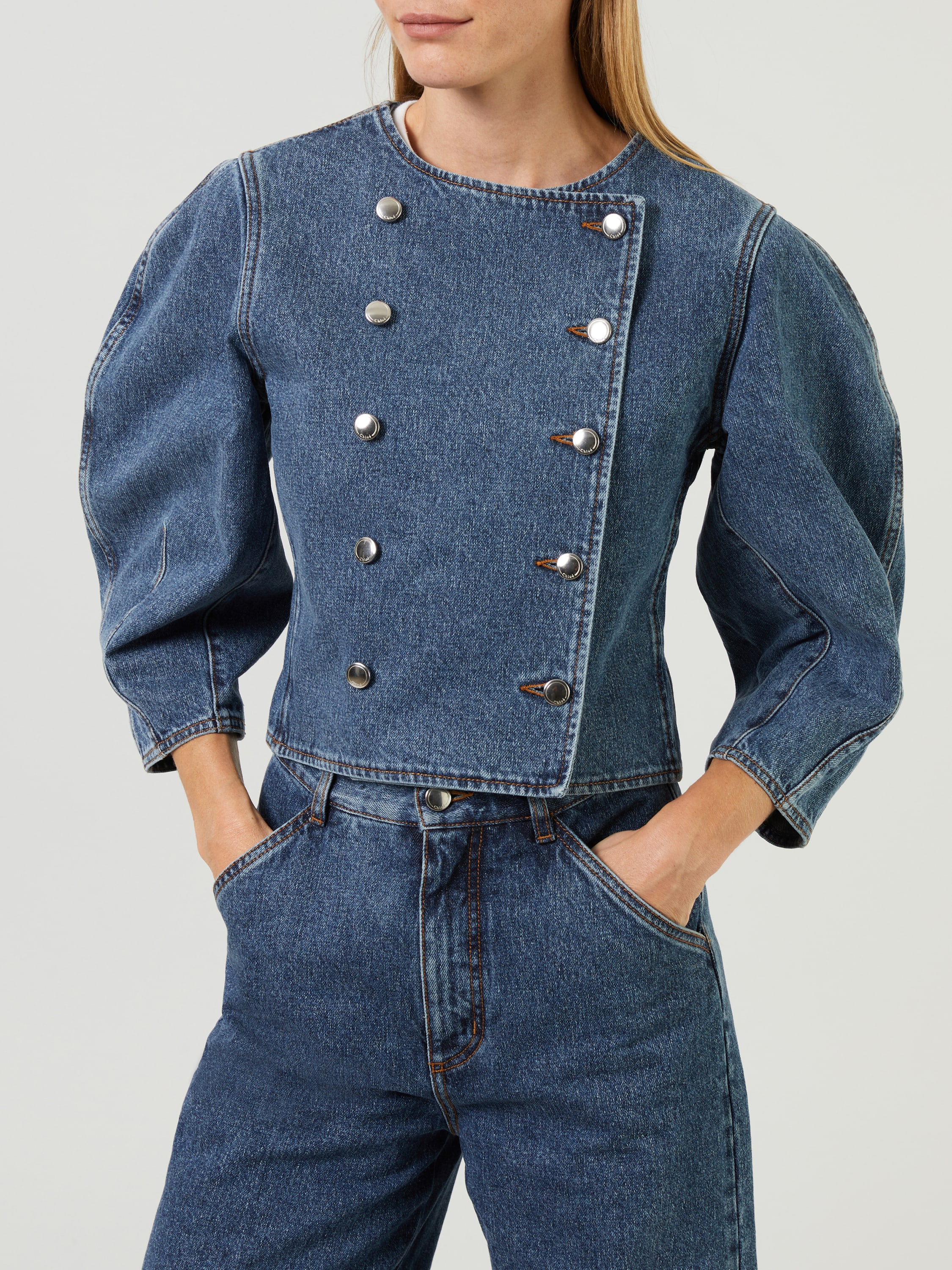 Diese Jeansjacke in Blau von Chloé wurde aus einem Baumwollgemisch gefertigt und besticht durch eine feste Haptik. Die verkürzte Passform akzentuiert die weibliche Silhouette und wird durch die doppelreihige Knopfleiste ergänzt. Die Ballonärmel perfektioniert das Design.