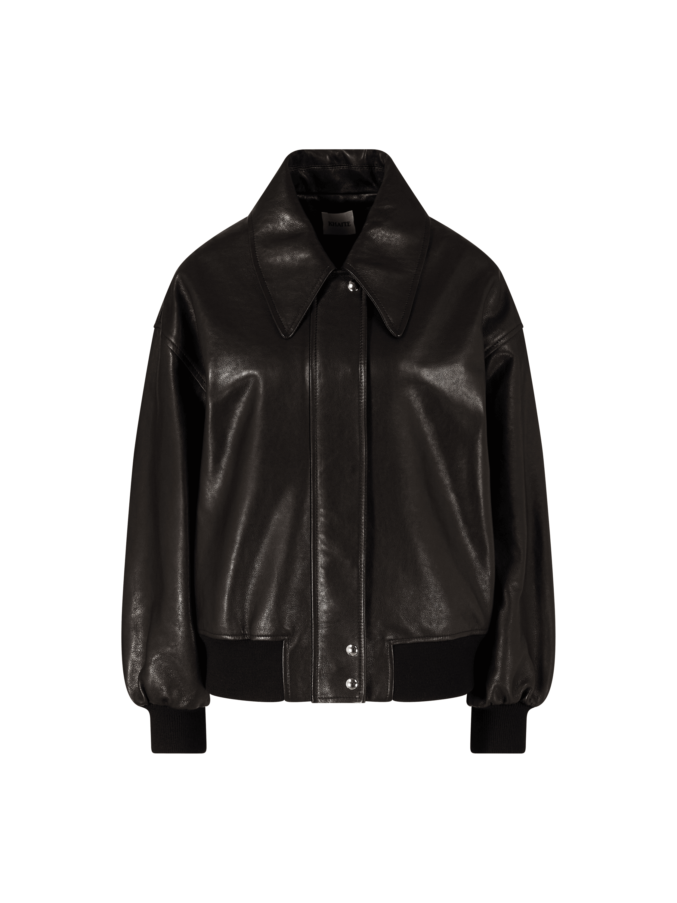Die Lederjacke 'Shelman' in Schwarz von Khaite wurde aus hochwertigem Lammleder gefertigt. Das Modell verfügt über einen verdeckten Druckknopf- sowie Reißverschluss auf der Vorderseite. Die seitlichen Eingrifftaschen, der spitz anliegende Kragen und die tiefen Schultern runden das Design stilvoll ab.